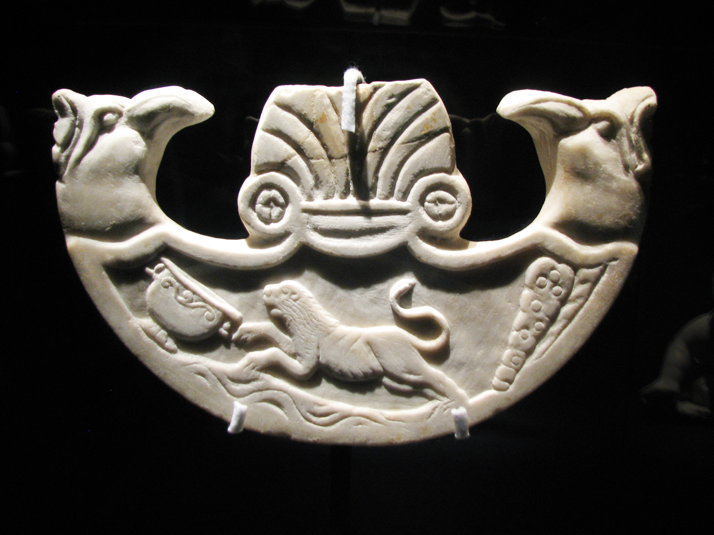 (From the info card):"Carved from marble, oscilla were architectural decorations that were suspended between columns in the peristyle. The half moon marble shield was carved on both sides and mounted with pins through the middle, so it was free to move with the breeze. Flanked by griffin heads, one side shows two tragic theater masks, the other depicts a pouncing lion." My photo shows the pouncing lion. Patrick Bowe explains further: Oscilli and Pinakes: "Decorative stone panels sculpted in low relief and sometimes painted were used to decorated gardens. There were two types, the oscillum and the pinax. "An oscillum was a small marble panel carved in low relief both on the front and the back with a variety of images and motifs. It was light enough to be suspended on a chain from an overhead beam and was frequently hung between the columns of a garden colonnade or a portico, where it would oscillate in a breeze, hence its name. The shape of such a low-relief panel was usually rectangular or round. Some panels were in the shape of a pelta, a traditional shield made of animal skin said to have been used by the mythical femal warriors known as Amazons." (Gardens of the Roman World, Getty Museum Publications, 2004, page 38)