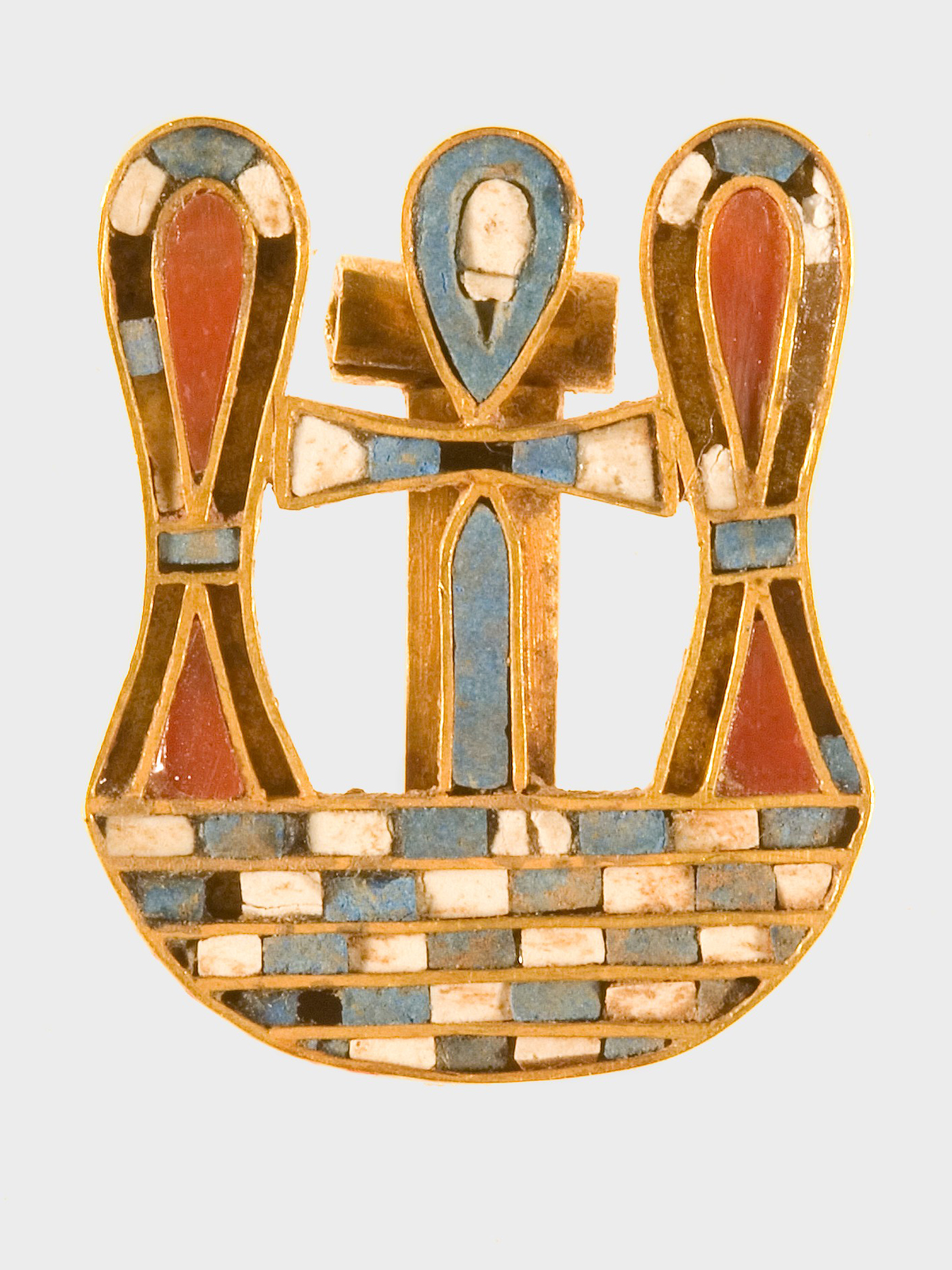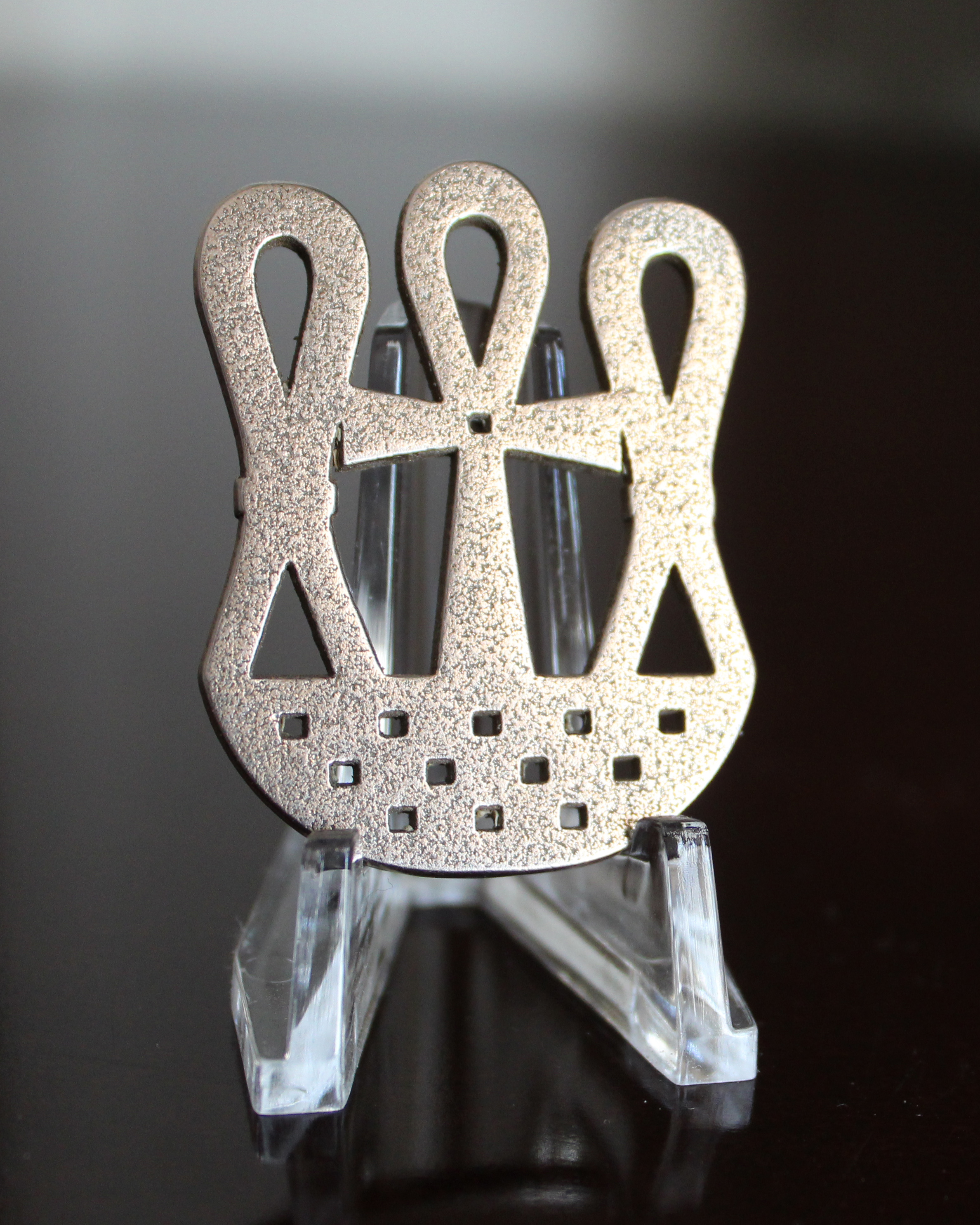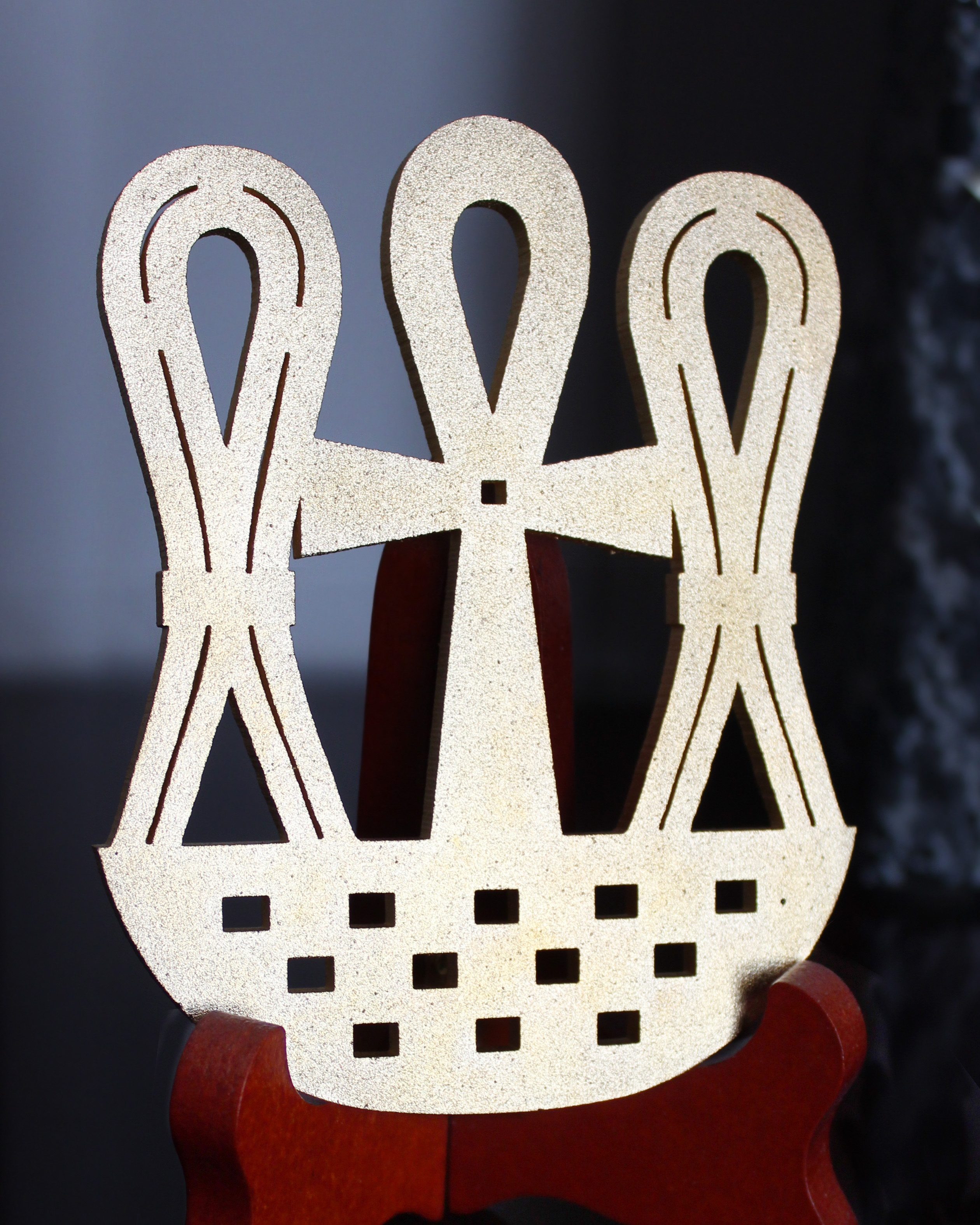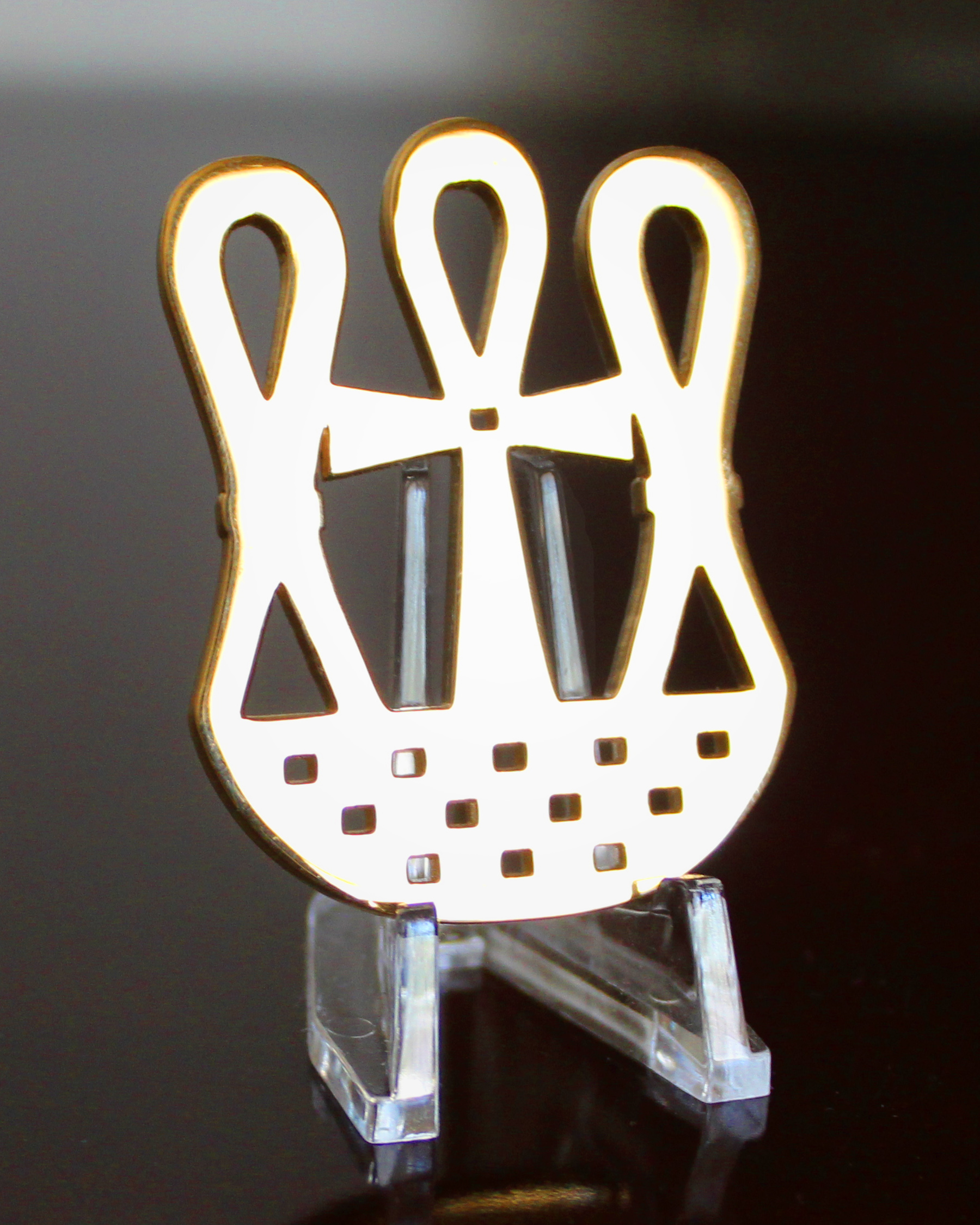 So what is the "Motto" of Sithathoryunet's clasp? Her name means “daughter of Hathor of Dendera”. So her spiritual parent was Hathor. Her earthly parents were king and queen, possibly Senwosret II. The king would want the greatest protection for his daughter, so he wanted to provide her with protective amulets. This amulet says "Neb-Sau-Ankh", which means "full of protection and life". To render this into flat positive/negative design requires simplification. I wanted to suggest the basket weaving of the "neb" glyph. I got a simpler version for a small size and a more complicated version for a 4x5 inch version.