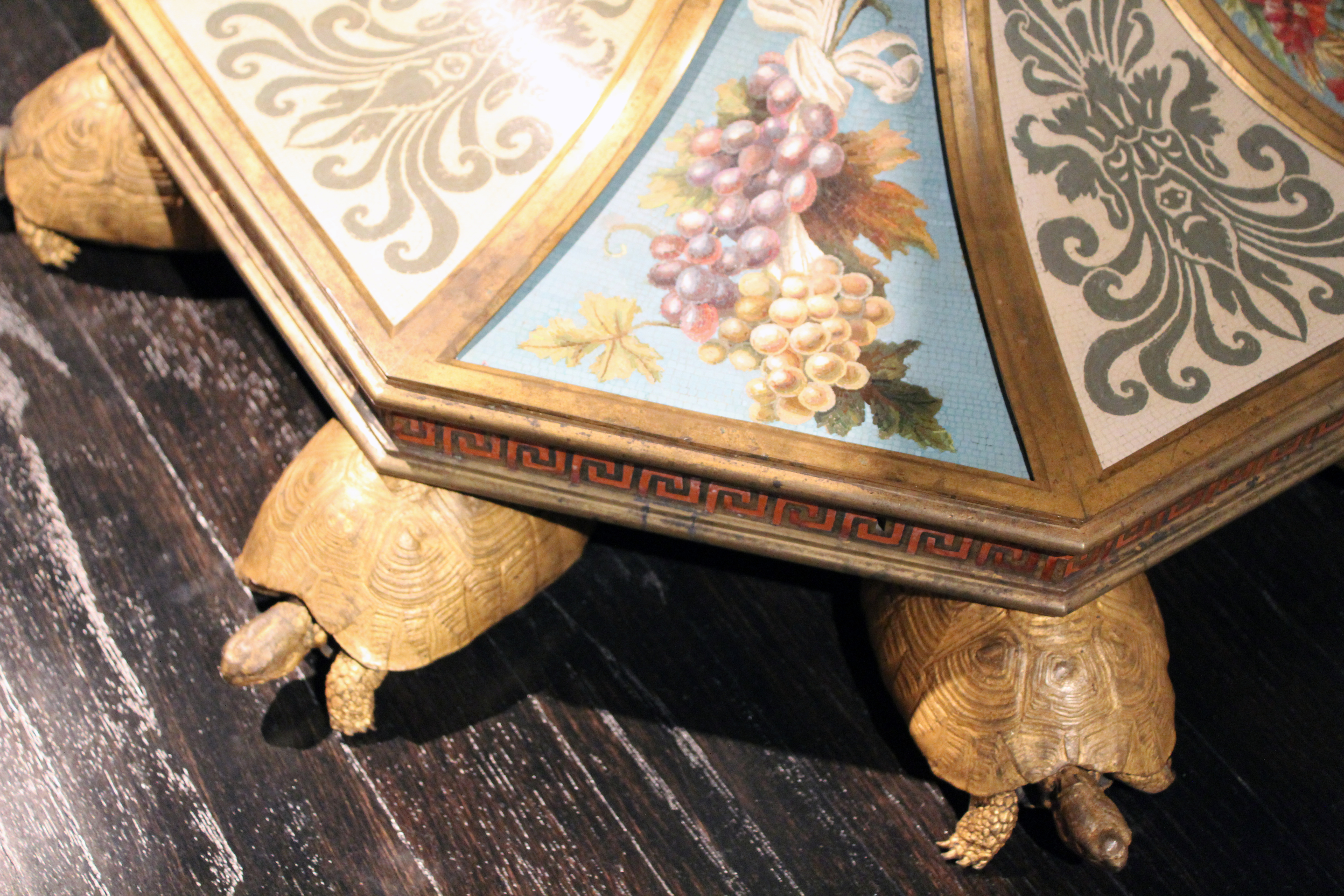 "A mythological and allegorical tour de force, this rare table is the only known example to be covered entirely with micromosaic, a type of mosaic composed of thousands of tiny pieces of colored glass. Charging forth from the center medallion of the tabletop, Apollo, god of the sun, is pulled in his chariot by four rearing white steeds. Putti bearing the attributes of the four seasons alternate with winged busts representing the four elements: earth, air, water, and fire." (From the info card)