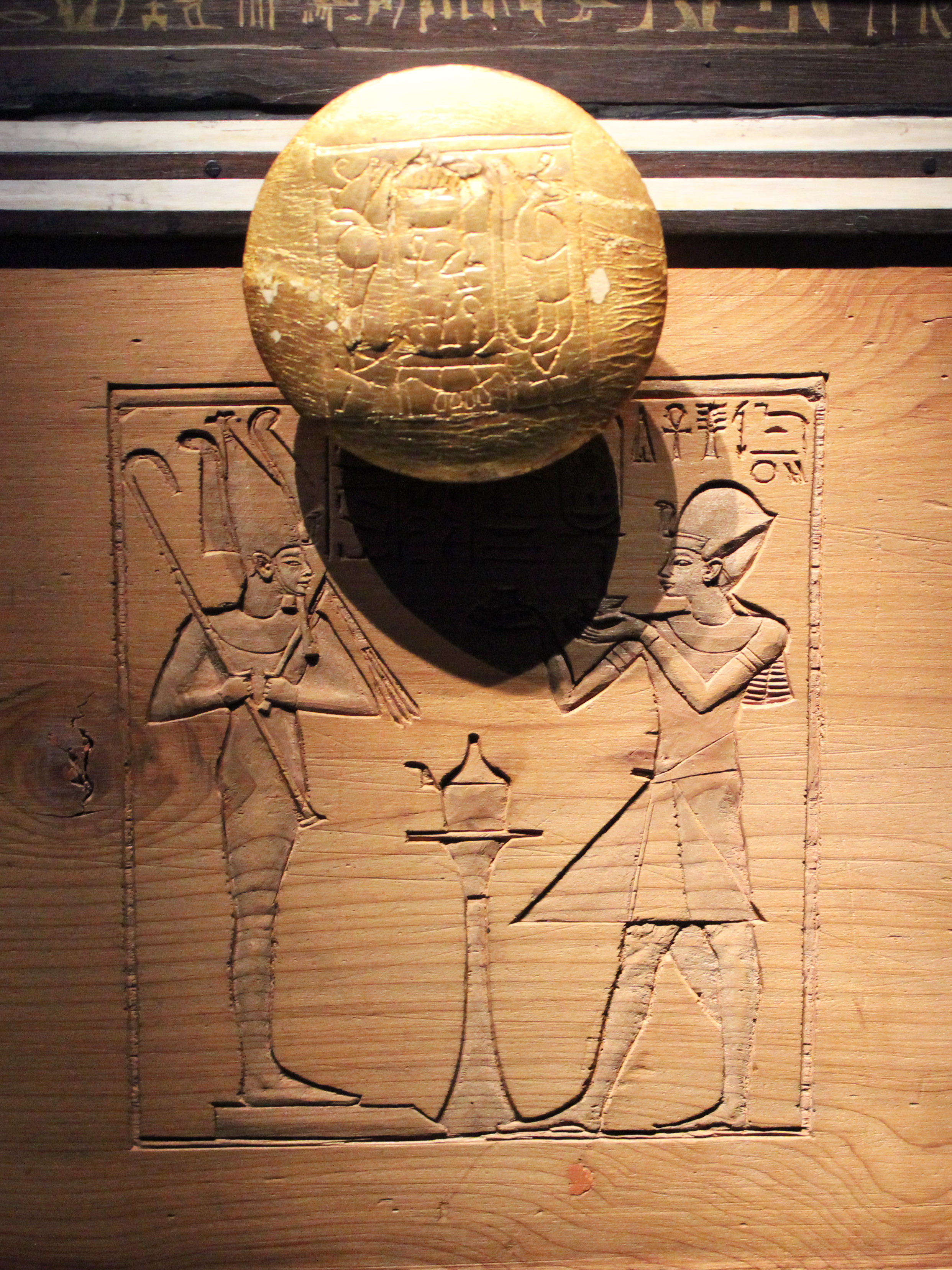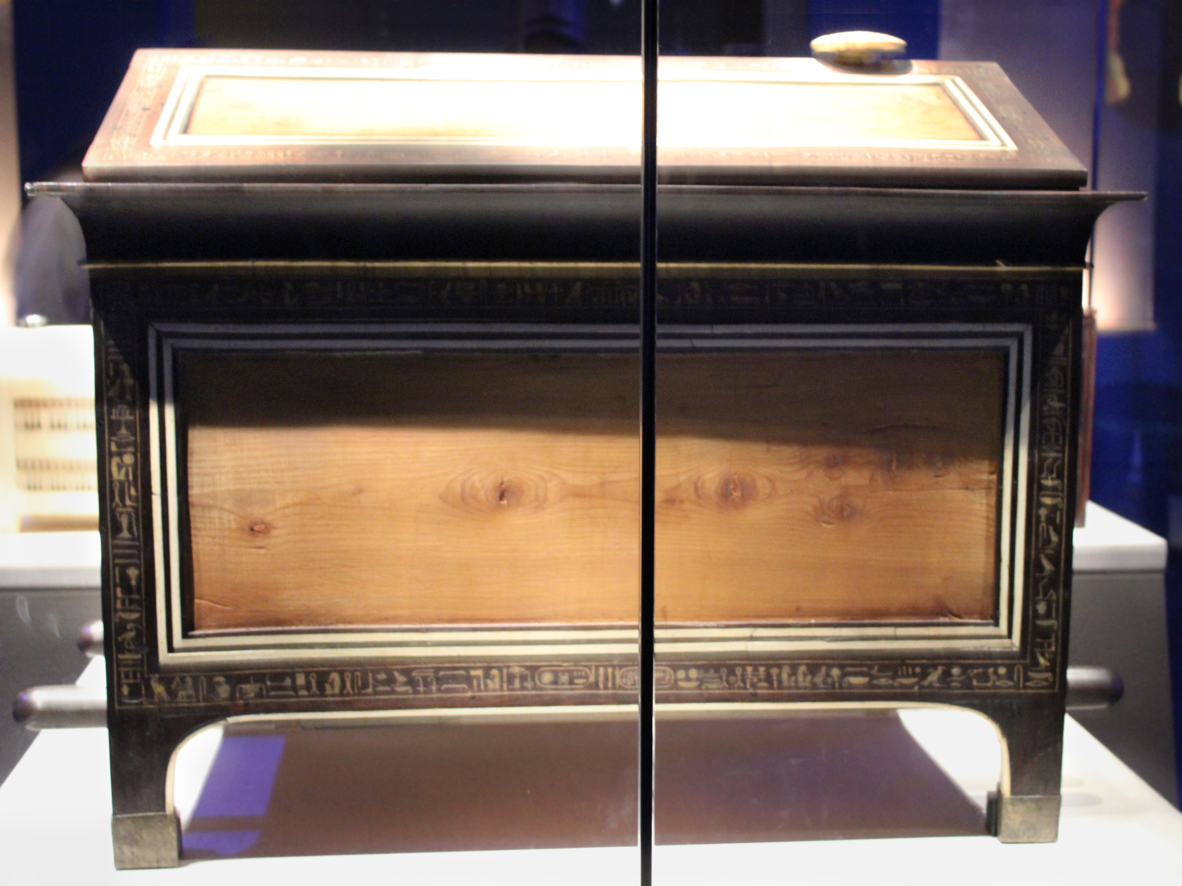 "This box shows Tutankhamun making an offering to Osiris. It contained glass vessels, incense, ostrich featherss, and other ritual objects for the Opening of the Mouth ceremony."