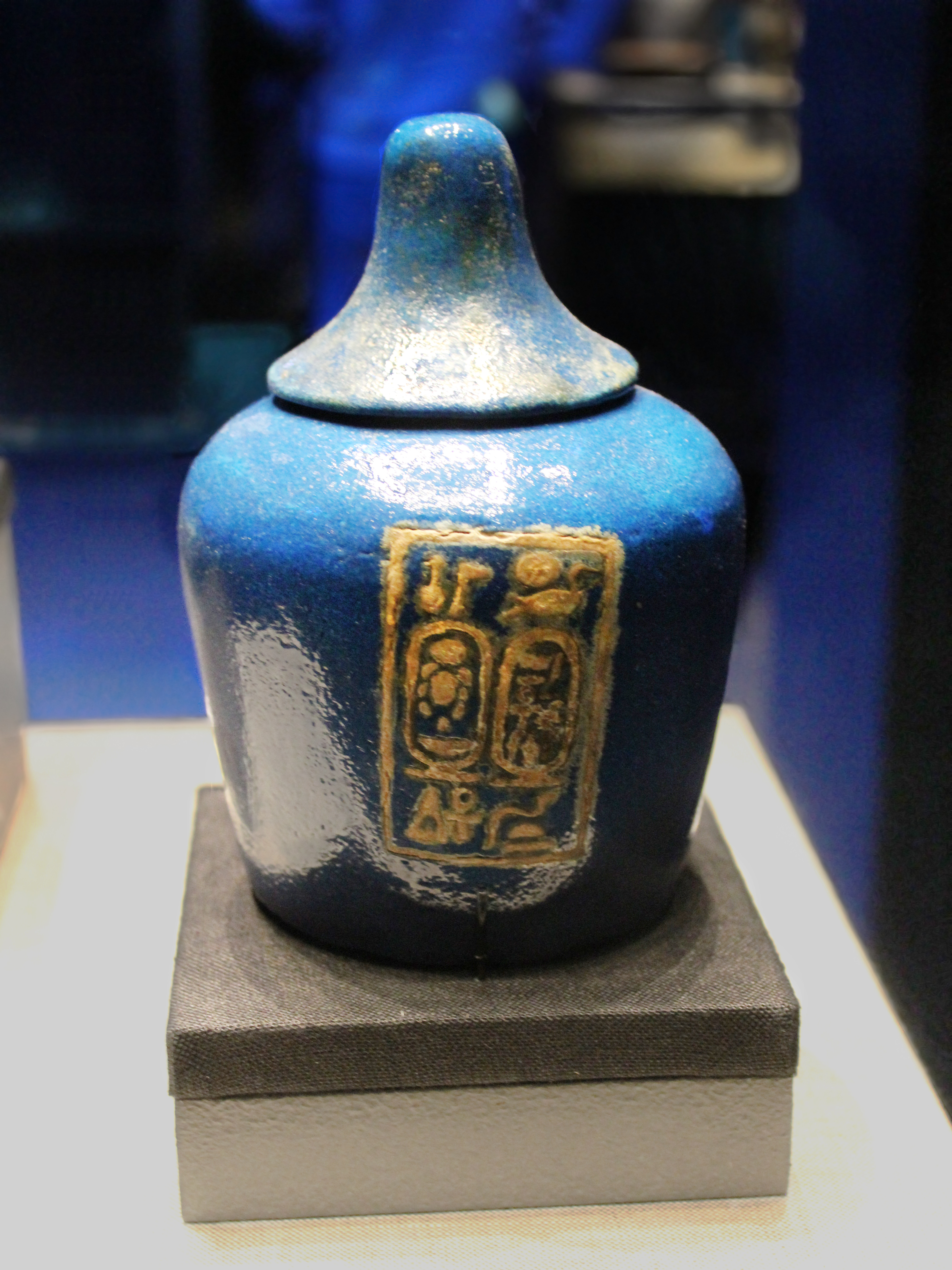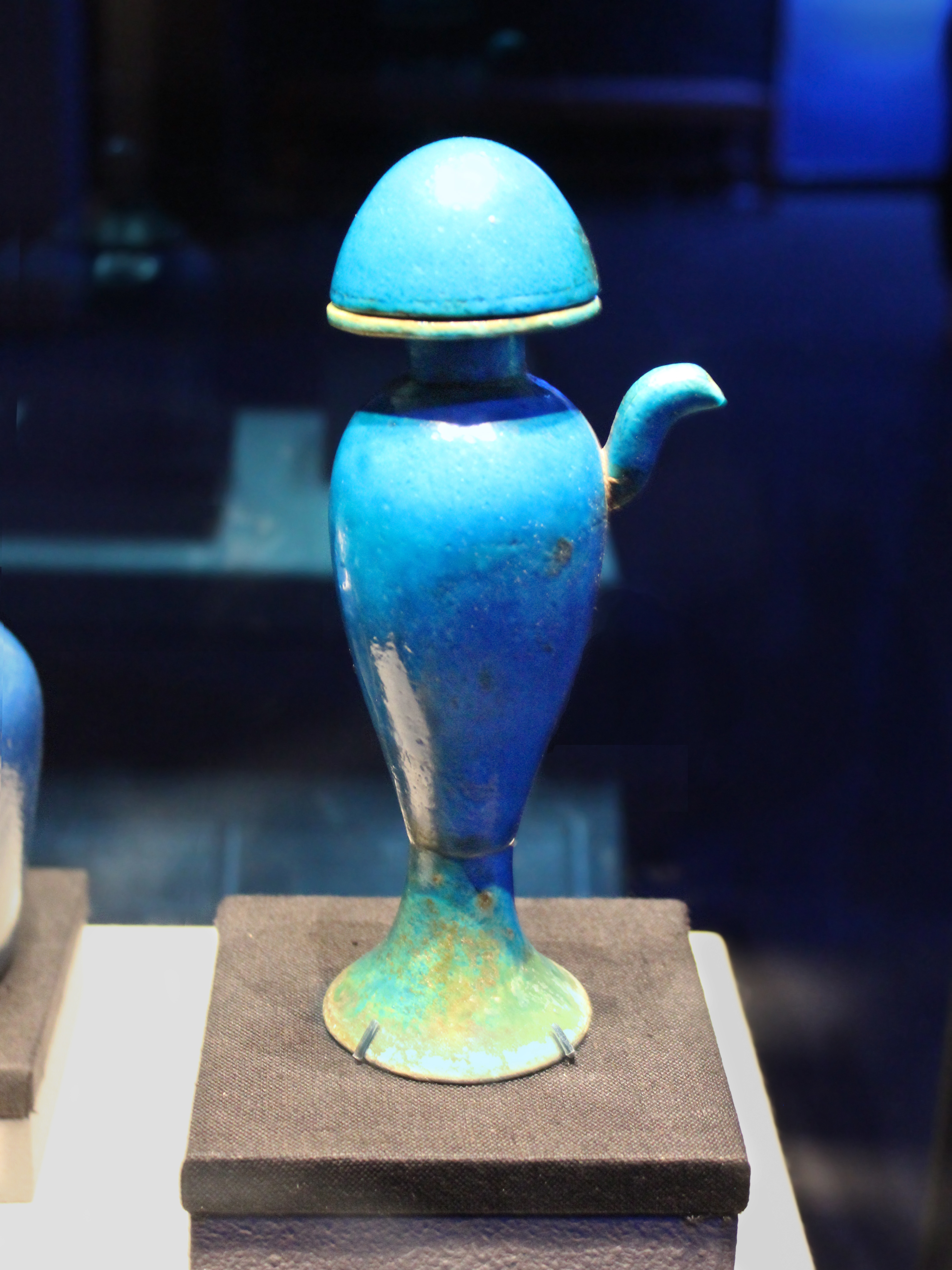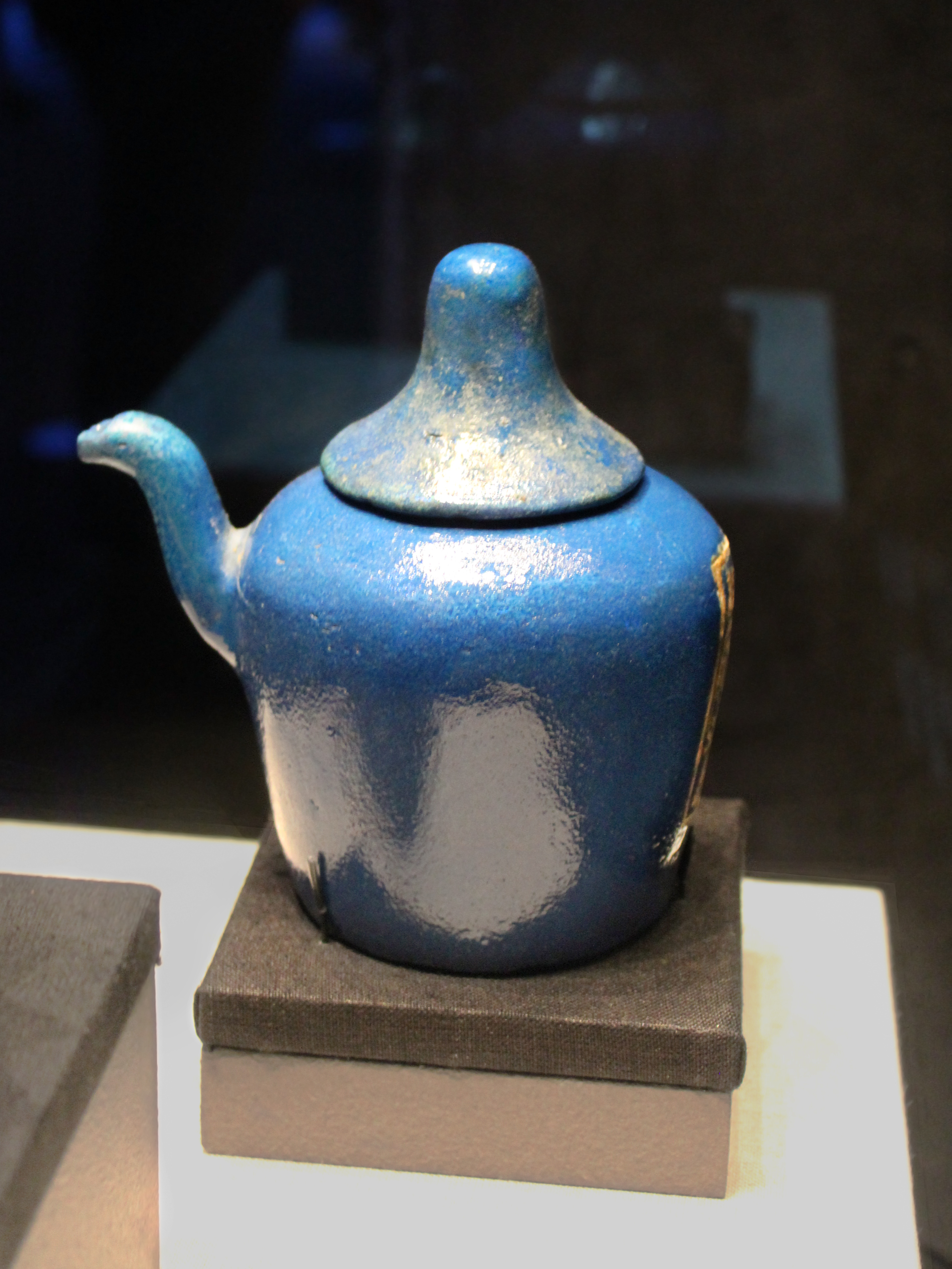 "The king's cartouche is written on this teapot-shaped nemset vessel. Like the vase, it is made of Egyptian faience: ground quartz with an alkaline glaze."