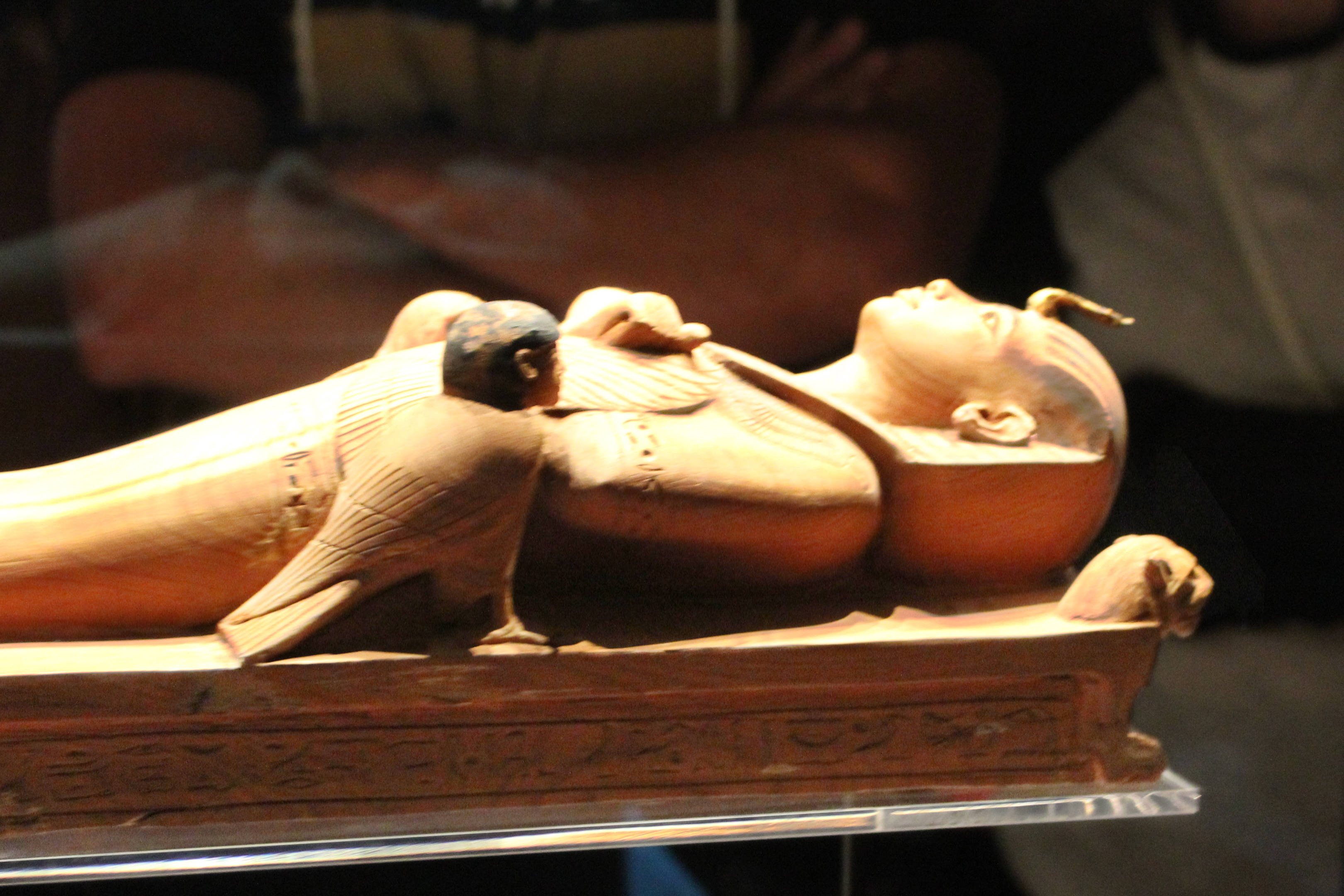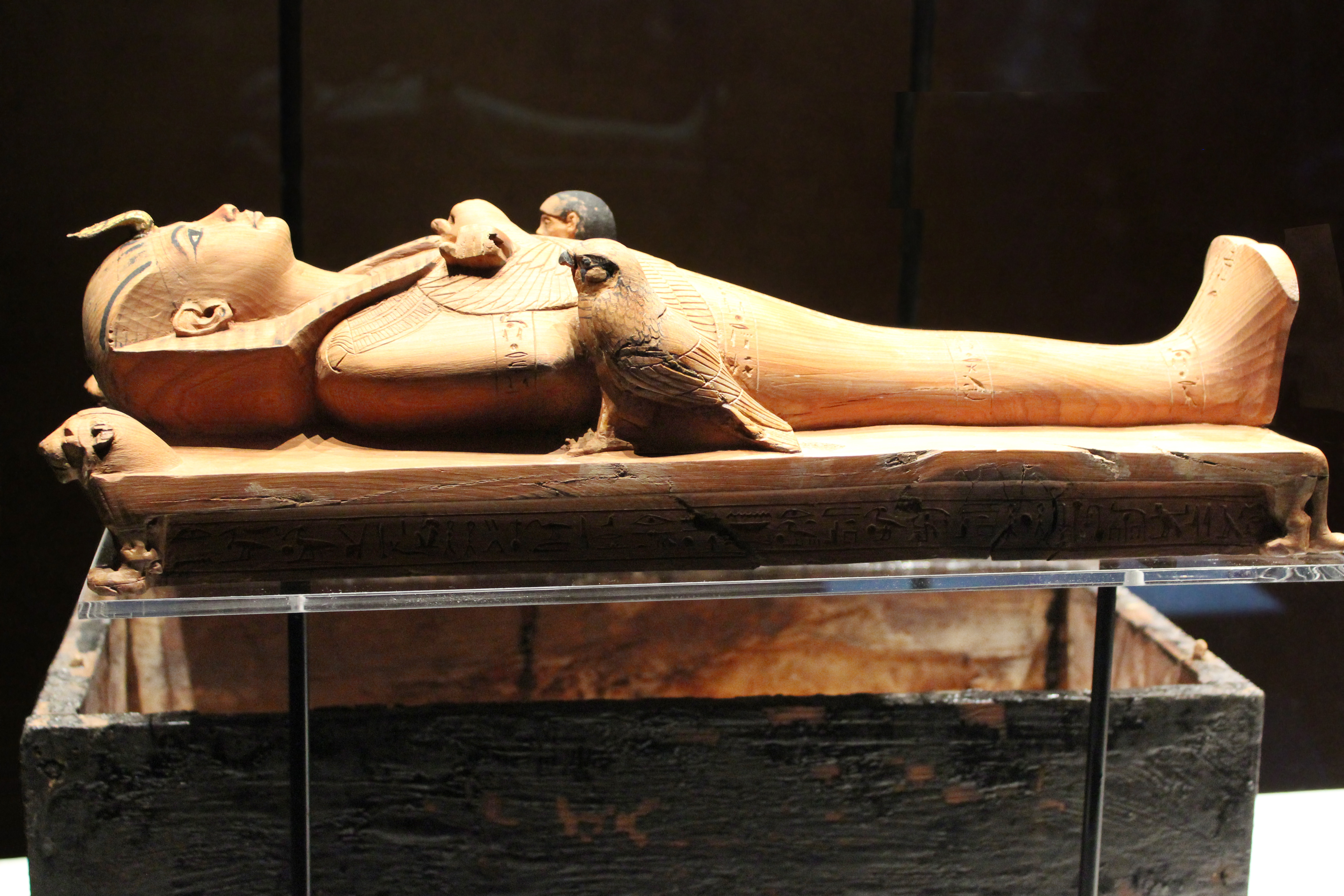 "The carved mummy wrappings and bands on the figure and the lion head and feet on the bed all provide protection from supernatural forces."