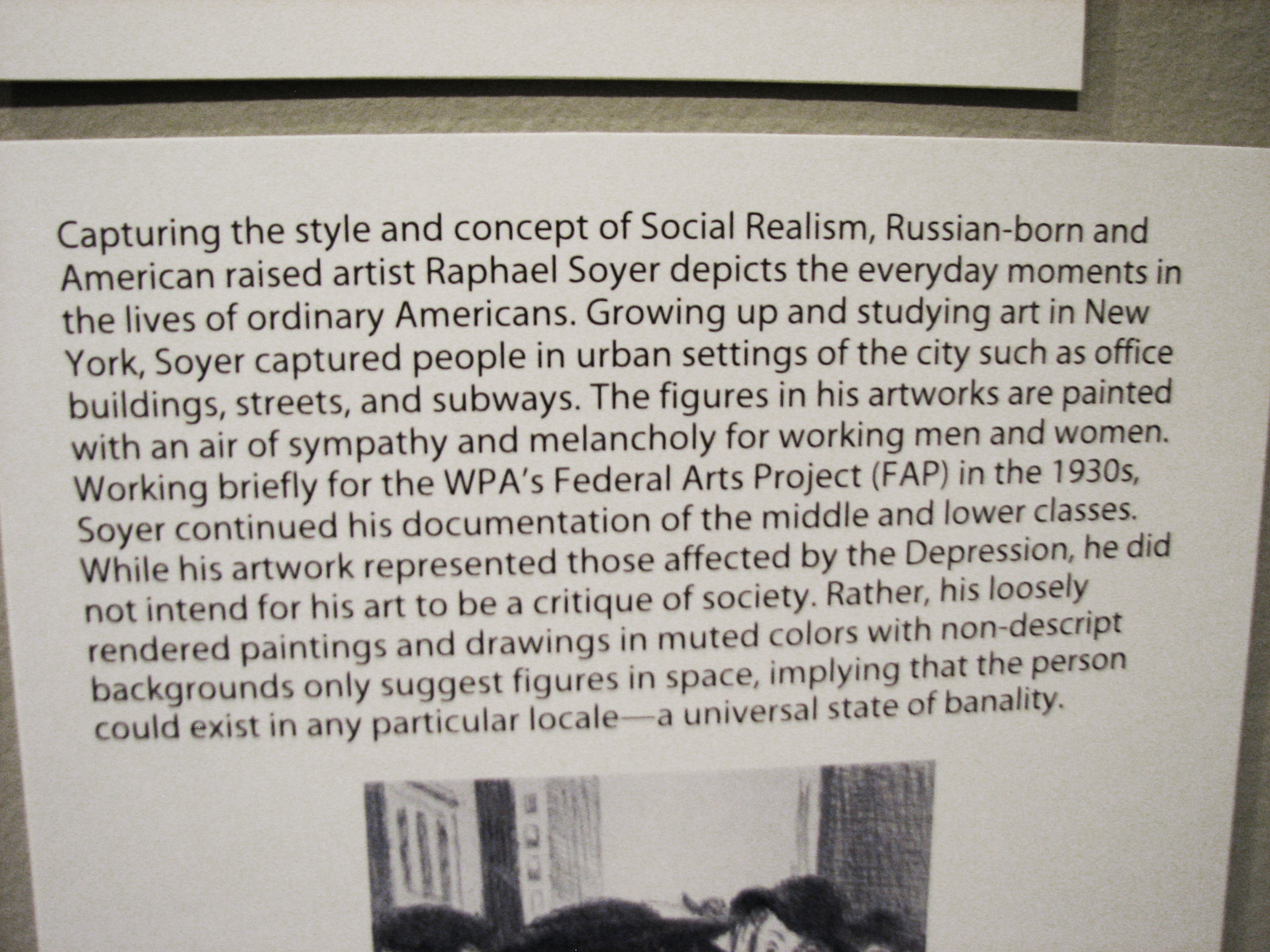 "Soyer was adamant in his belief in representational art and strongly opposed the dominant force of abstract art during the late 1940s and early 1950s. Defending his position, he stated: "I choose to be a realist and a humanist in art." He was an artist of the Great Depression, and during the 1930s, Raphael and his brother Moses engaged in Social Realism, demonstrating empathy with the struggles of the working class." (Wikipedia) Soyer wouldn't have likely liked Lipchitz' statue of the harlequin, but he had other things in common with Lipchitz, such as immigrating to America: