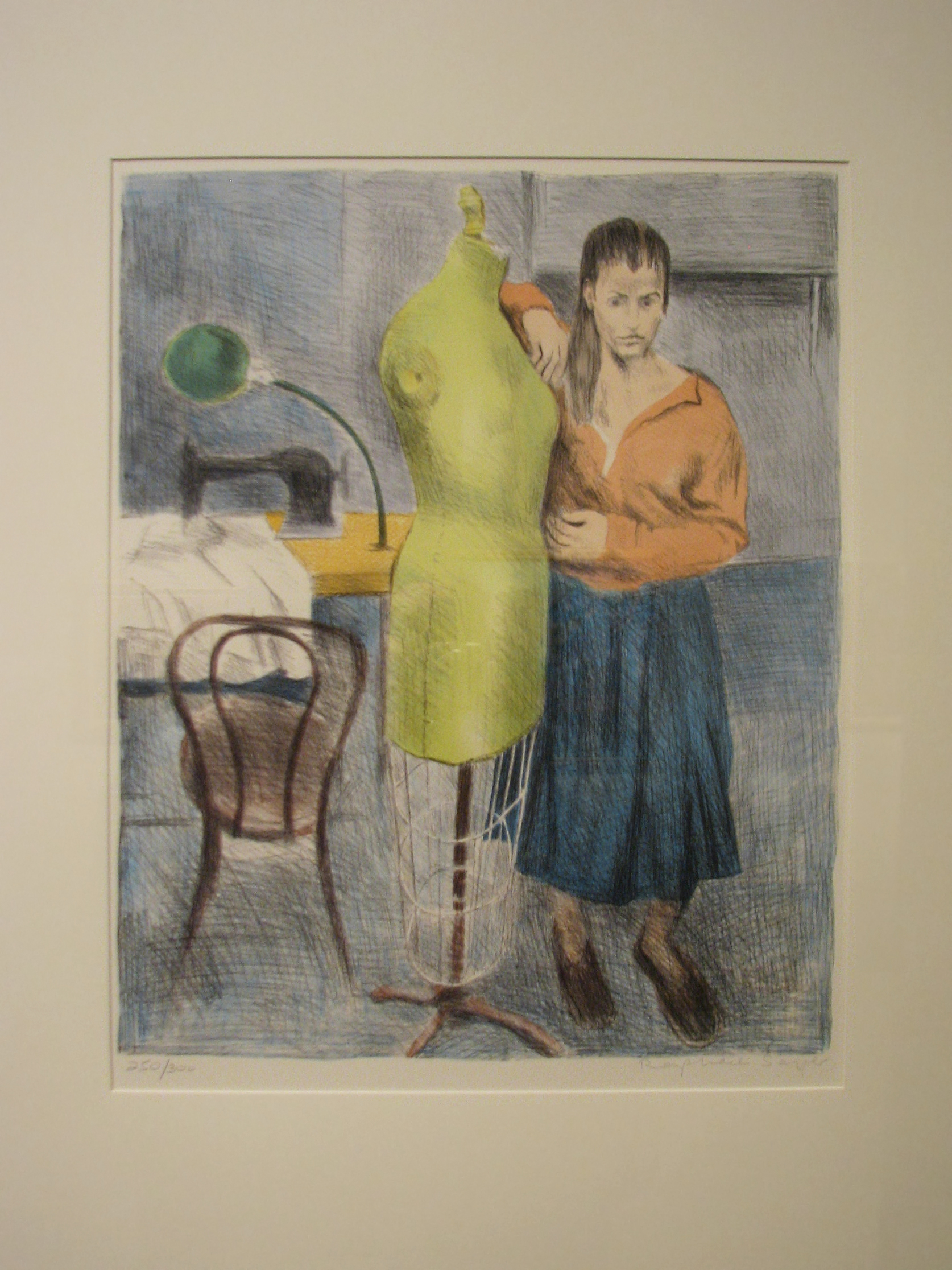 Changing mood a bit we go to this moment from a day in a seamstresses life. She might not have known that morning that an artist would want to be capturing her. Her sewing machine looks like the old Singer I have. Her skirt looks like many of the ones I wear. (And I've spent many of my years sewing! I never used the dress forms, though.) Raphael Soyer depicted "the everyday moments in the lives of ordinary Americans. Growing up and studying art in New York, Soyer captured people in urban settings of the city such as office buildings, streets, and subways." He also worked "briefly for the WPA's Federal Arts Project (FAP) in the 1930s" where he "continued his documentation of the middle and lower classes." (From the info card)