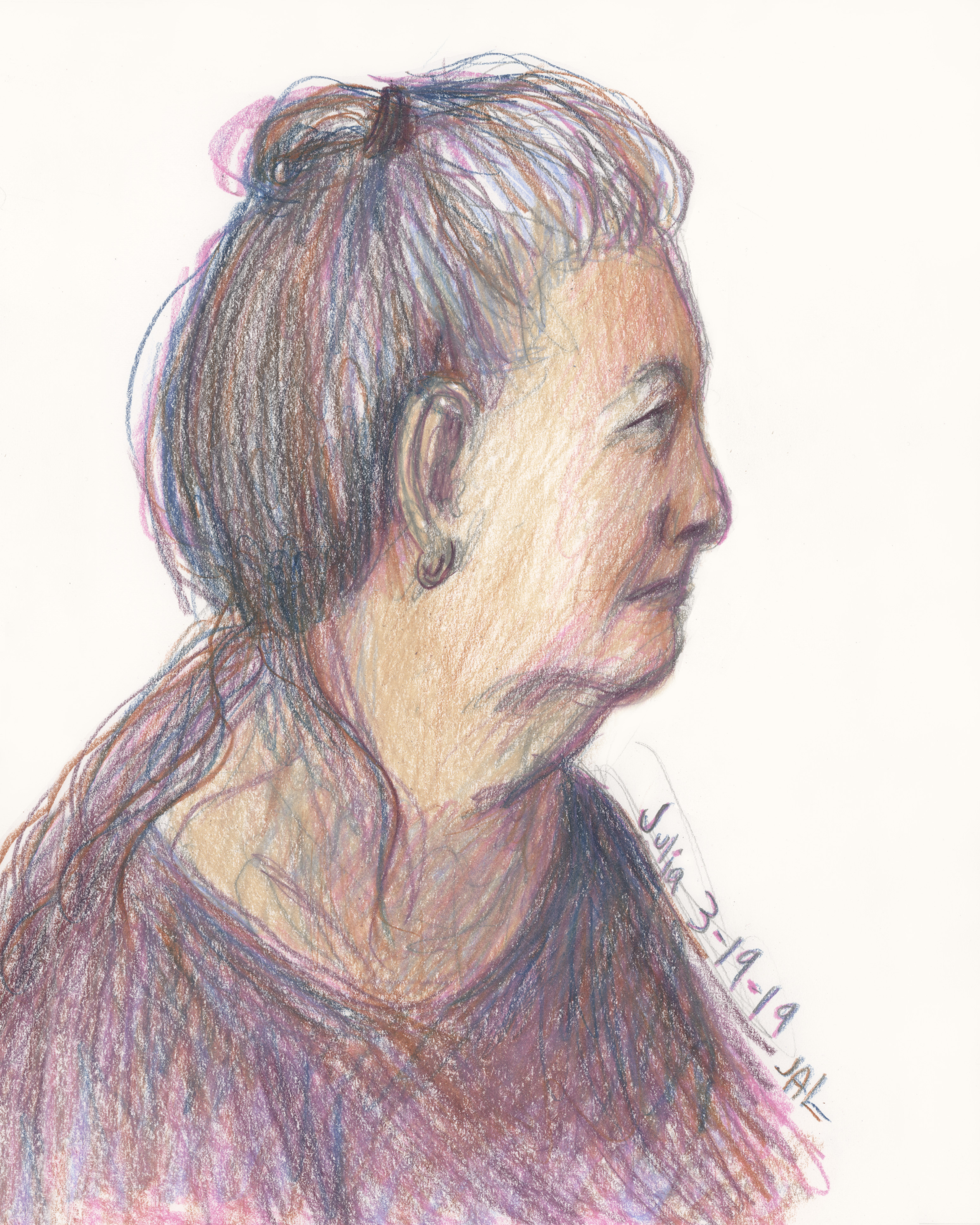 I took a break from this project to read a biography of Cézanne that I've borrowed from the library. I'm on the second chapter, where the author is talking about his relationship with his father. He would paint portraits of his father as he was reading the newspaper. I looked up from the book to see Julia at the computer. I realized I could have a go at drawing her, as she doesn't move around a lot when she's busy with the genealogy: