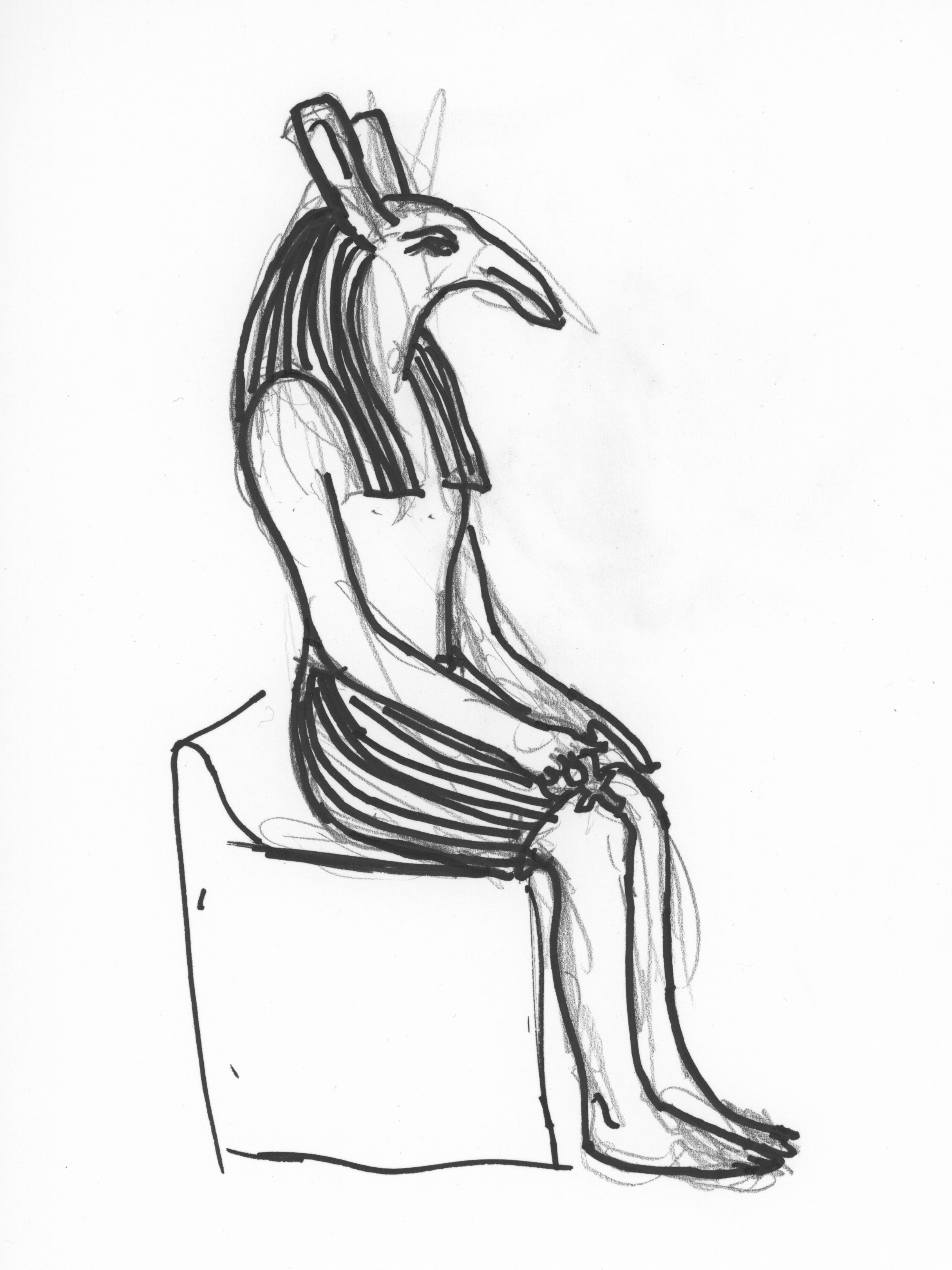 I started with sketching from a similar statue of Heru (Horus), that is only the body, (and changing out the falcon head for a Set head, Miho Museum in Japan has a lovely silver statue of Horus. It used to have gold gilding, as evidenced by what remains. I imagine the missing throne was of pure gold.