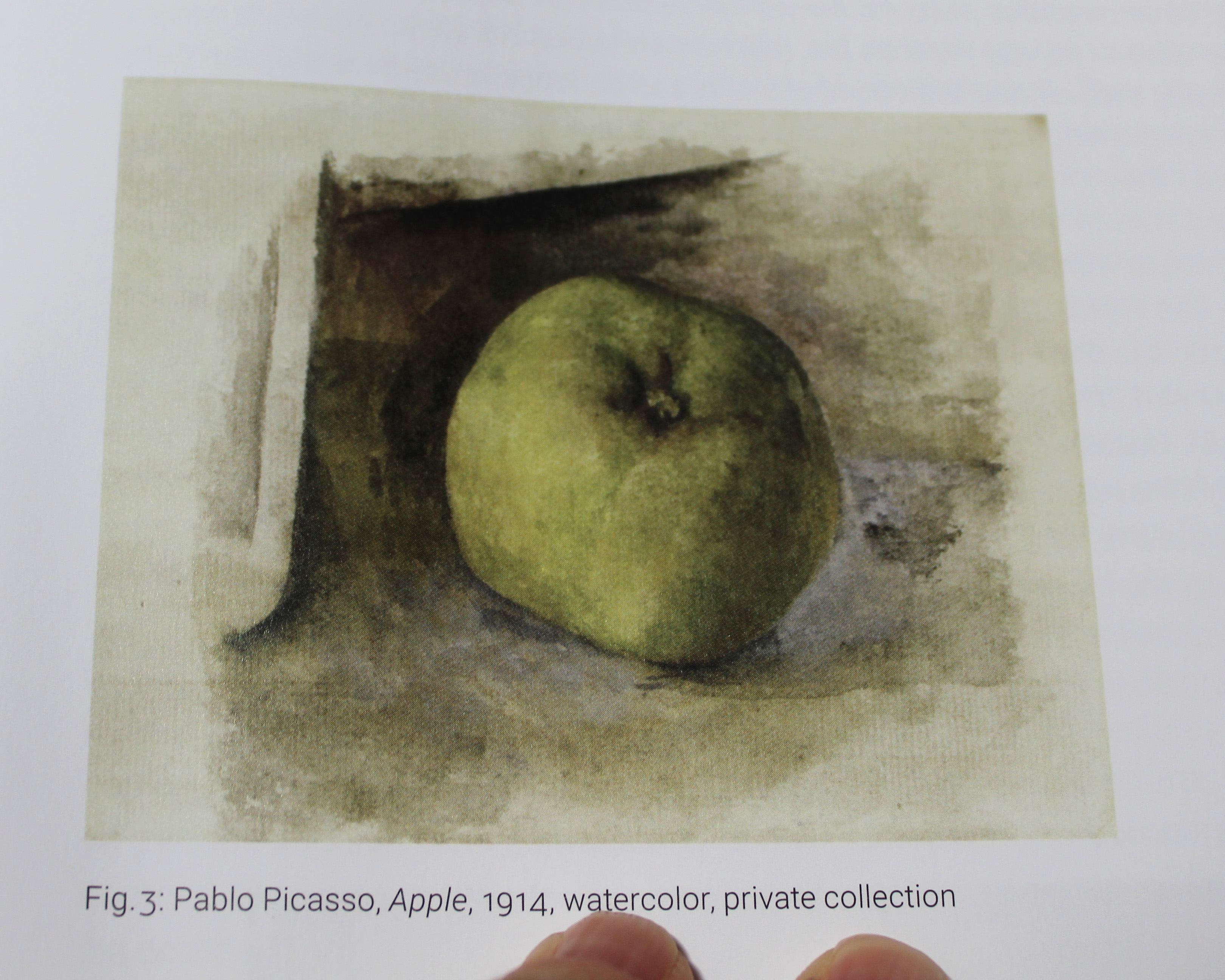 Cézanne went often to the Louvre to learn from the masters, so it's certain he would have seen Chardin's painting. He simplified his own composition, (Bye bye silver goblet, with its lustrous reflections!) just to focus on the apples. (But what apples!) Cézanne is often quoted as saying, "With an apple, I will astonish Paris!" Or more exactly "Avec une pomme, proclaimait-il, je veux étonner Paris", as quoted in the footnotes, page 255. Picasso wanted in on the game. Rather than five apples, he hoped to do it with just one: