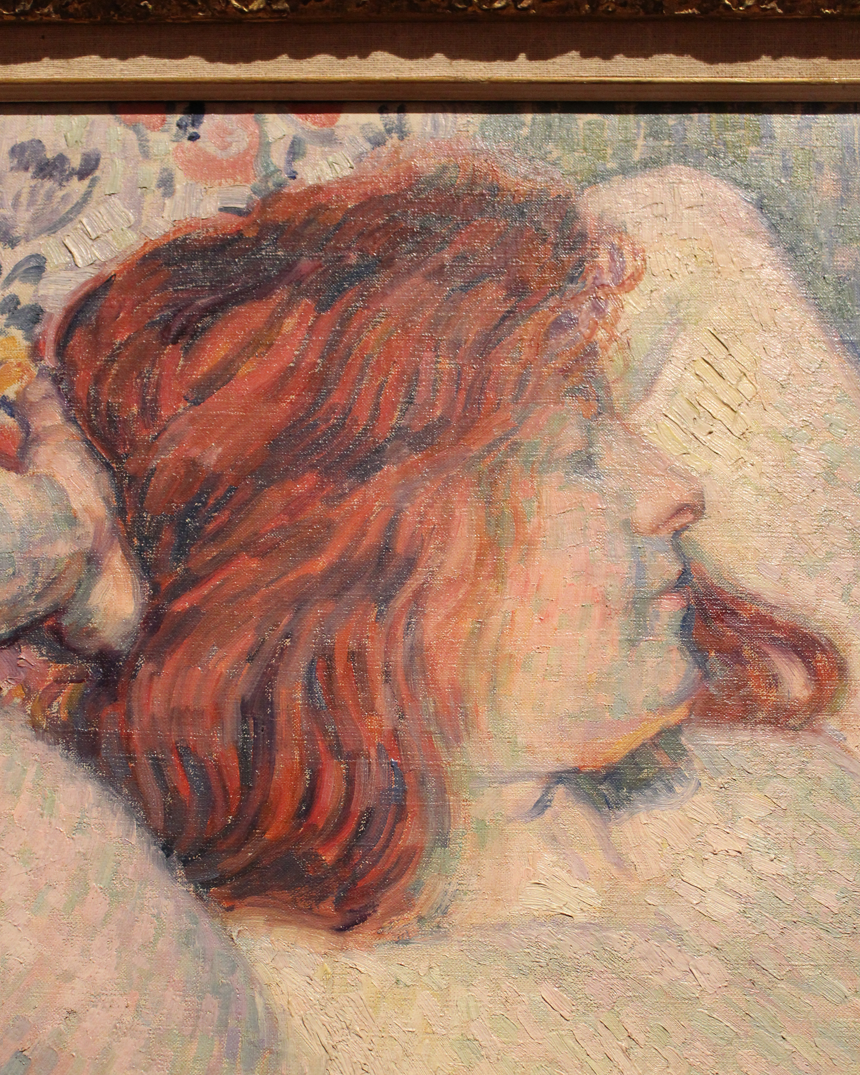 "The influence of the French artist George Seurat and his pointillist technique is evident in Rysselberghe's painting of a half-naked woman lying on a sofa. The paint is applied in broad, regular strokes that enliven the painting's surface, and whose bright colors give it an added dynamism. This pointillist-inspired style is one of many highly expressive and richly coloristic methods of painting that developed around 1900 in the aftermath of Impressionism. The subject, too, is a common on in the period - a partially clad woman caught in a moment of repose, with little to indicate to the viewer what, if anything, has led her to be painted this way.