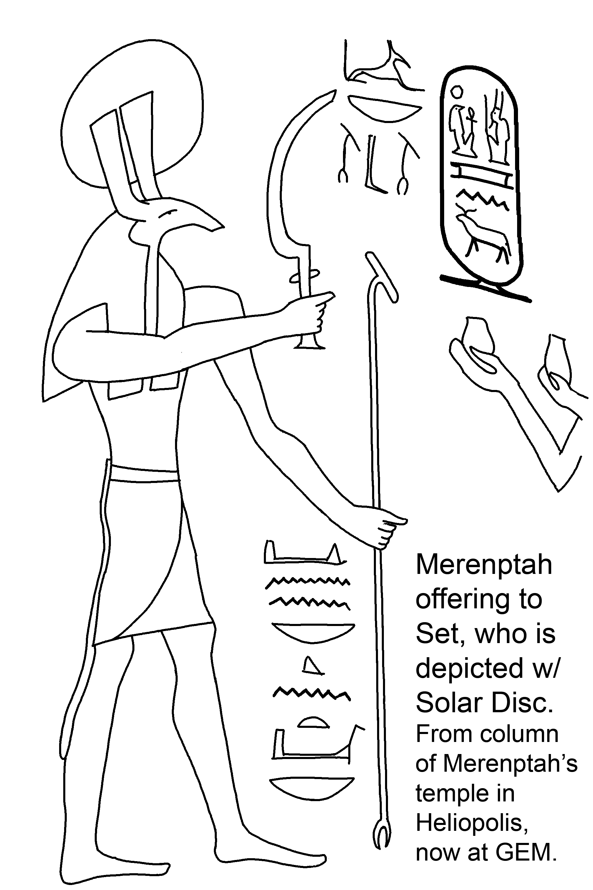 A colleague shared a link to the originating photo of Merenptah offering to Set, who is depicted with a Solar Disc. The column was originally from Merenptah's Temple in Heliopolis (Iunu) (now Matariya). After being in storage since 2008 to protect it from the high level of subsoil water there, it has since been moved to the new Grand Egyptian Museum. The depiction of Set with the Solar Disc is quite rare. We normally think of Set as a Lunar god, because he has to be at his best during the night time defence of Ra against the Ap/p. But that would be limiting him! Grasping the Khepesh means he is granting protection to Merneptah against his country's enemies.
