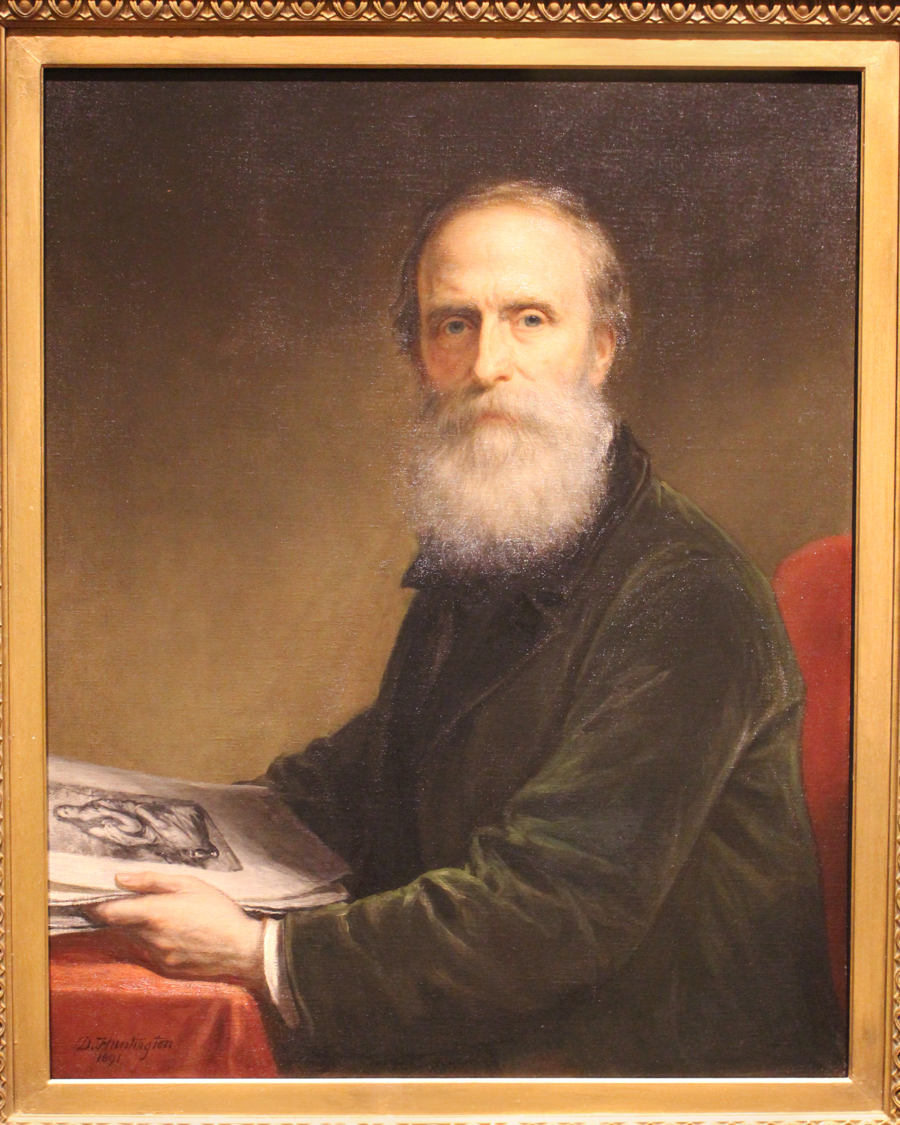 "Huntington exchanged this self-portrait for his original diploma portrait, a likeness of himself painted nearly sixty years earlier by his close friend and brother-in-law, Cornelius Ver Bryck. It was natural for the Academy's venerable former president--elected twice to the role, Huntington served the longest tenure ever--to donate to the collection a mature self-image. A firm adherent to traditional artistic ideals, he pictured himself as a student and lover of the art of the past rather than as a successful professional artist. His direct gaze invites the viewer to share in his study and appreciation of an engraving after Titian's The Penitent Magdalen. (From info card)