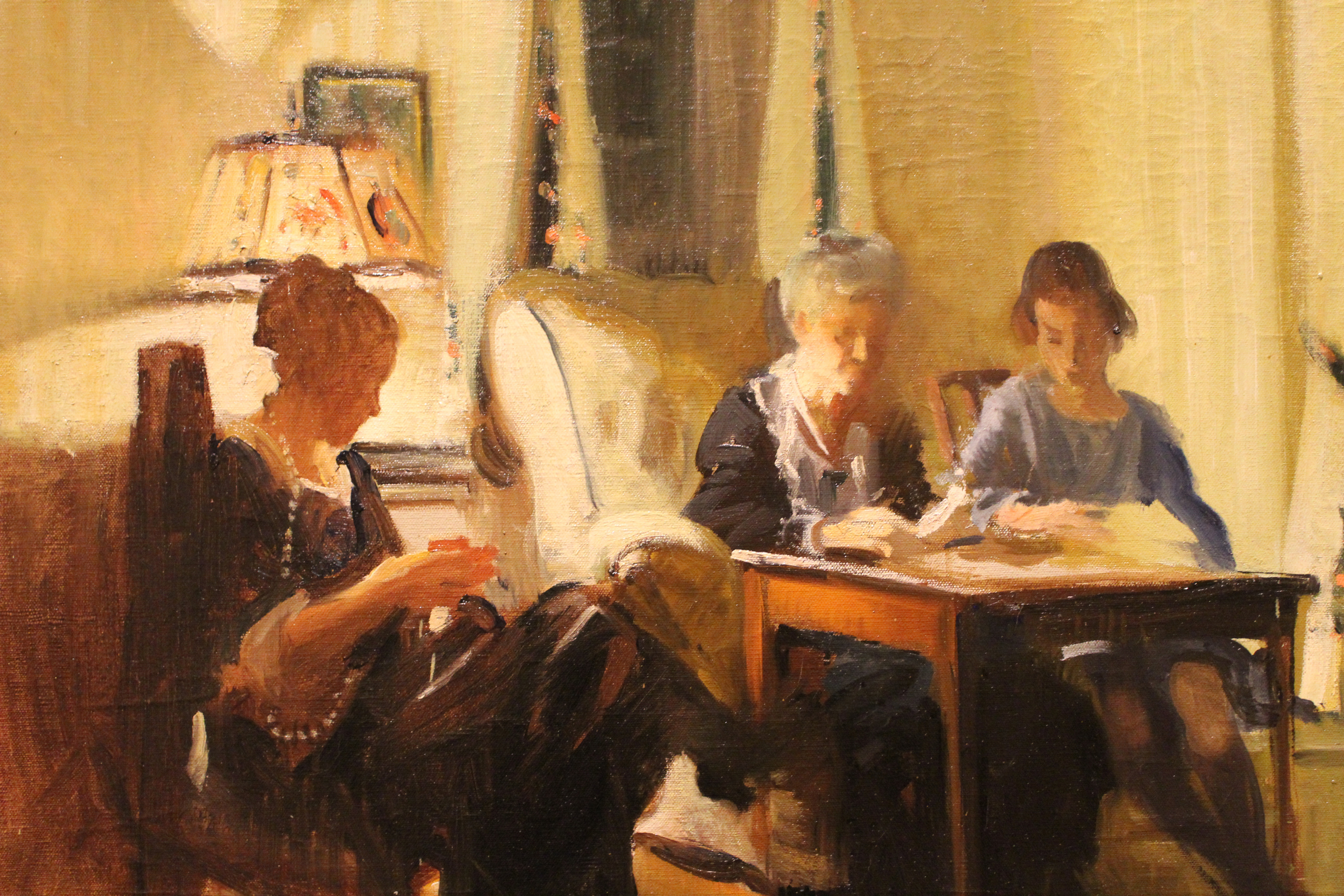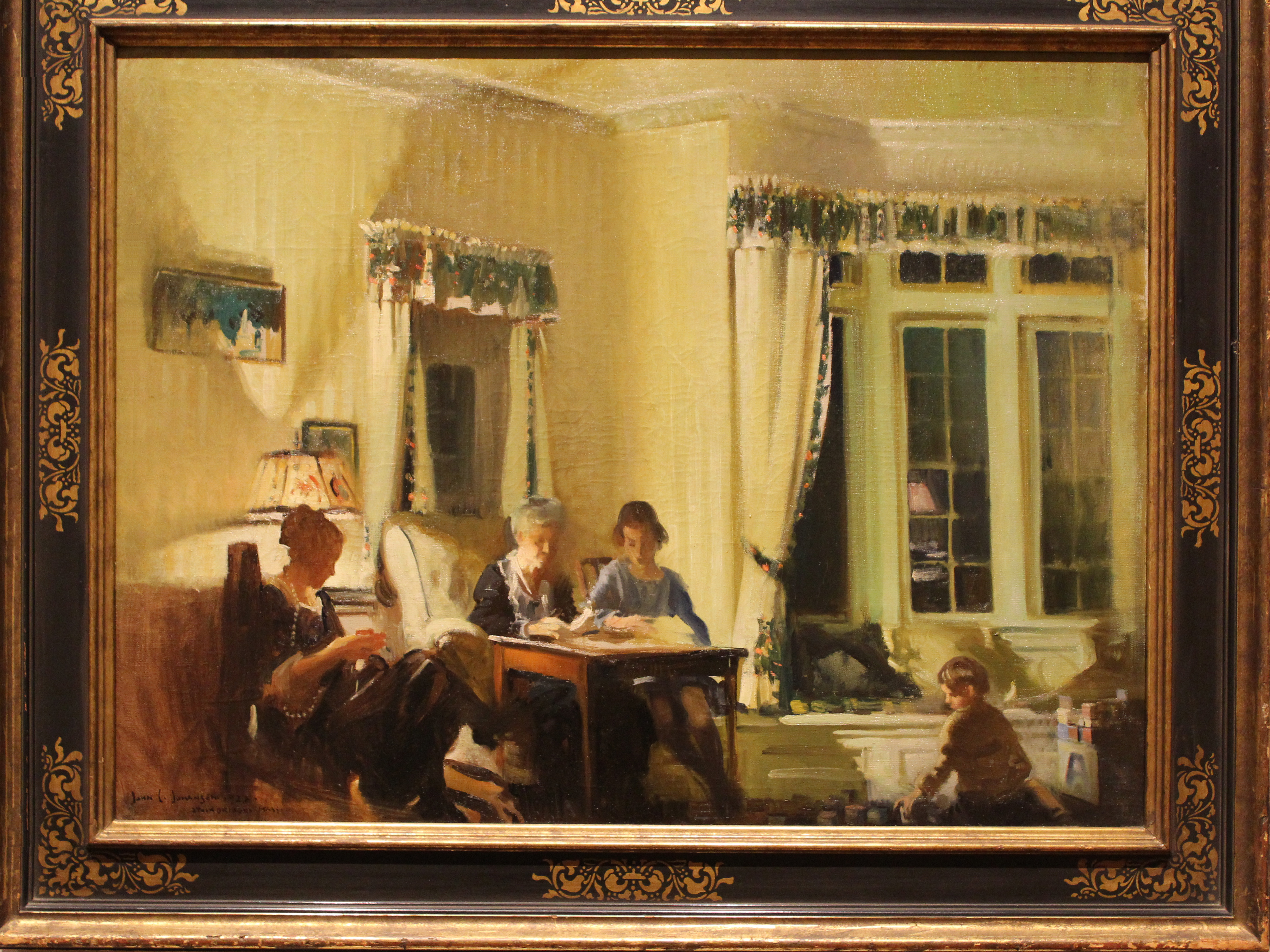 "This nocturnal, interior scene shows three generations at leisure inside a comfortable home in Stockbridge, Massachusetts. Strong, artificial light creates bold patterns and deep shadows throughout the well-furnished parlor. Invented in the 1870s, electric light was just coming into prominent use inside homes in the early 1920s.