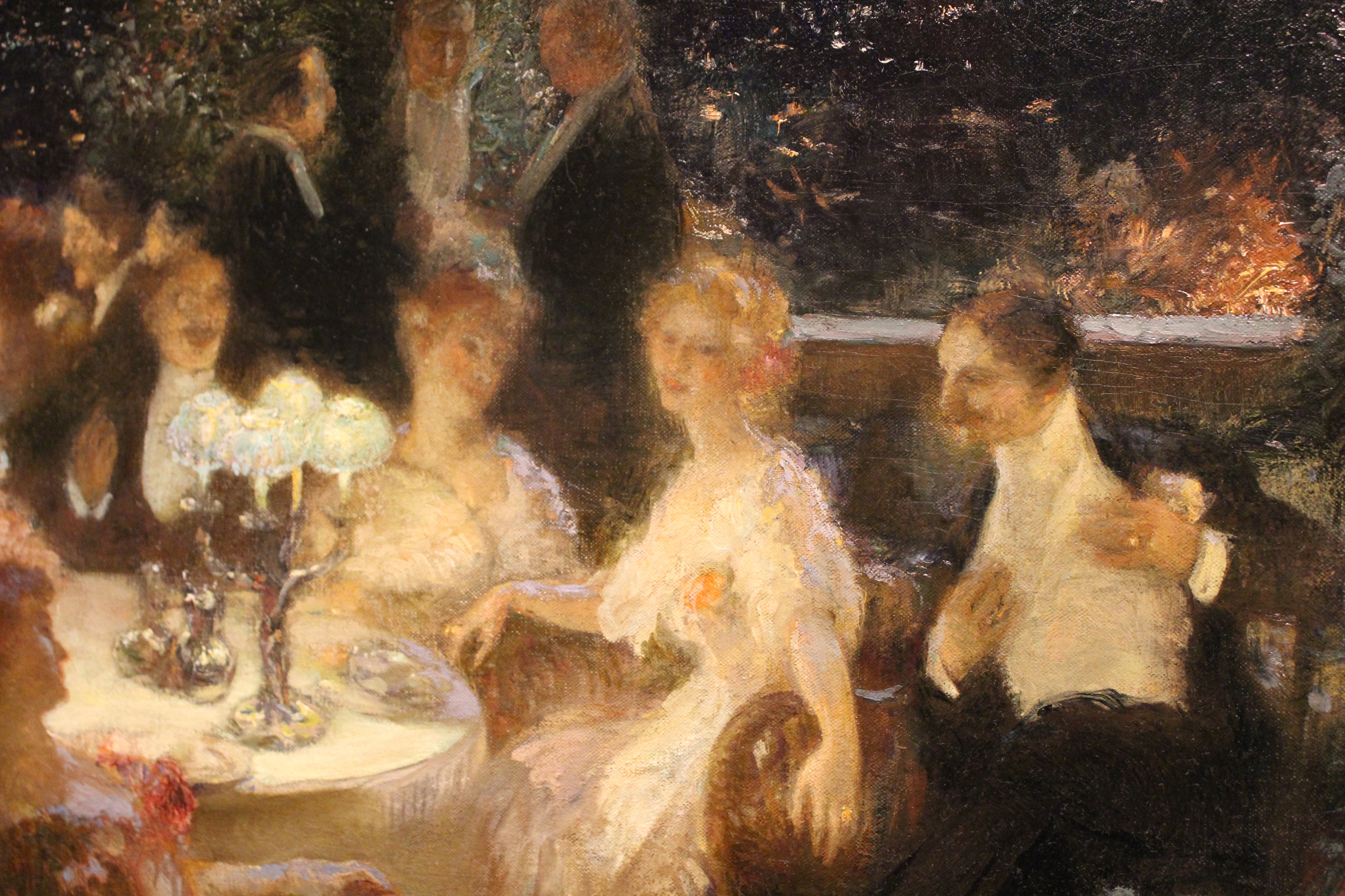 "Very little is known about the artist Gaston La Touche, other than he showed regularly in Paris from the 1880s until his death in 1913, winning medals for his portraits, pastoral landscapes, and scenes of bourgeous life. This work is typical of his society paintings, capturing the pleasures of elegantly dressed men and women enjoying a summer evening on the terrace of a fashionable restaurant. Seated around candle-lighted tables, they engage each other in conversation, almost oblivious to the display of fireworks that explode in the sky above. It is an idyllic portrayal of Parisian nightlife at the turn of the twentieth century, when Paris was the artistic capital of the world. La Touche's captured the lighthearted human interactions and the wondrous light effects of this nocturnal scene." (From info card)