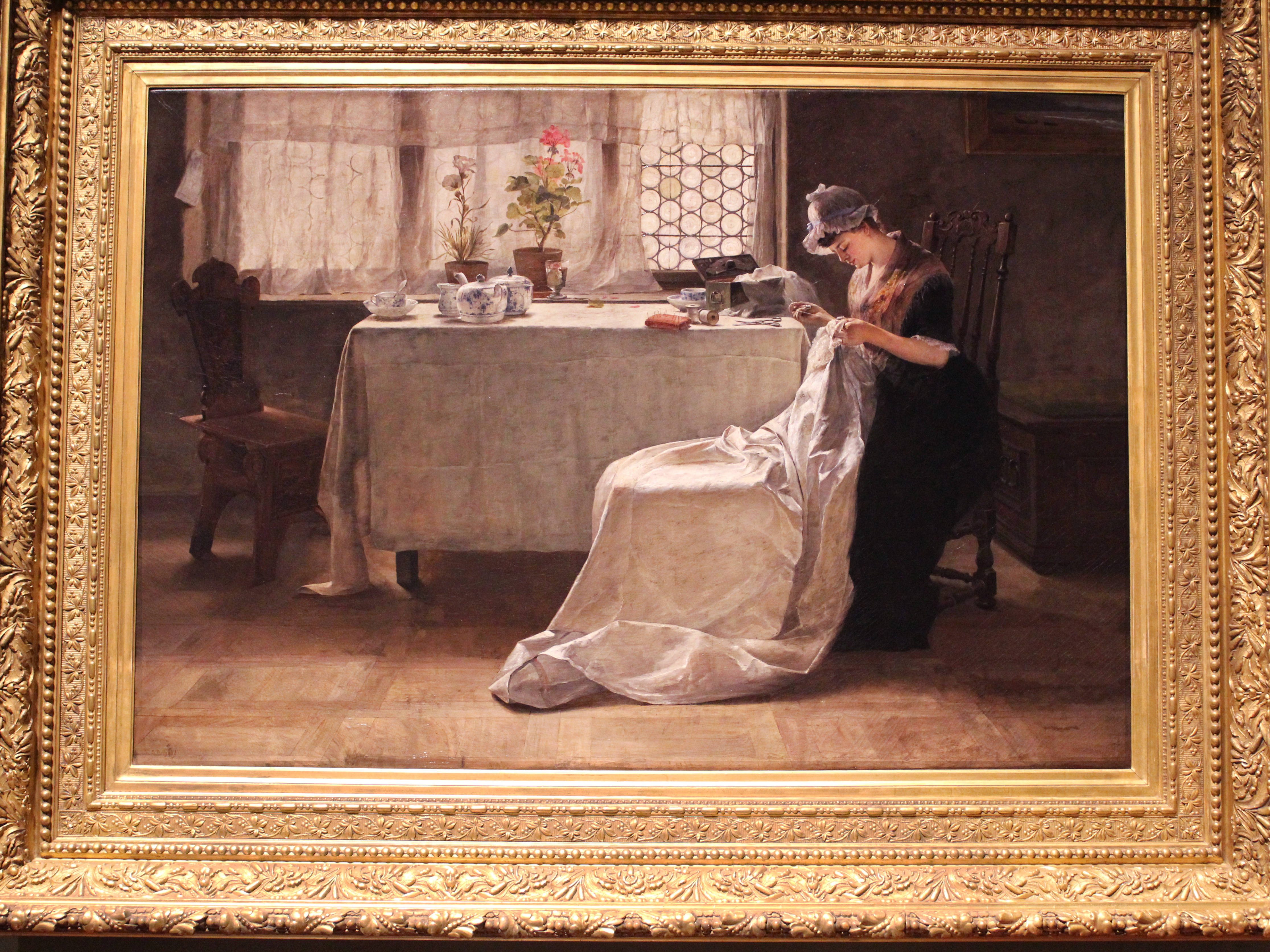 "It represents a Village maiden musing over her approaching wedding, busy with the last touches upon her bridal dress; You can see by the fresh made tea placed upon the table, and the chair placed near, that she is waiting for her lover who will come now any moment..."