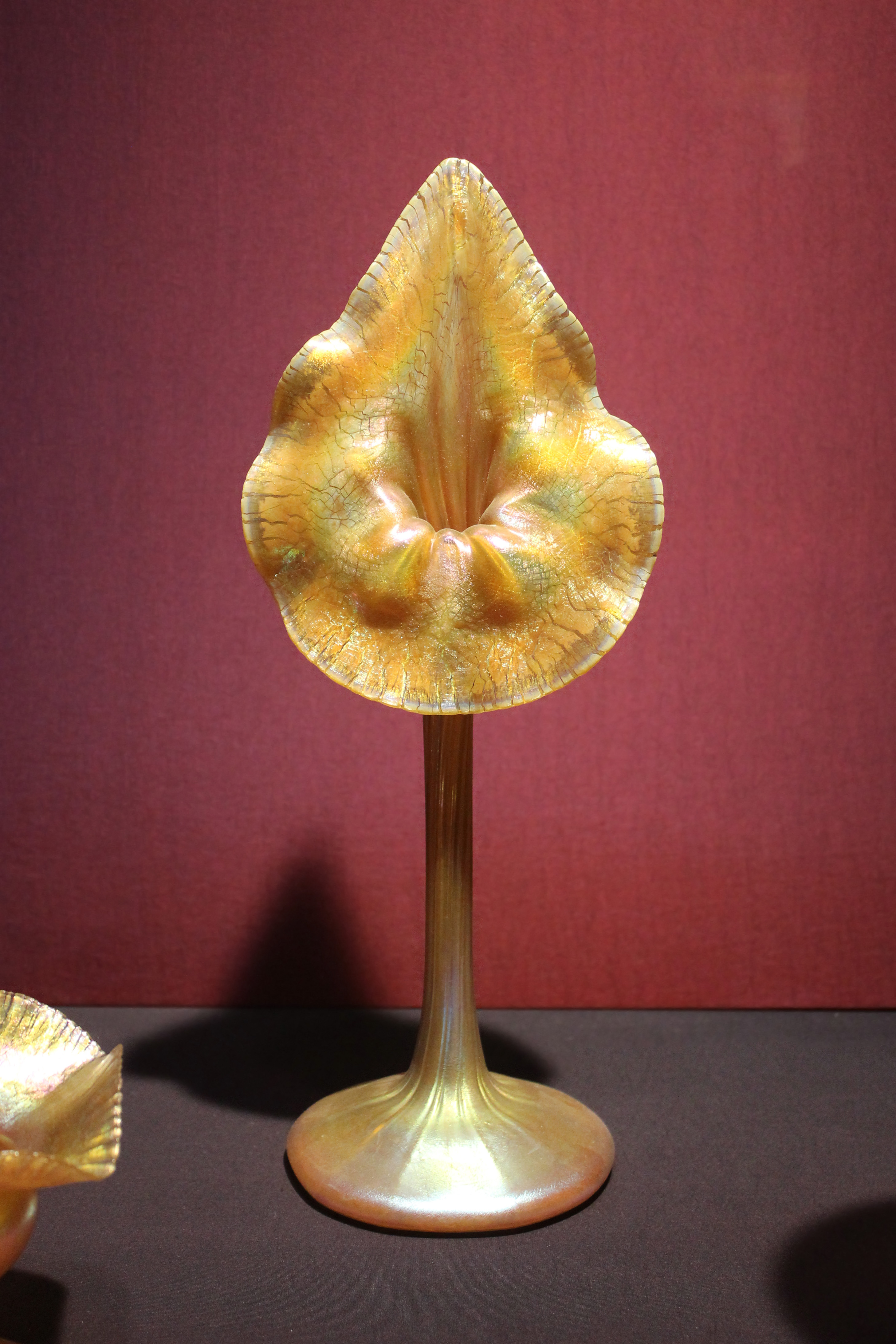Tiffany Studios existed from 1878 to 1933 in New York, "by Louis Comfort Tiffany and a team of other designers, including Frederick Wilson and Clara Driscoll." This Jack-in-the-Pulpit vase is of Tiffany's Favrile glass, which has a unique iridescence, meant to evoke "the wings of certain American butterflies, the necks of pigeons and peacocks, the wing covers of various beetles." according to Tiffany.(From Wikipedia)