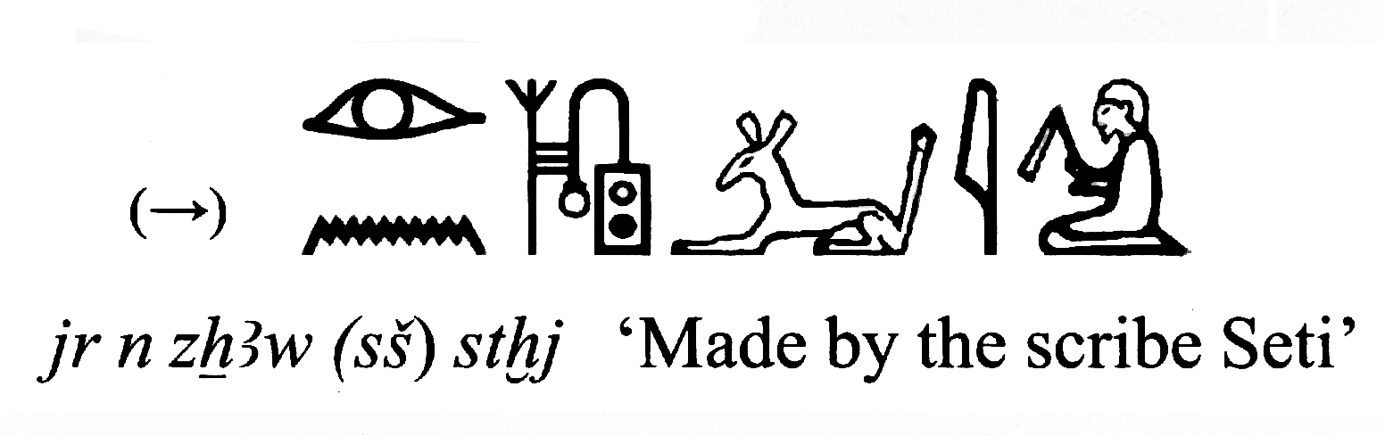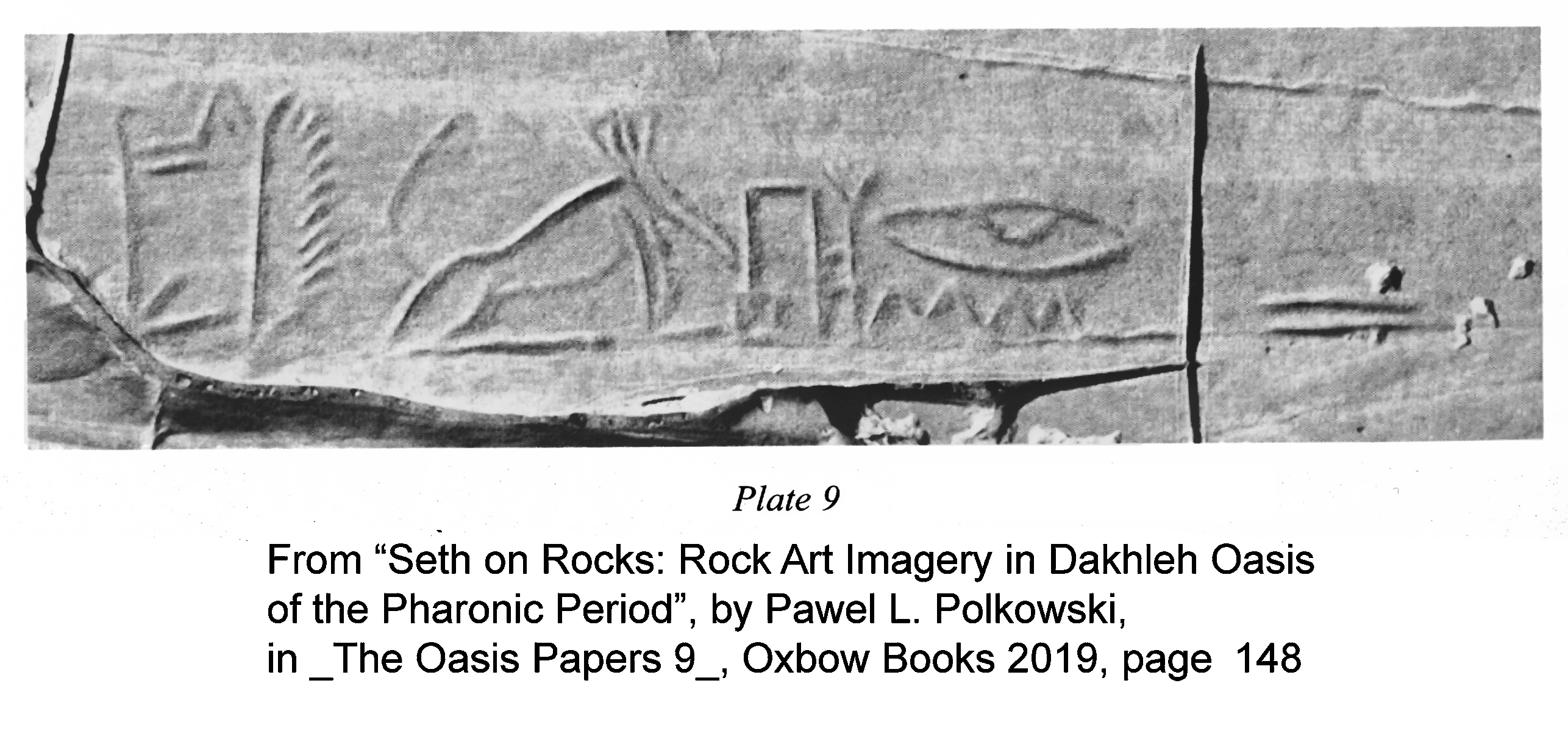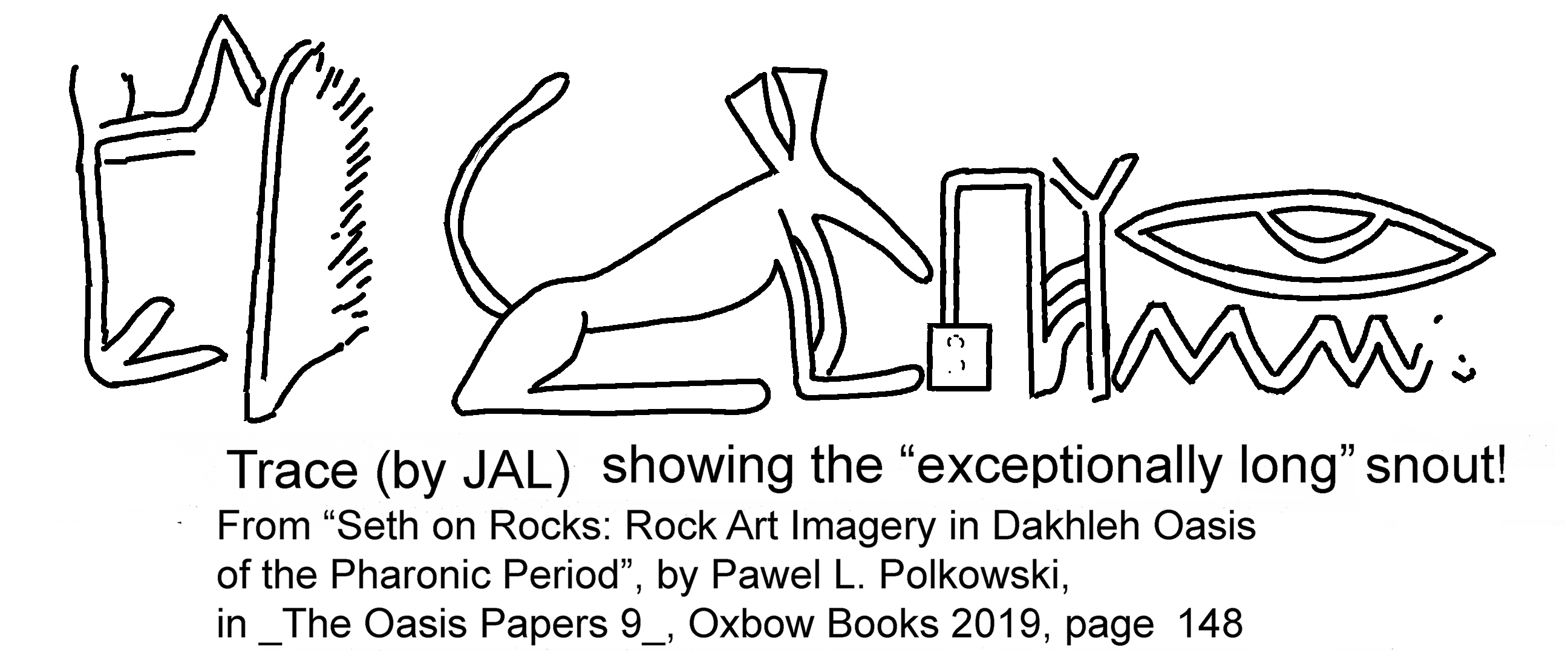 The significance of the inscription is beyond the scope of this paper, but it has been mentioned here because of the Seth animal hieroglyph it incorporates. The creature is shown in a prone position, its tapering body gently curved and its canine shape is canonical iconography of Seth. Another such feature is the ears which are flat-topped, albeit drastically tapering; compare the New Kingdom Seth animal/sphinx now in the Hermitage Museum (no. 5810; Taylor 2016, 609 figure 3.6.242). The raised tail is curved, which is a rare feature but attested elsewhere in Dakhleh (nos. 3,5, 10a, 12k 16c, GS1-3 here); and Kharga (graffito no. 8a from Seth Rock; Lazaridis 2015, 331 figure 6). The tail may represent a club (Taylor 1016, 272). The figure is hieroglyphic in style, except for one attribute: the muzzle, which is exceptionally long and to the best of my knowledge is unparalled in the iconography of Seth." - Polkowski, page 149
