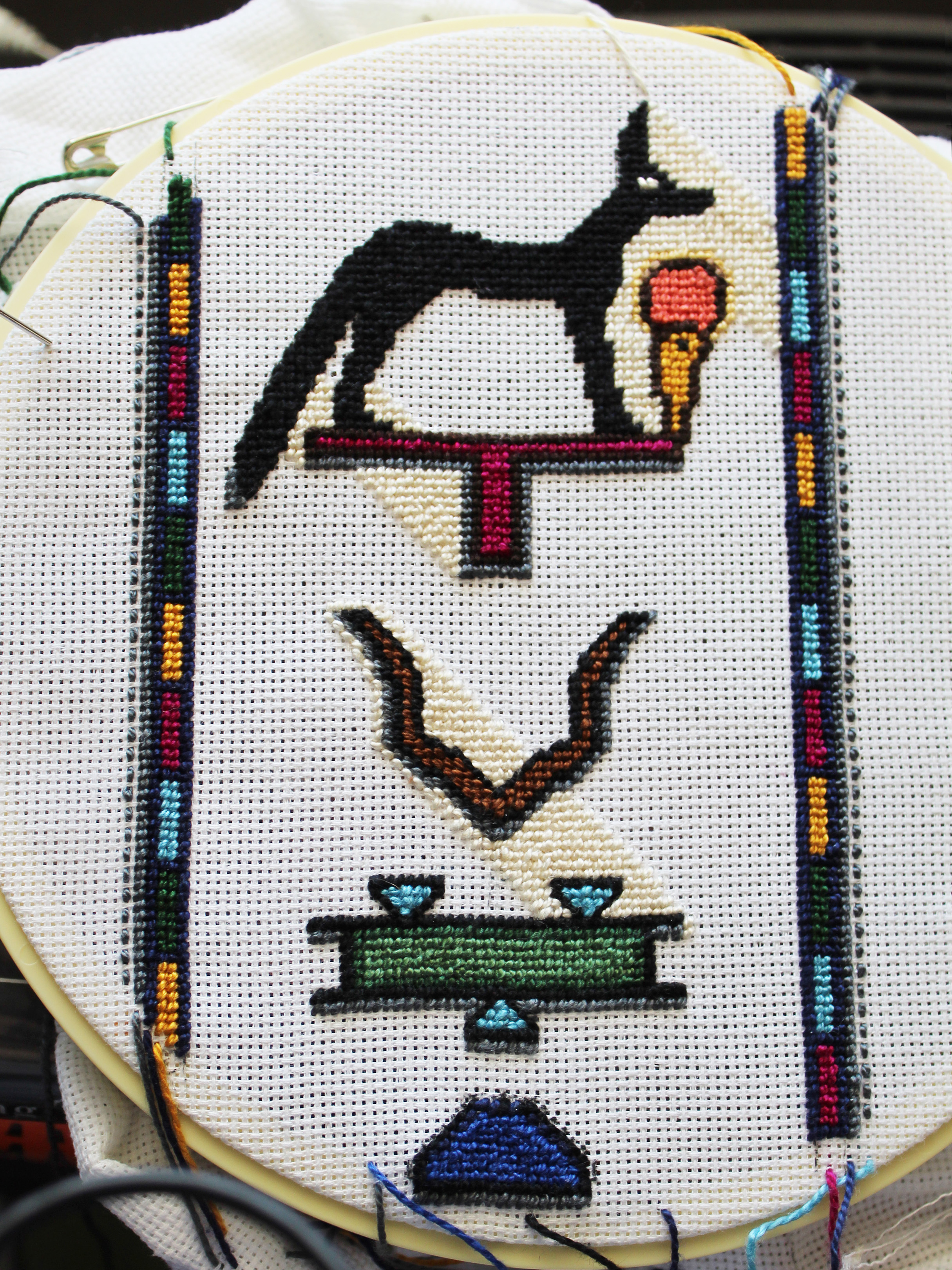 "I'd been curious about the uraeus goddess who accompanies him on his standard. She can occur alone or as a pair. She/They are sometimes shown wearing the crowns of Upper and Lower Egypt. She is clearly an "Eye of Re"..." I wrestled with numbers on the border, trying to get it to 'flow' right. Horizontal color blocks will be seven 'pixels' long, two intervals of reddish purple, gold, dark green, medium blue..... Vertical 'bricks" had to be eight 'pixels' long....