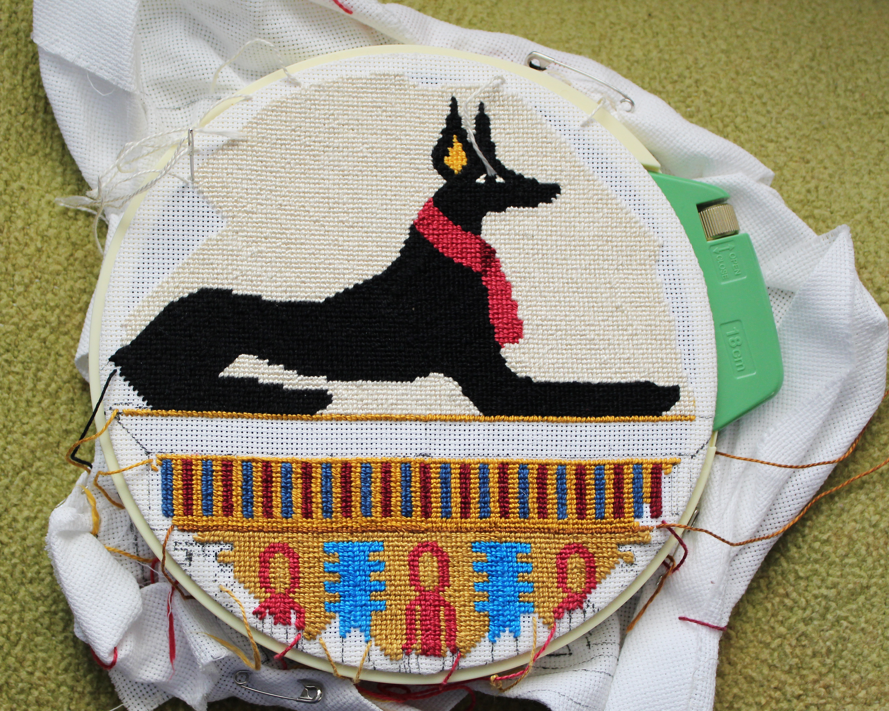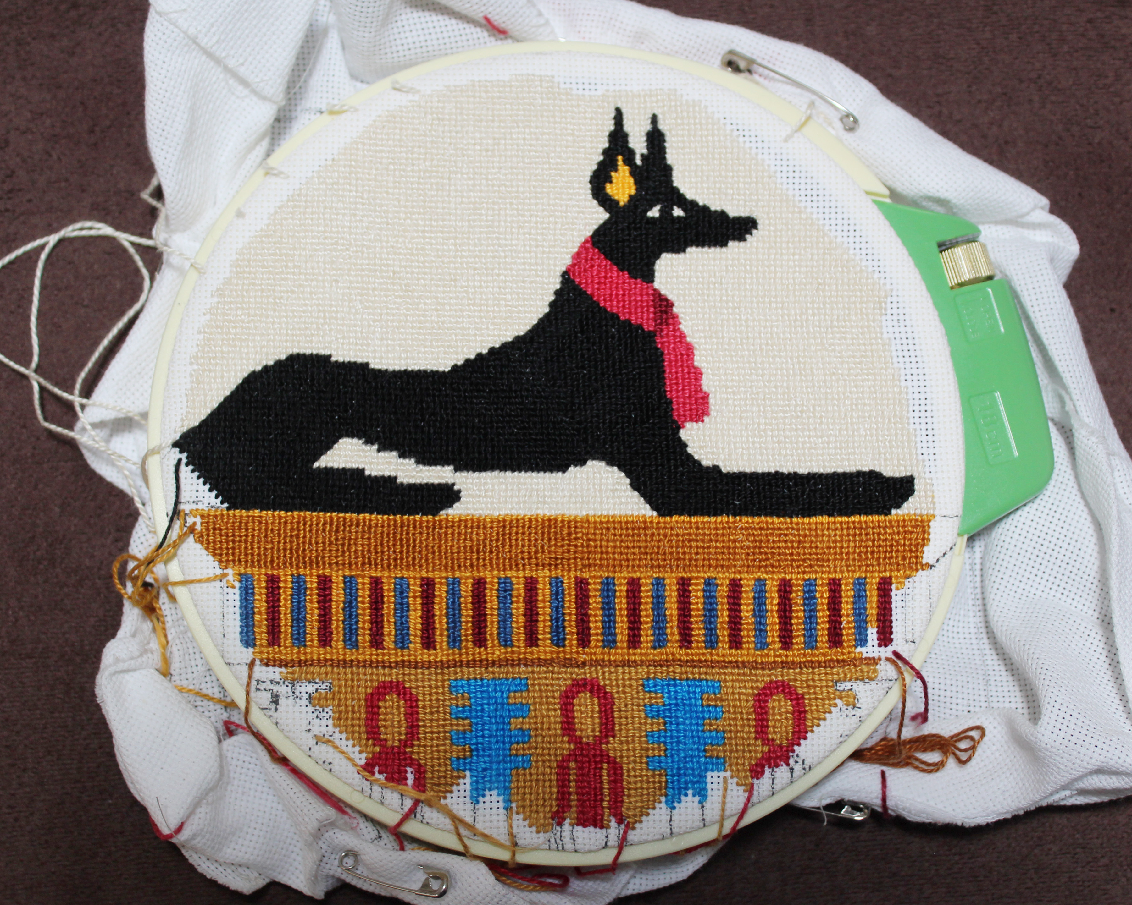 And now I have two!. Project no. 2 was started, because the wait for the arrival of needed needlepoint yarns has been so long. I did hear back from the DMC company, my orders with them will arrive next week. Impatient me set about looking elsewhere, meanwhile. I did find a twelve-pack of the cream #712, needed for both projects, via an Amazon source. Scalpers raised the price of the dark gold #782, however. No, NOT going to pay triple price! I did find a discontinued #781 via an embroidery shop in Utah. If DMC numbering is consistent, this should be a tad darker. Possibly, it may prove better? Meanwhile, this is the image of Anubis I printed out and placed under the grid paper: