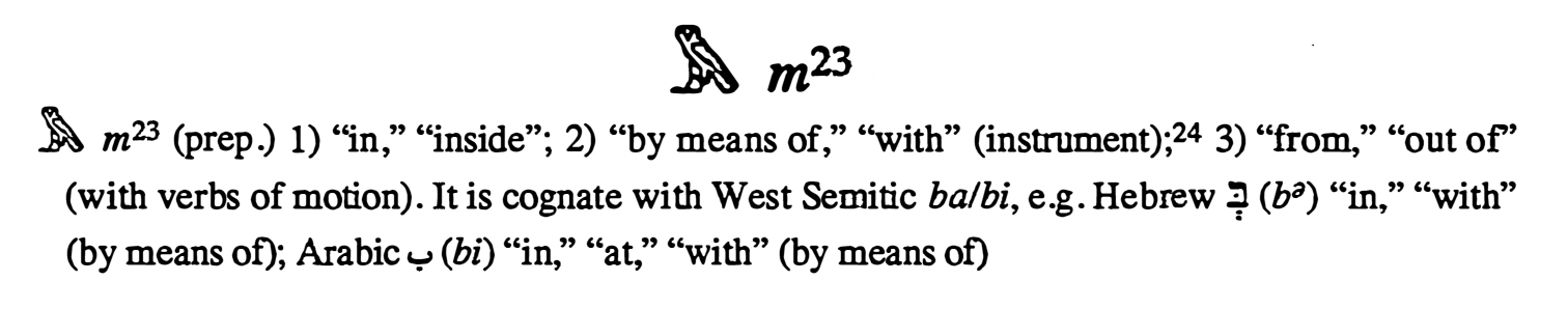 ![]() Ankhieptah... ![]() The owl glyph, "m": in, inside, by means of, with, from.... (From Middle Egyptian Grammar by James Hoch) Perhaps we could also say, "I live by means of Ptah", understanding that to be with his aid.