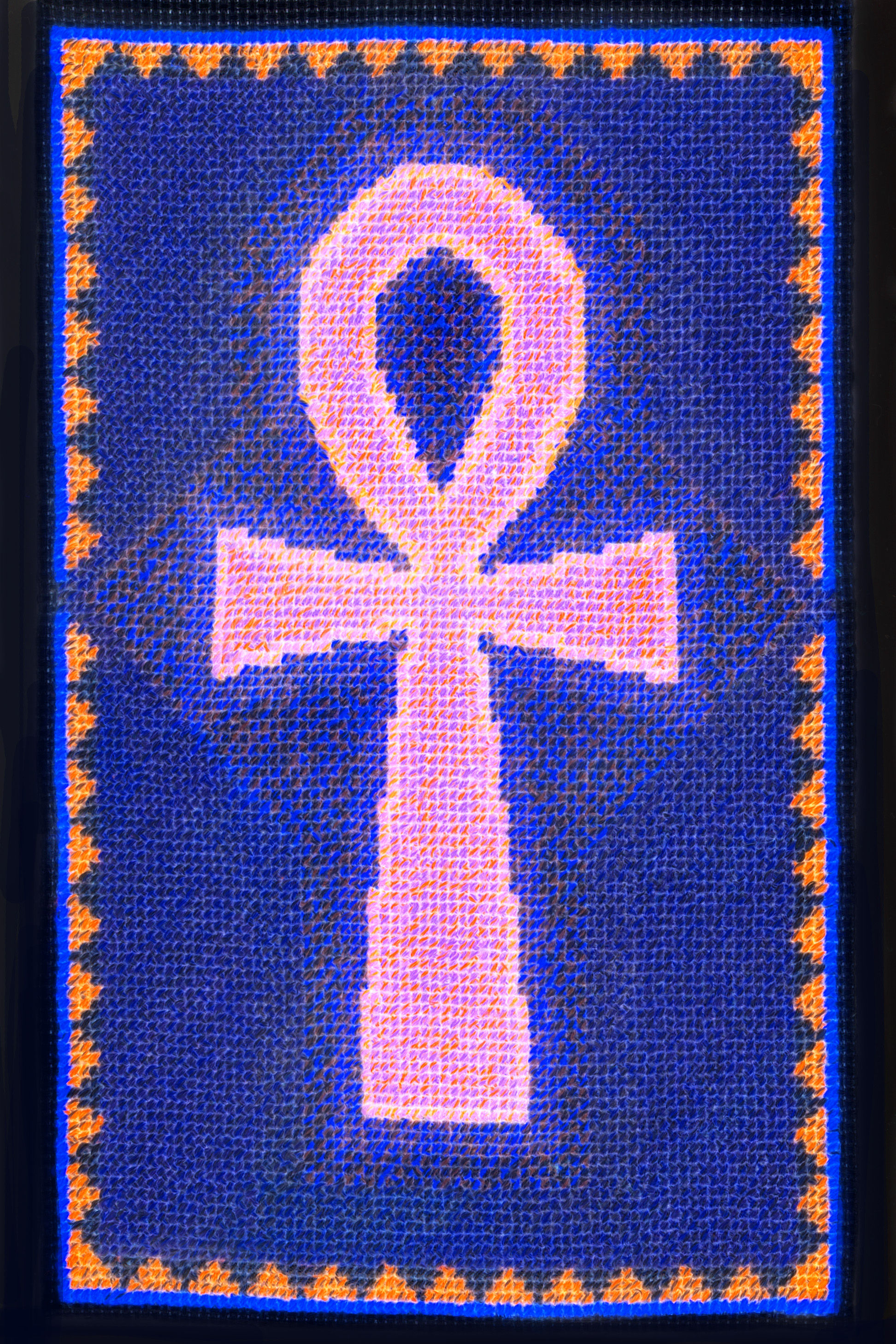 This is cross stitch tapestry, three strands of embroidery thread criss-crossed, but filling each 'pixel' of the 18-grid canvas.