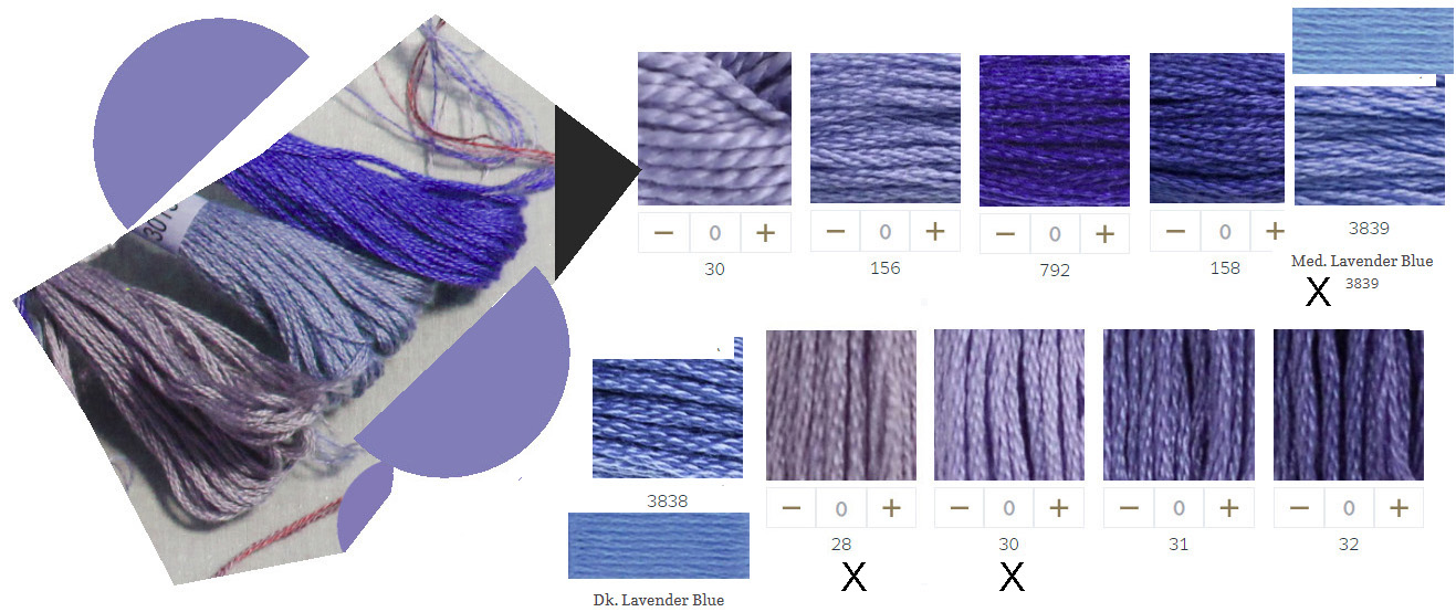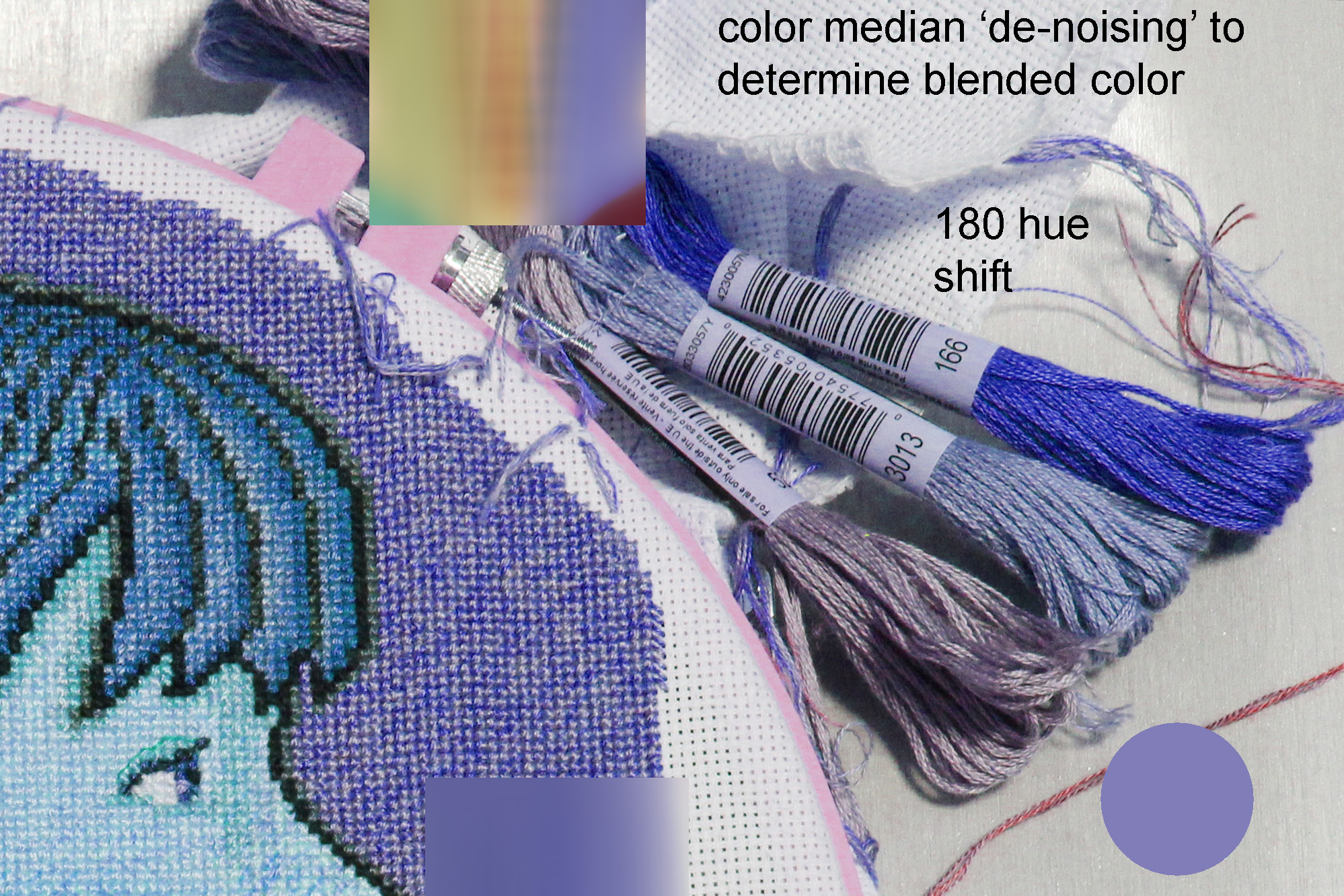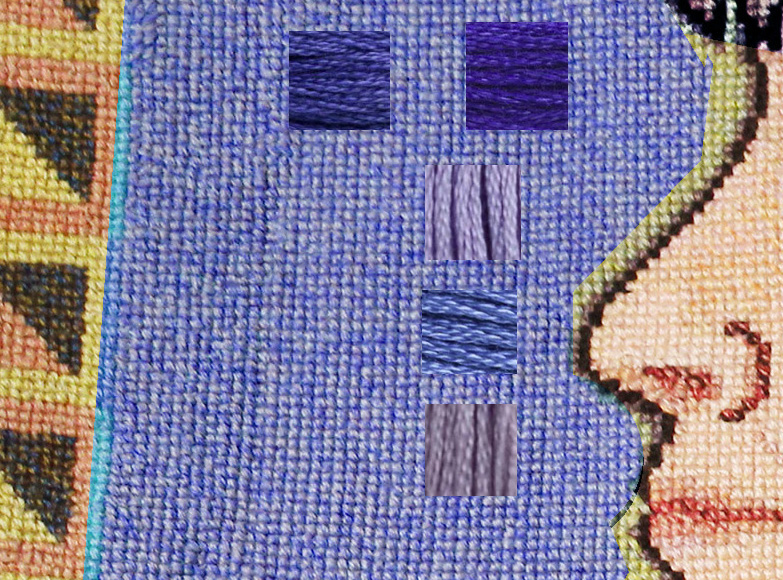 The purple background is a 180 degree hue shift (using Photoshop's "Hue/Saturation" tool) of my greenish background, (to be 'opposite, but complimentary'). The maroon garment color is a darkened version of the muted dark pink that happened with the original 180 degree color shift. Maroon is one of Julia's favorite colors (as the deep turquoise is mine), so again, there is the 'opposite, but complimentary' effect going on. Her border is a only slightly color shifted version of my border. In this shift, the gold turns more greenish, which echoes better with my green background. (See left color sampling pair.) The light tone of this greenish color echoes the light skin tone. That color shift also made the pink part of the border more cool toned, and more similar to the cool tones of the dress color. (See right color sampling pair, the lightened dress maroon beside the pink border sample.)