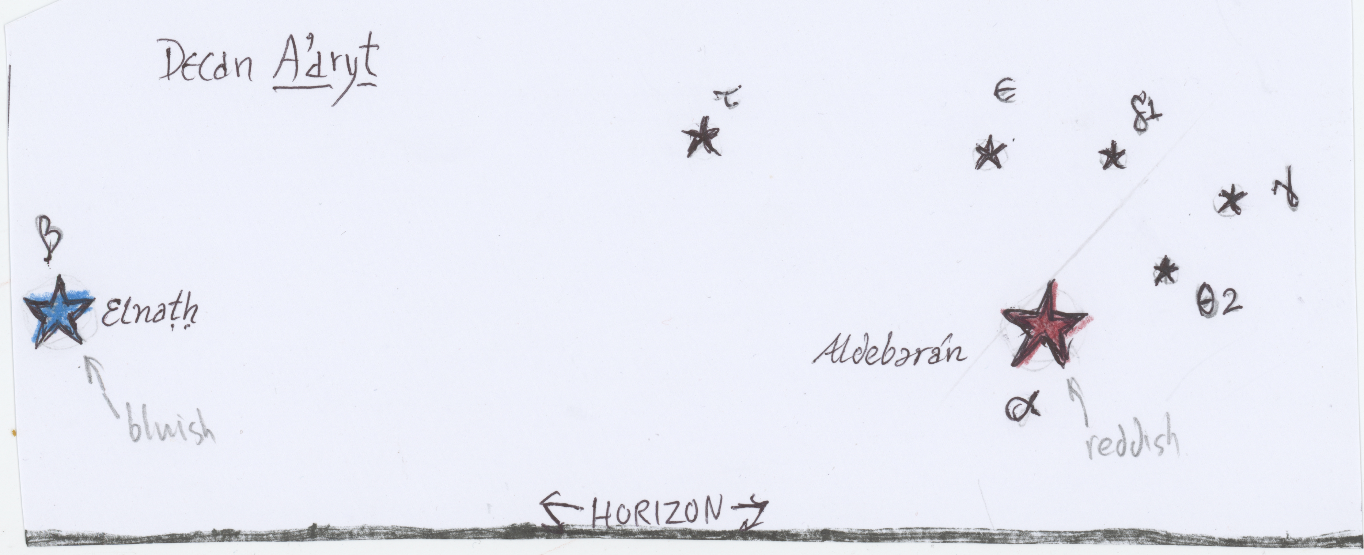 Julia had a special request for this art work. They are the decan of the 'jaws' of Taurus, the 'jaws' being 'A'aryt' in Ancient Egyptian, (Source: _The Ancient Egyptian Daybook_, by Tamara L. Siuda, page 319) These stars were the stars rising at the moment of Julia's birth.
