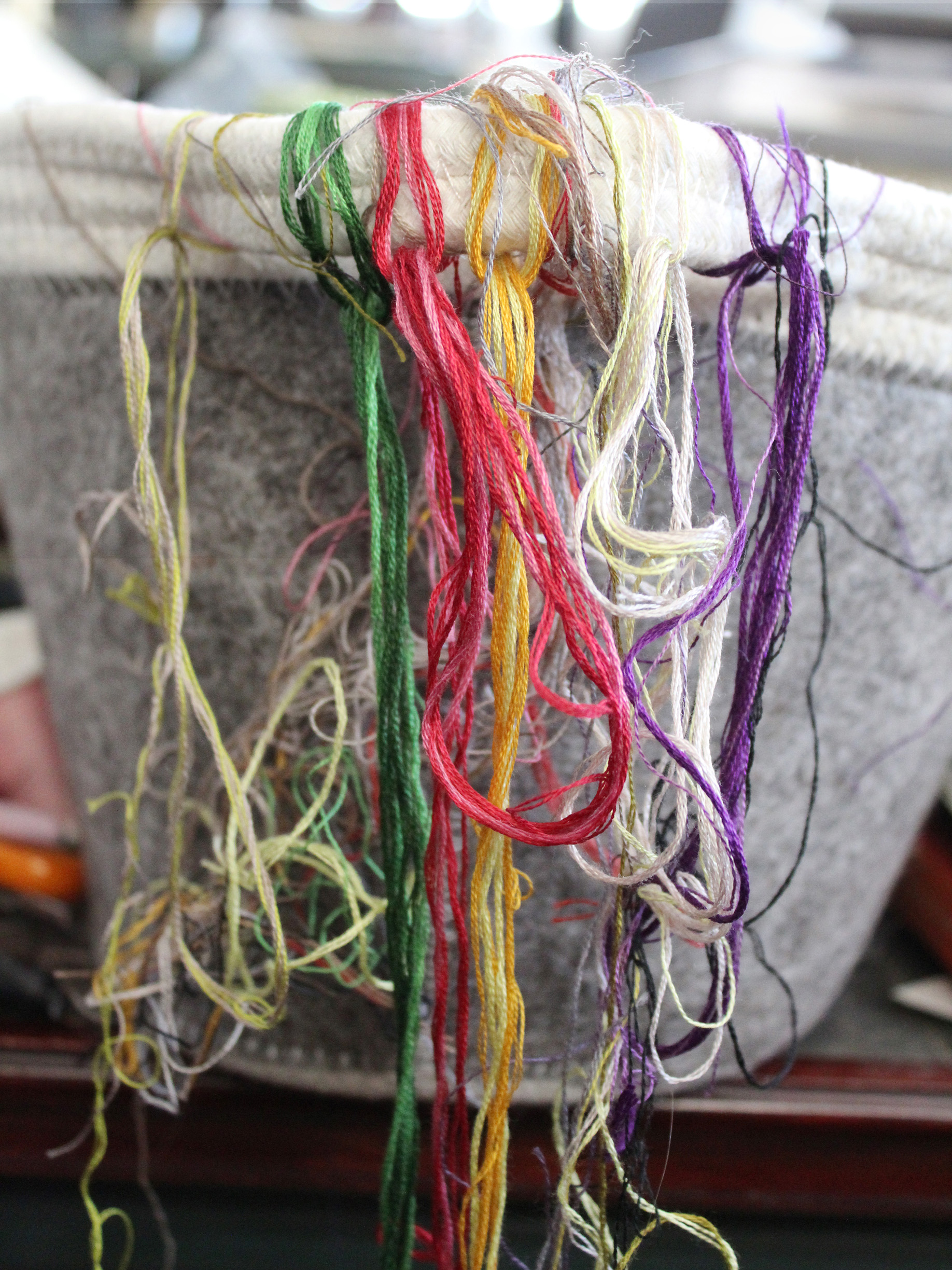 Threads loosely organized on the handle of a basket "Jewels" are two strands of the darker color, one of the lighter color, (cross stitch).