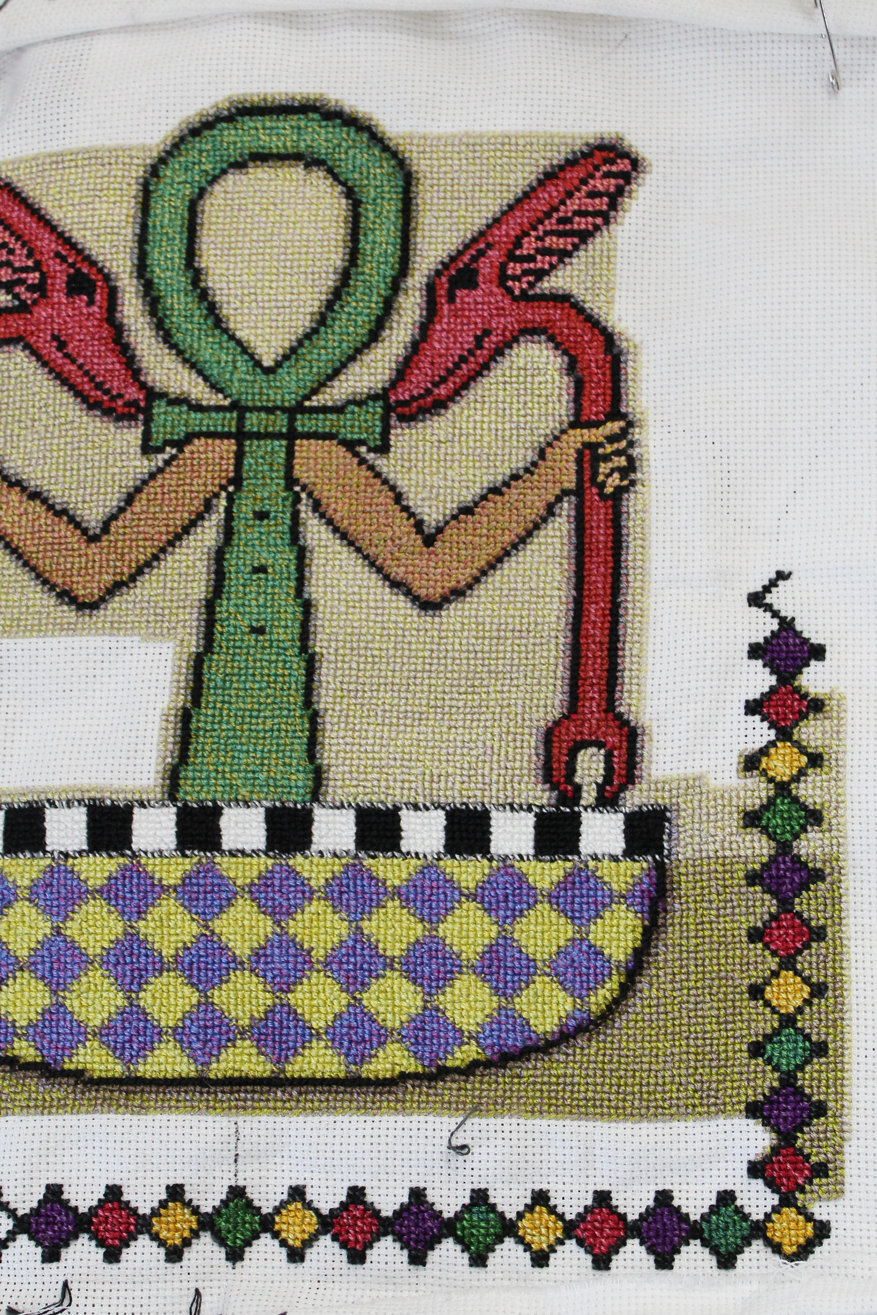 Monday, June 28, 2021 Progress on Neb-Was-Ankh Tapestry II 3:26pm Based on the ankhs at Kom Ombo. Threads loosely organized on the handle of a basket "Jewels" are two strands of the darker color, one of the lighter color, (cross stitch).