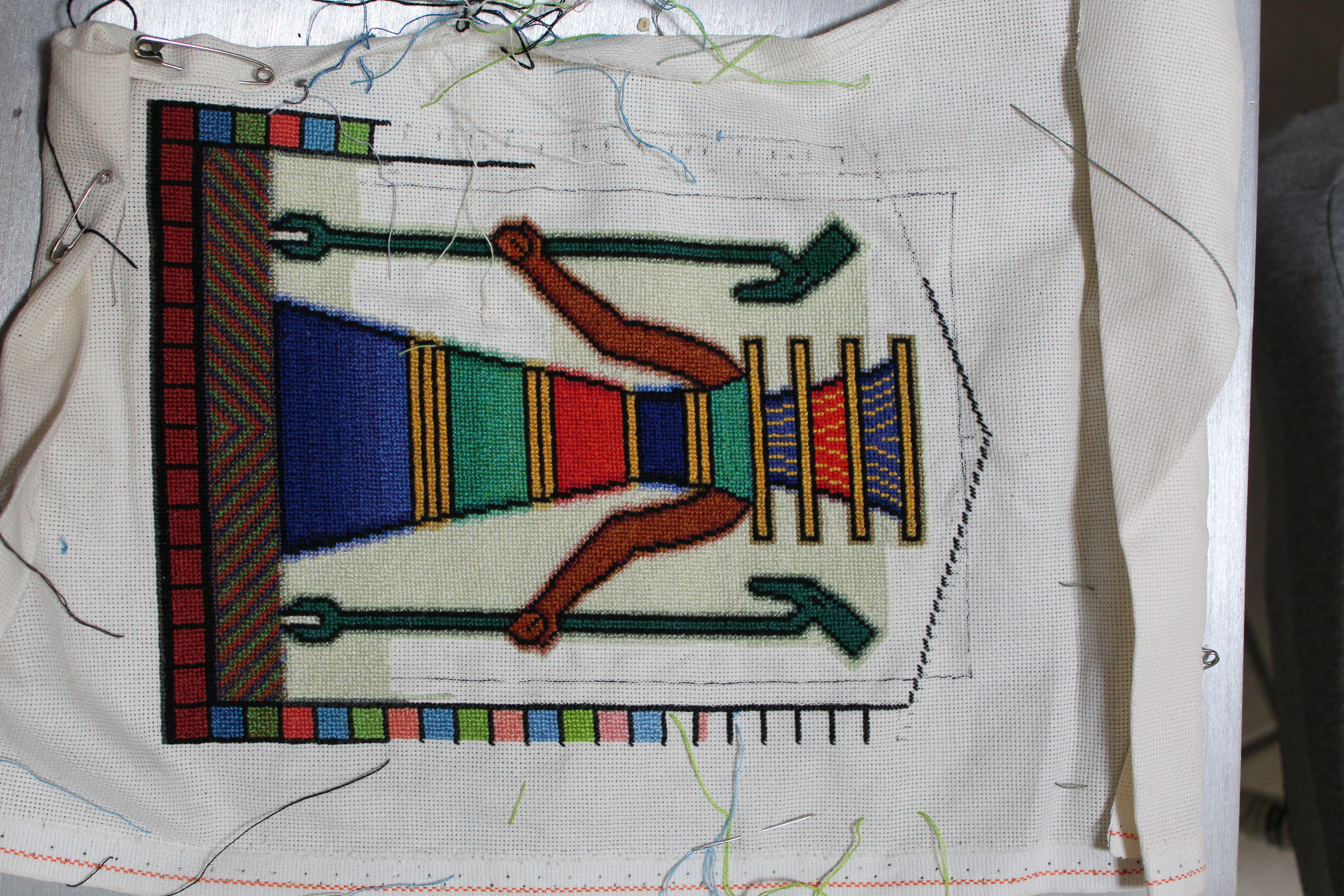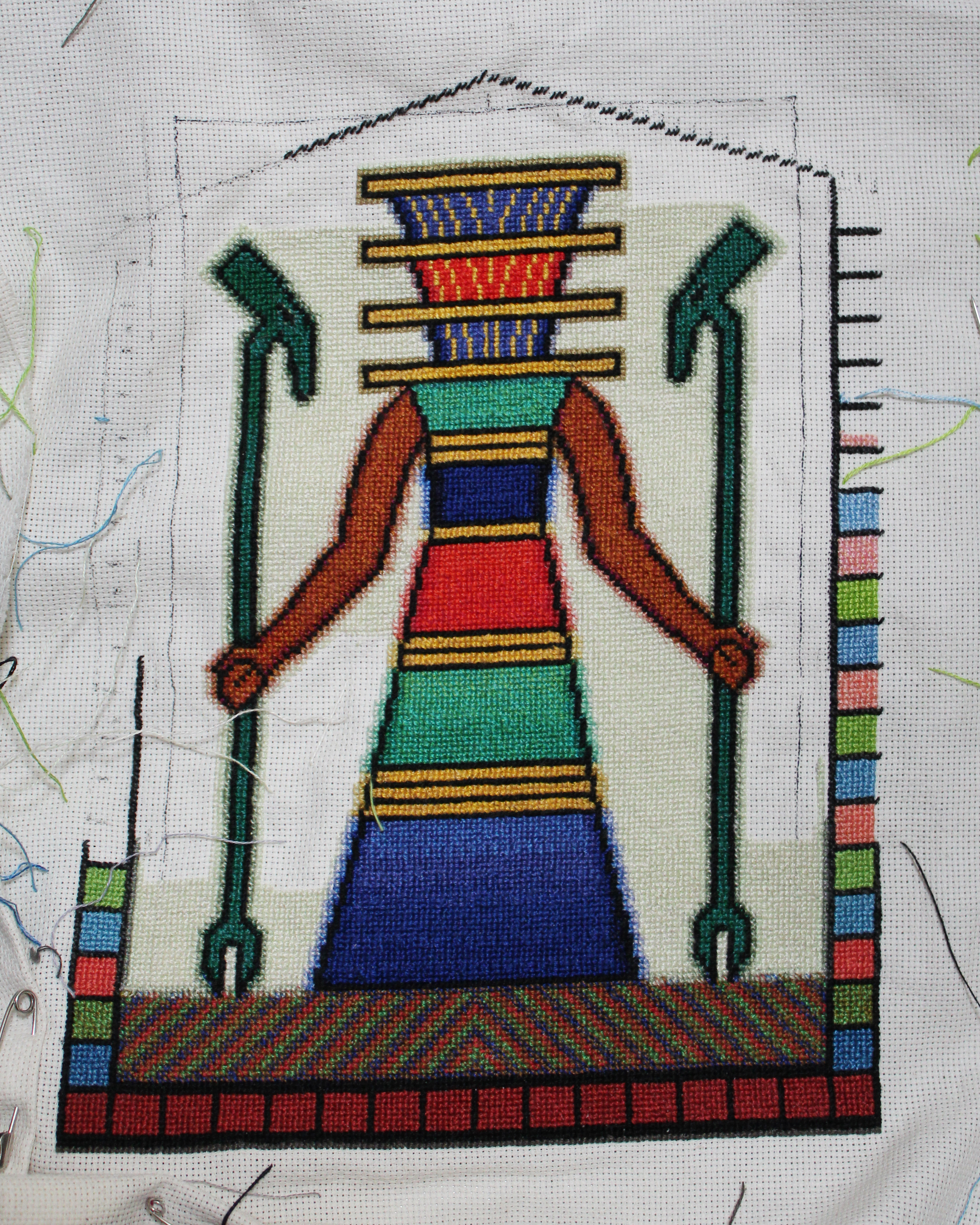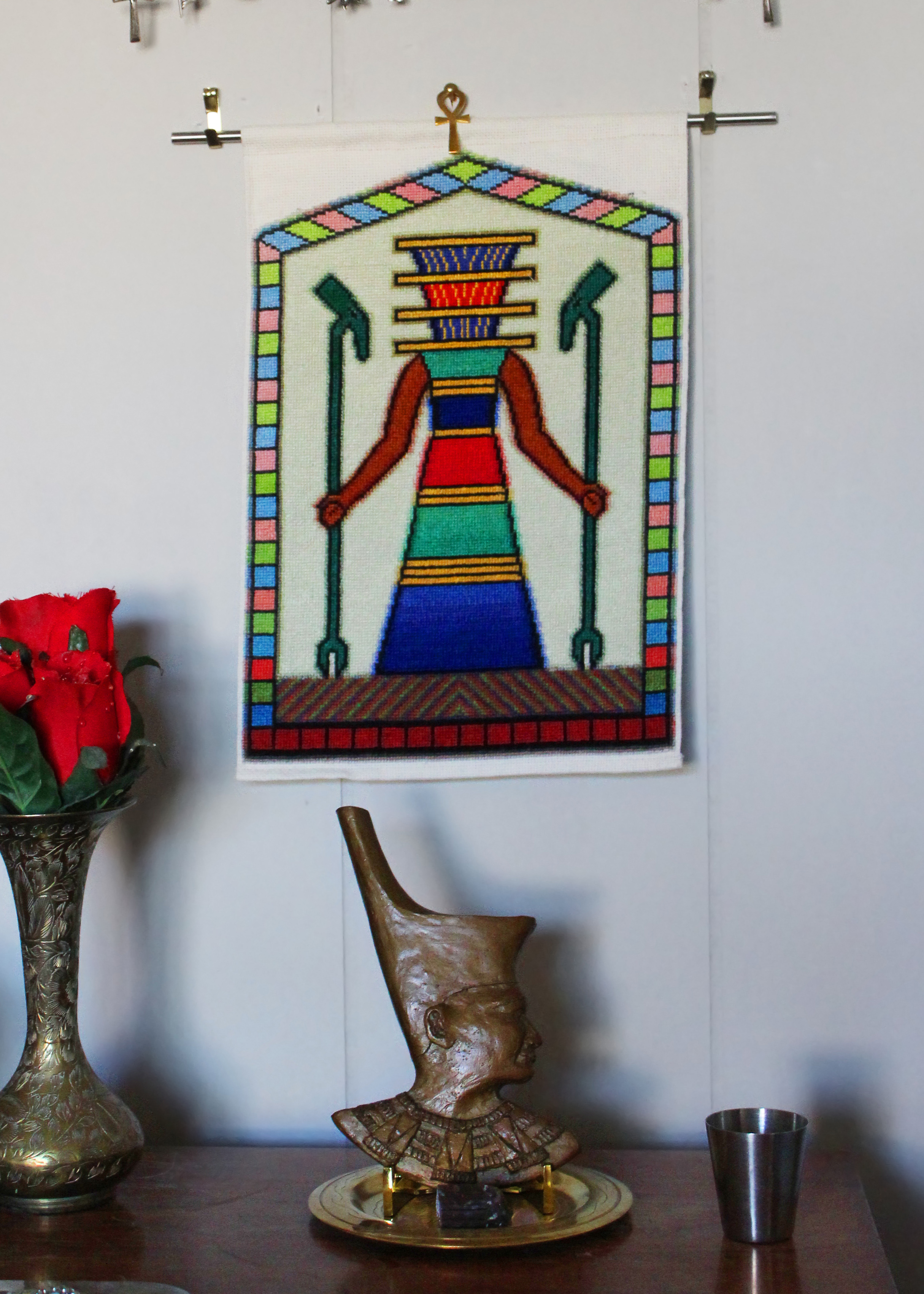 The Djed pillar symbolizes stability, in ancient Egyptian art. This is the third fiber art rendition I've done of the Djed that's found in Queen Nefertari's tomb. The previous two were done in needlepoint, rather than cross stitch tapestry. Also, with this one, I'm attempting to use abstract elements to convey 'stability'. We have a strongly weighted base, for instance.