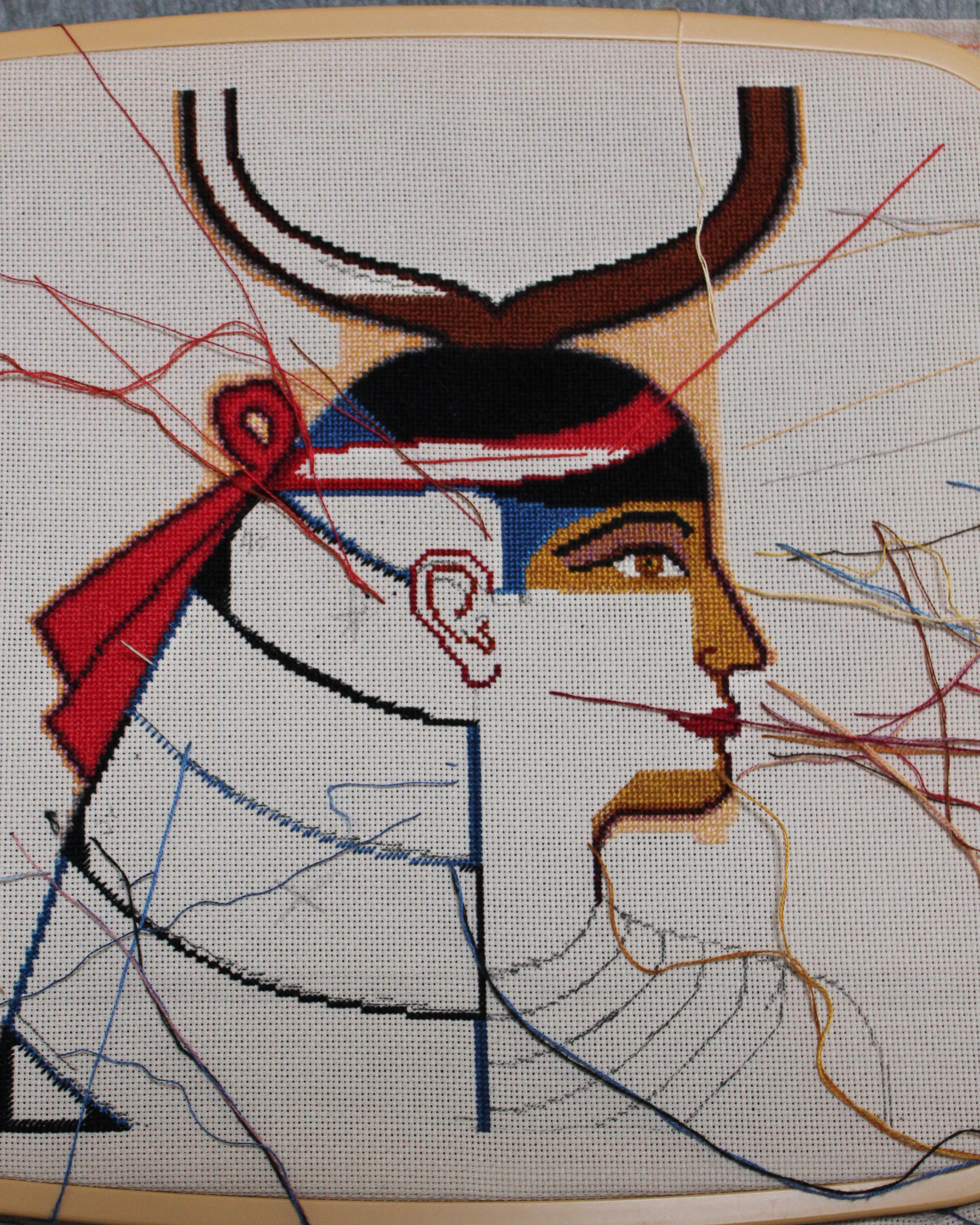 This is my third attempt of this scene from Horemheb's tomb. The first is mixed media trace print/colored pencil. The second is a small needlepoint on 18 grid aida. This one is cross stitch on 20 grid aida. The greater "pixel" count is allowing much more detail than my first attempt. This version is departing from the colorization of the earlier pieces to have golden tones. I'm excited to see how she evolves.
