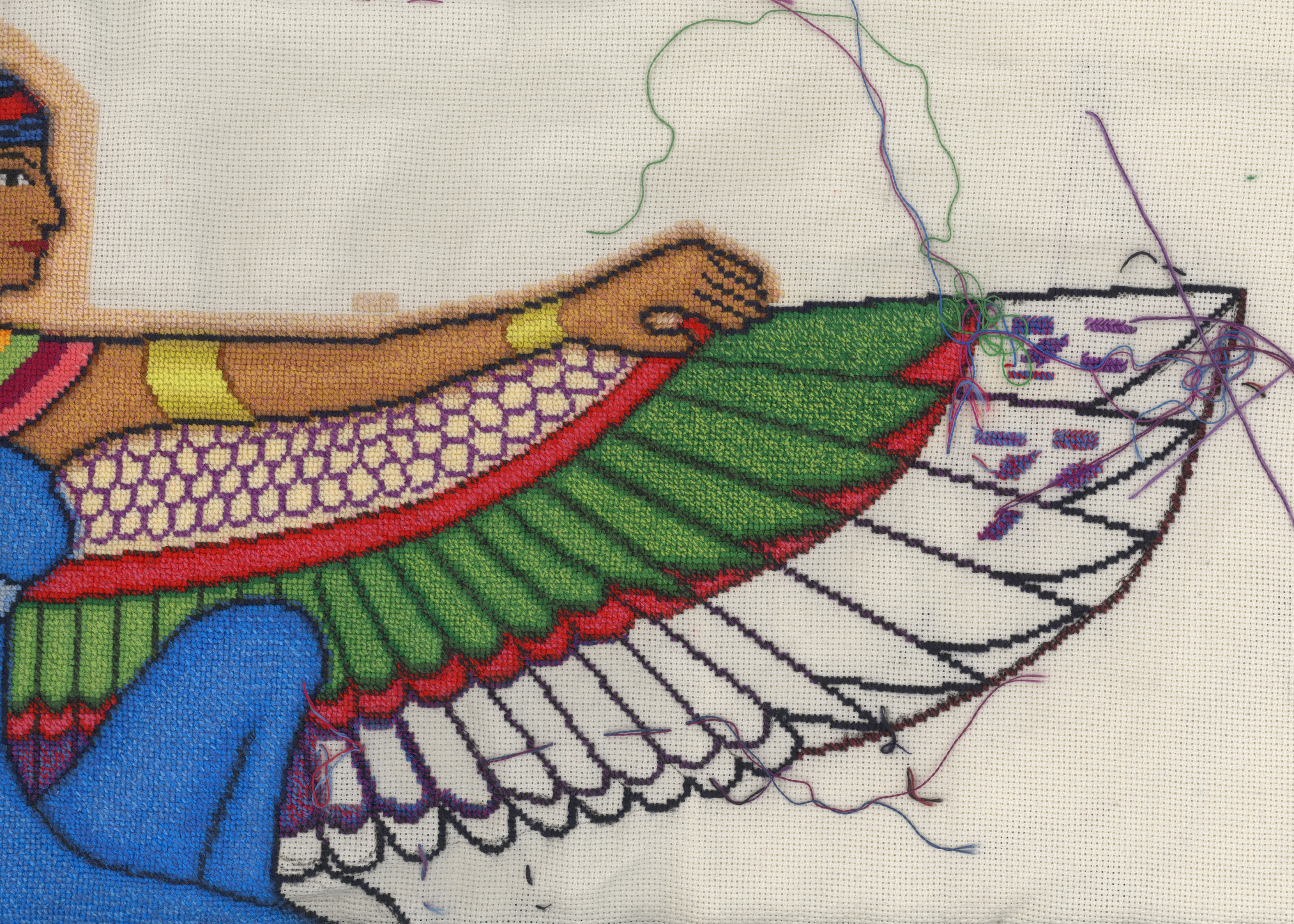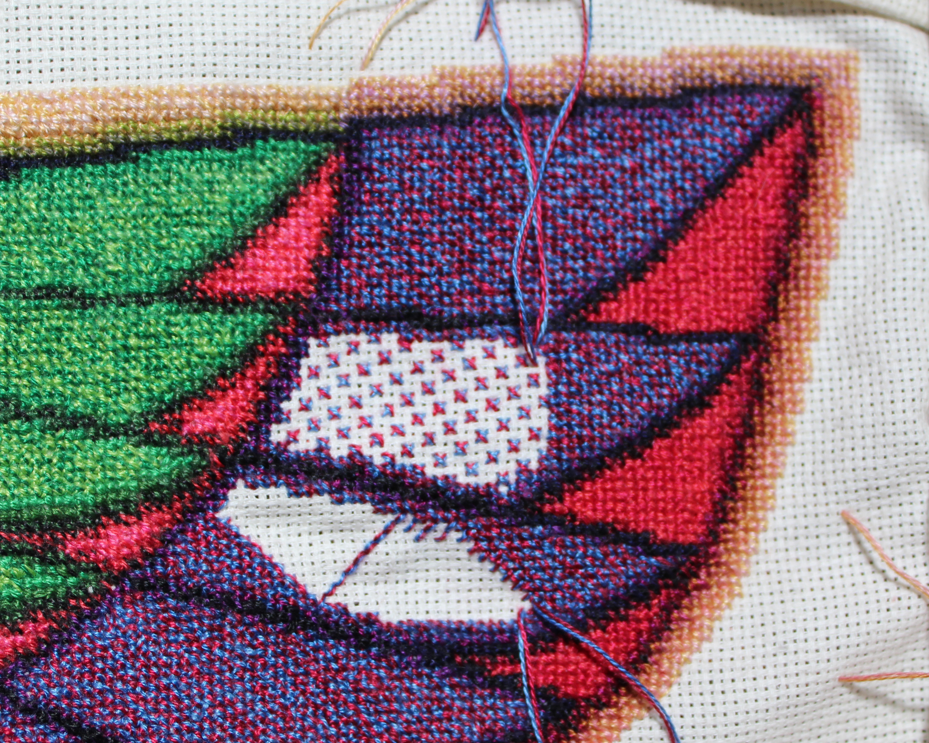 (Top two feathers 1/4 826/304 blend, 3/4 825/815 blend (DMC colors)