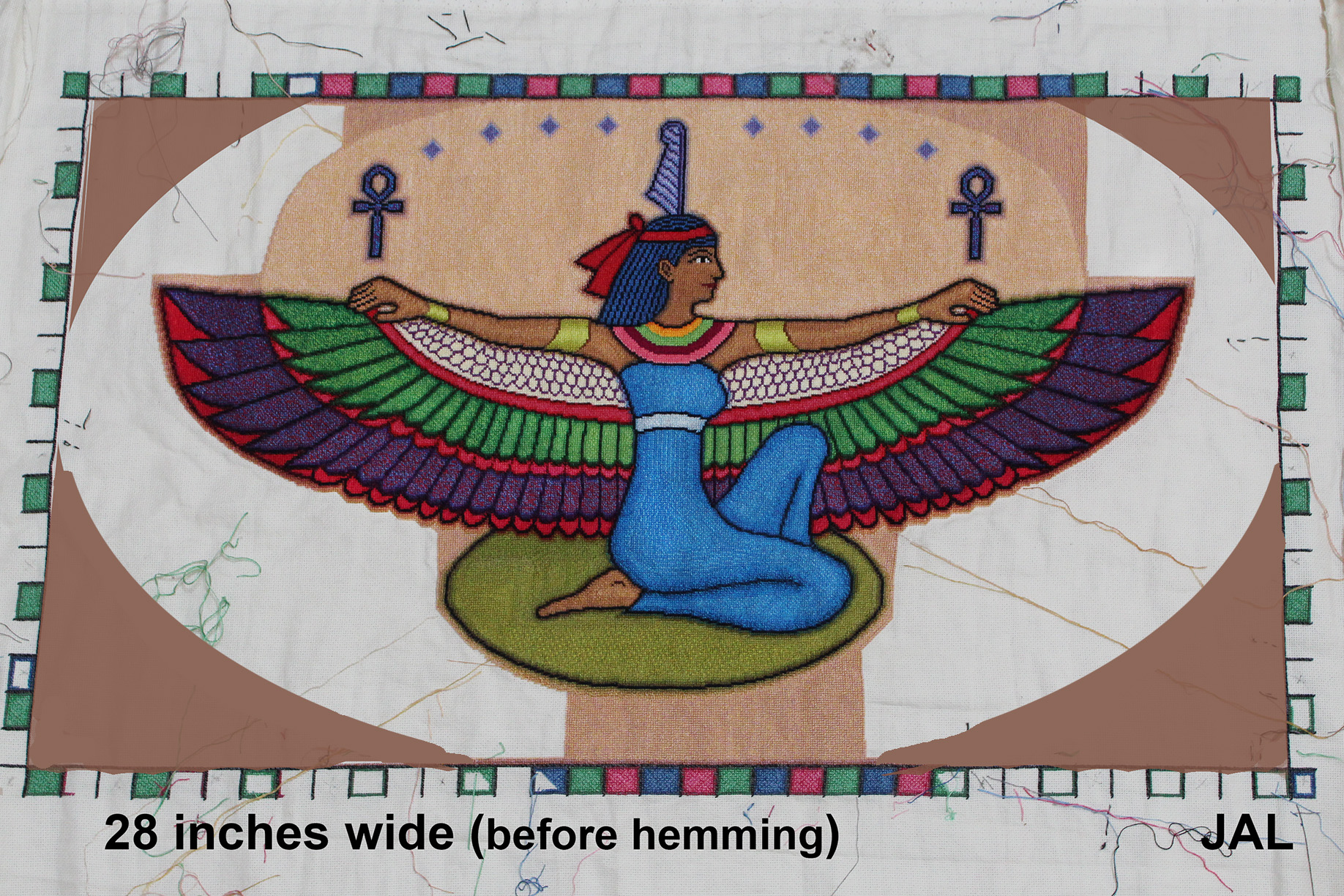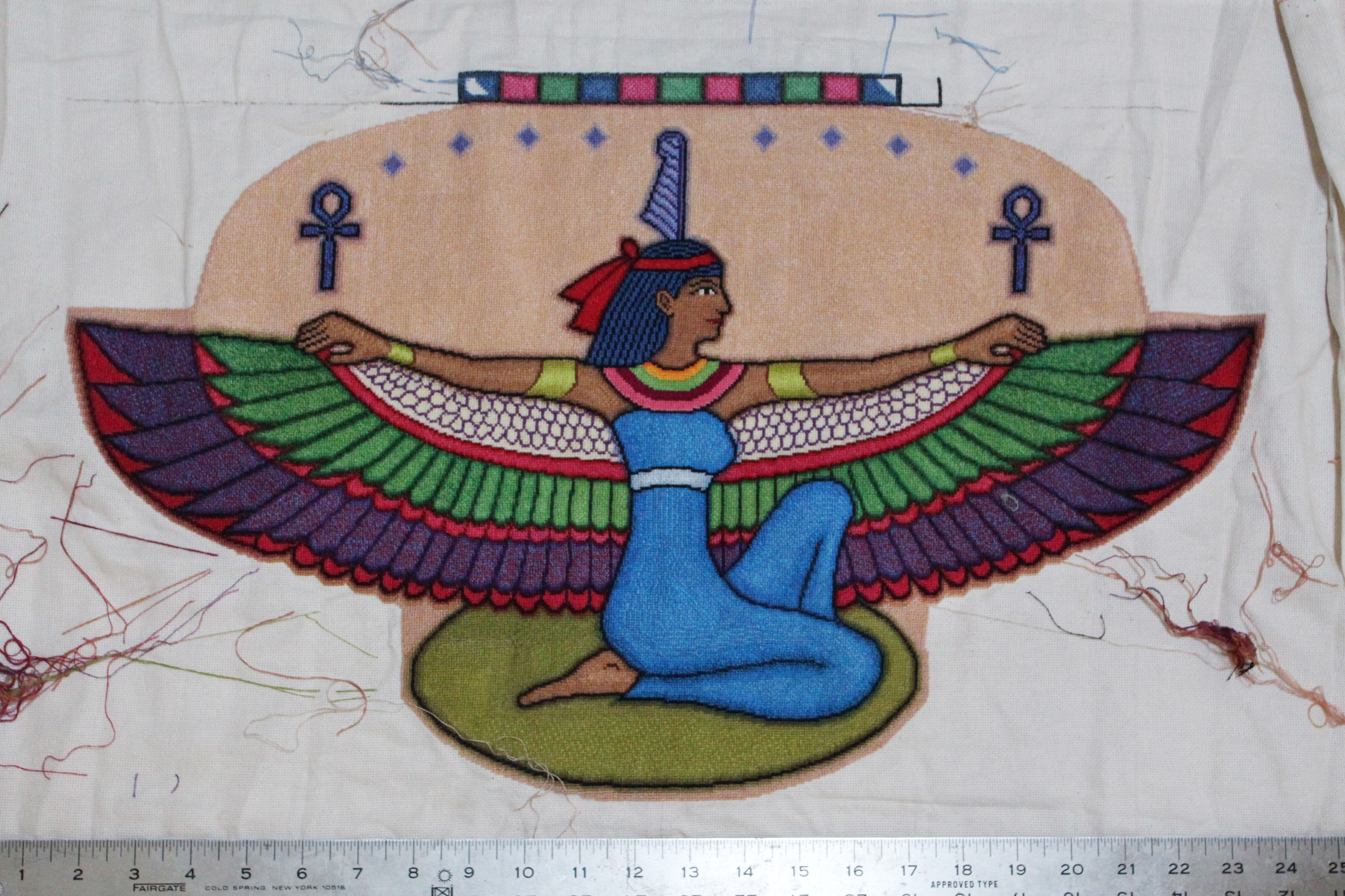 Monday, July 14, 2023 Wings are Done! 12:19pm It's been a while since an update: Above is the last progress photo of the winged Ma'at tapestry. It's been a long while, but finally, I have a new progress photo: Monday, September 18, 2023 Progress Photo of Ma'at Tapestry 12:19pm All five photos I took were blurry, this is the least blurry of the lot. Wednesday, October 18, 2023 Ma'at Tapestry has a Border in Progress 9:59pm Border is fully delineated.... (While waiting for more DMC 913 light green to arrive, I will do more of the bottom background....) Roughly figuring out the arc of the background shadowed areas....
