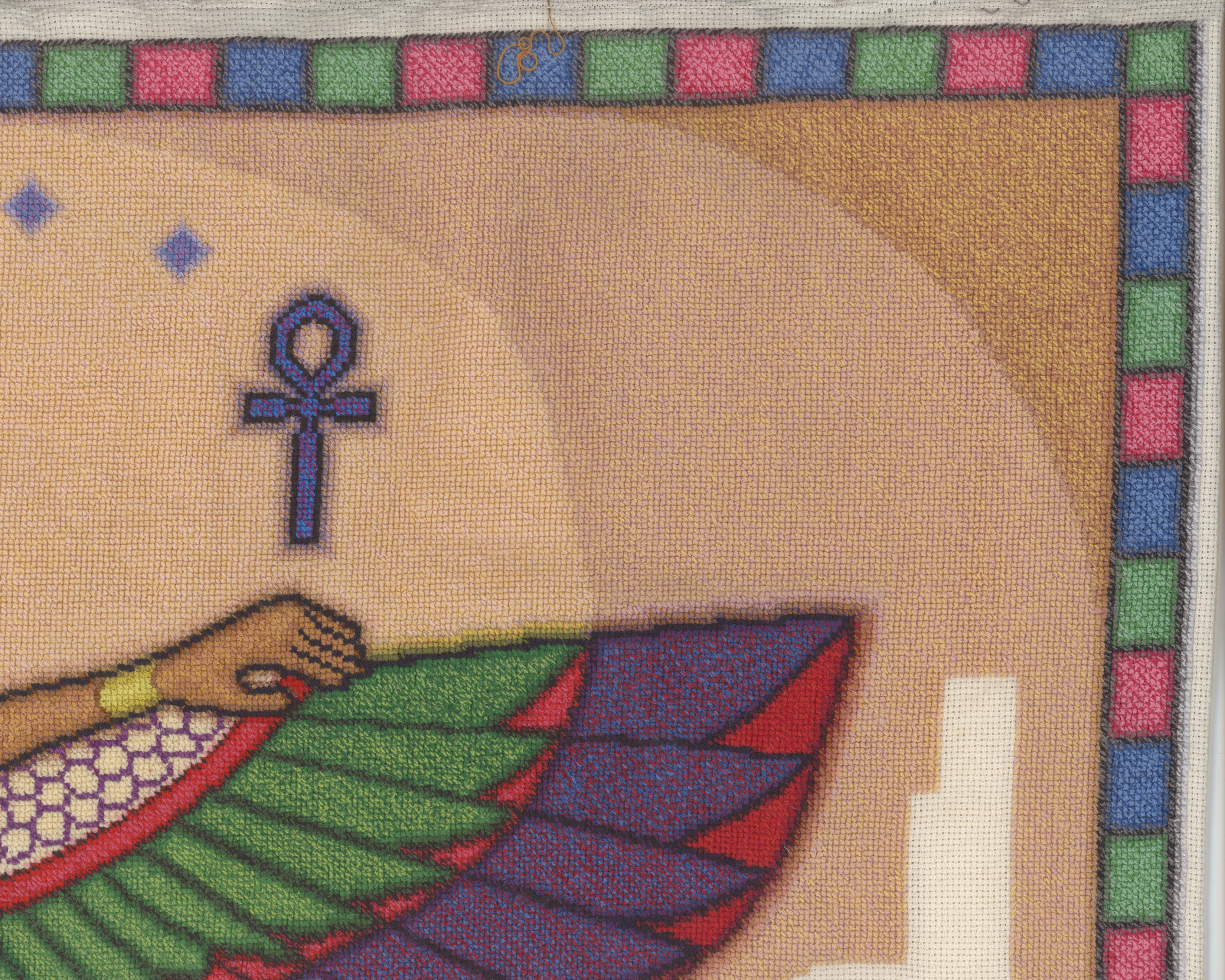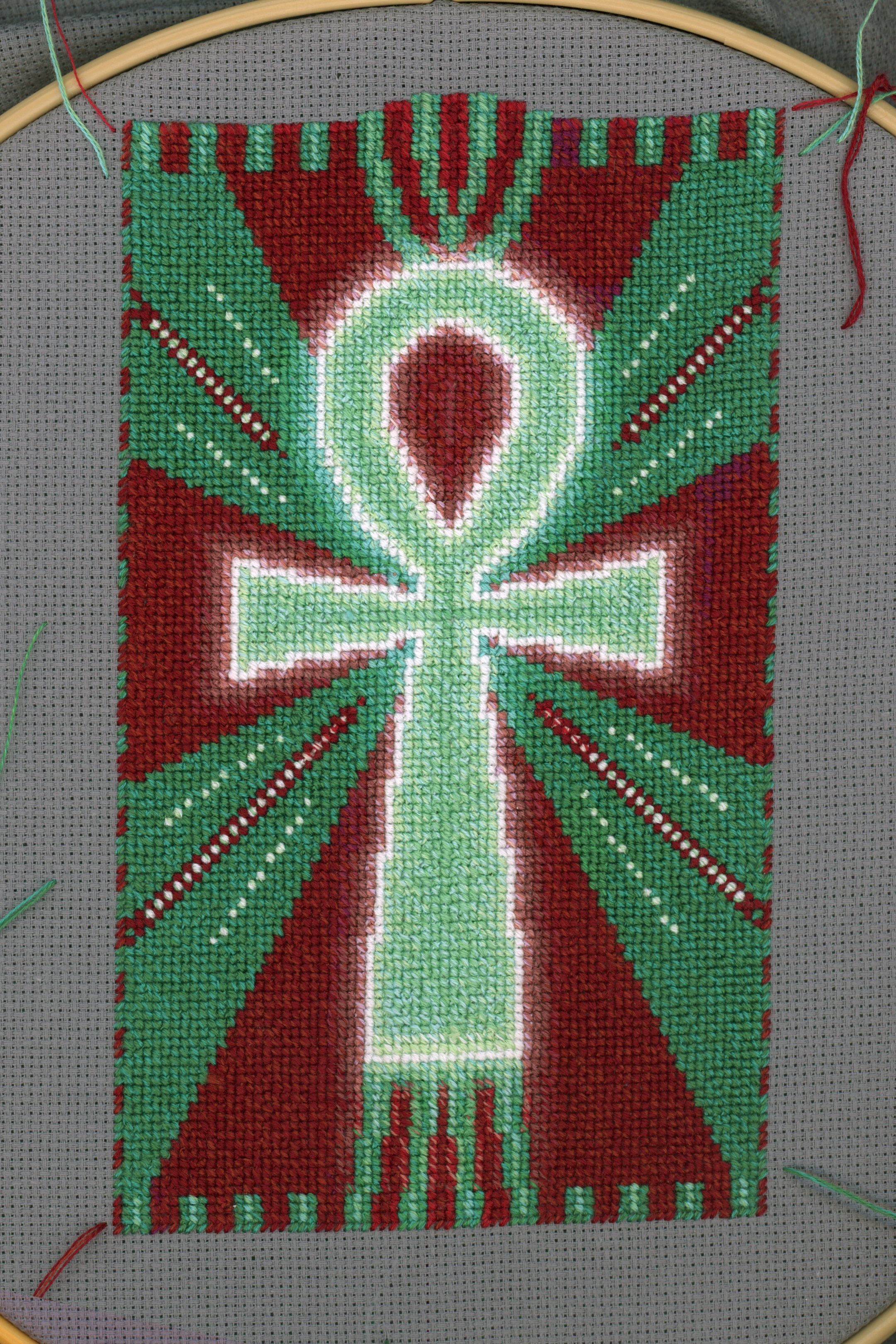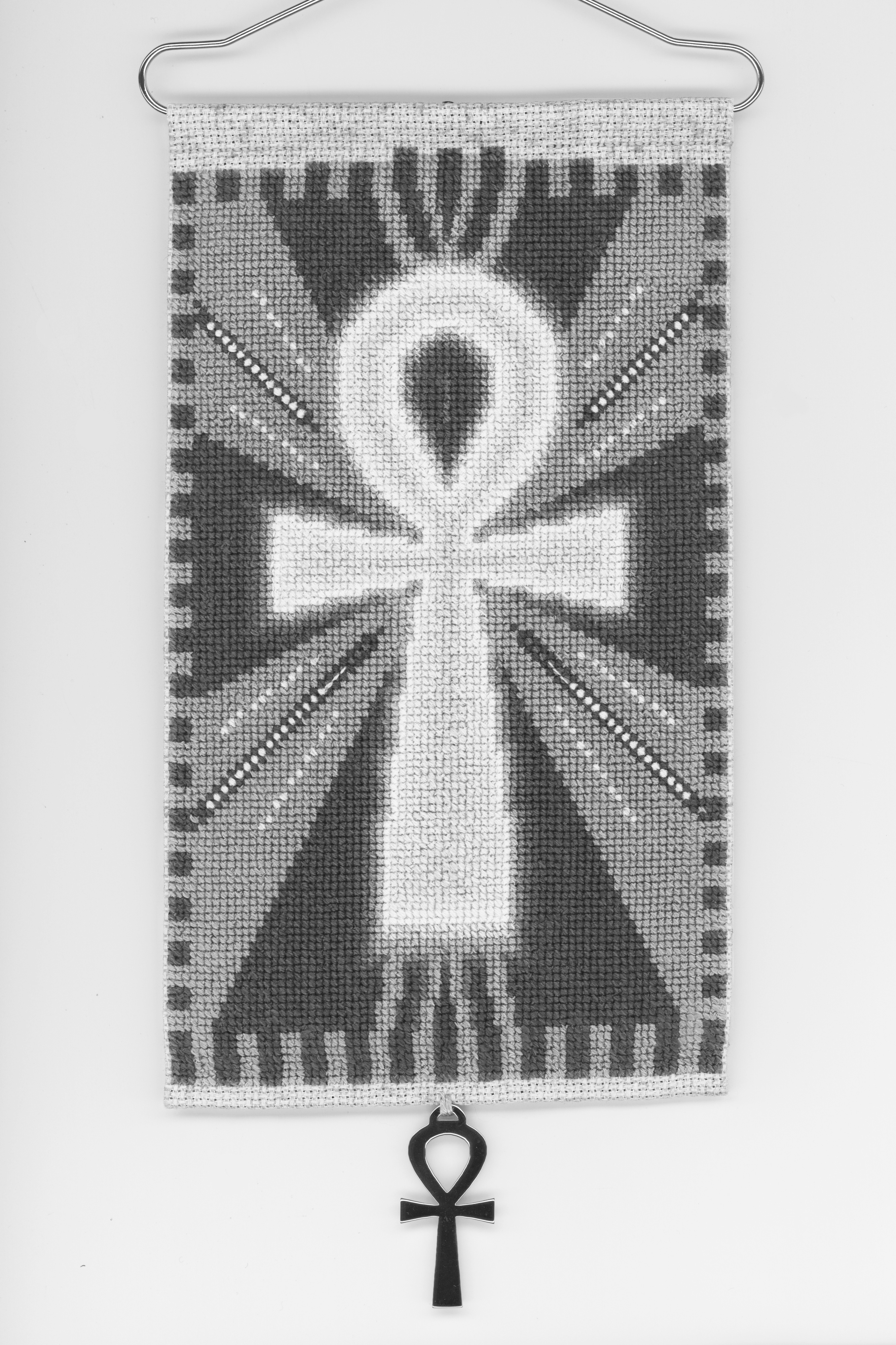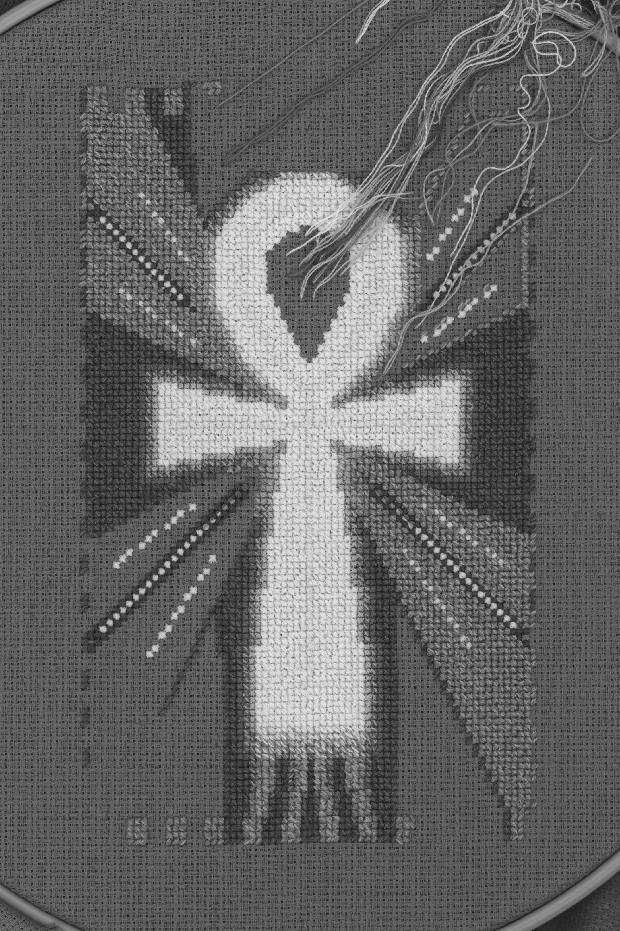Progress photo turned grayscale, the gold is darker than example, but this helps the ankh to read as "white"...