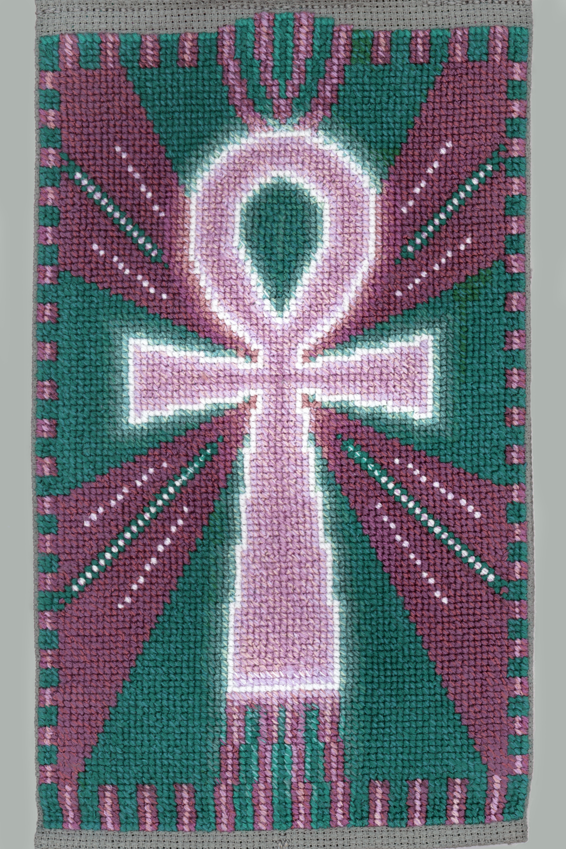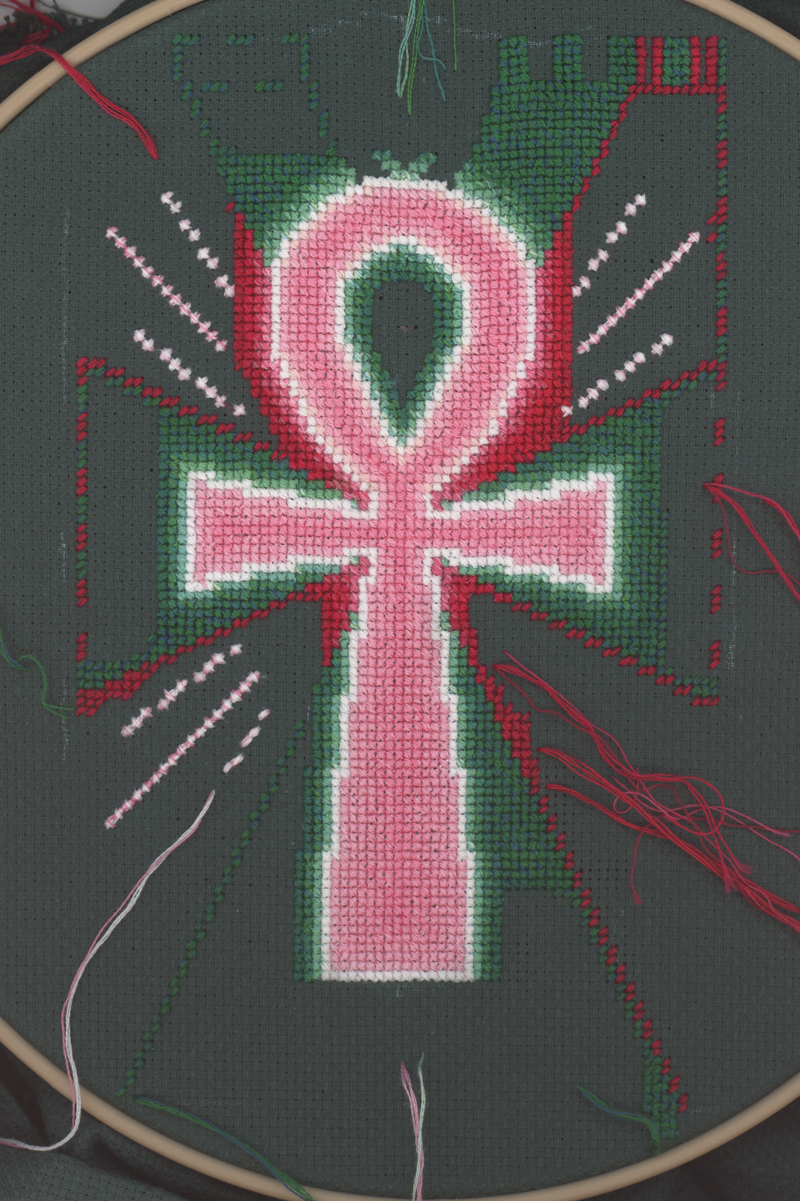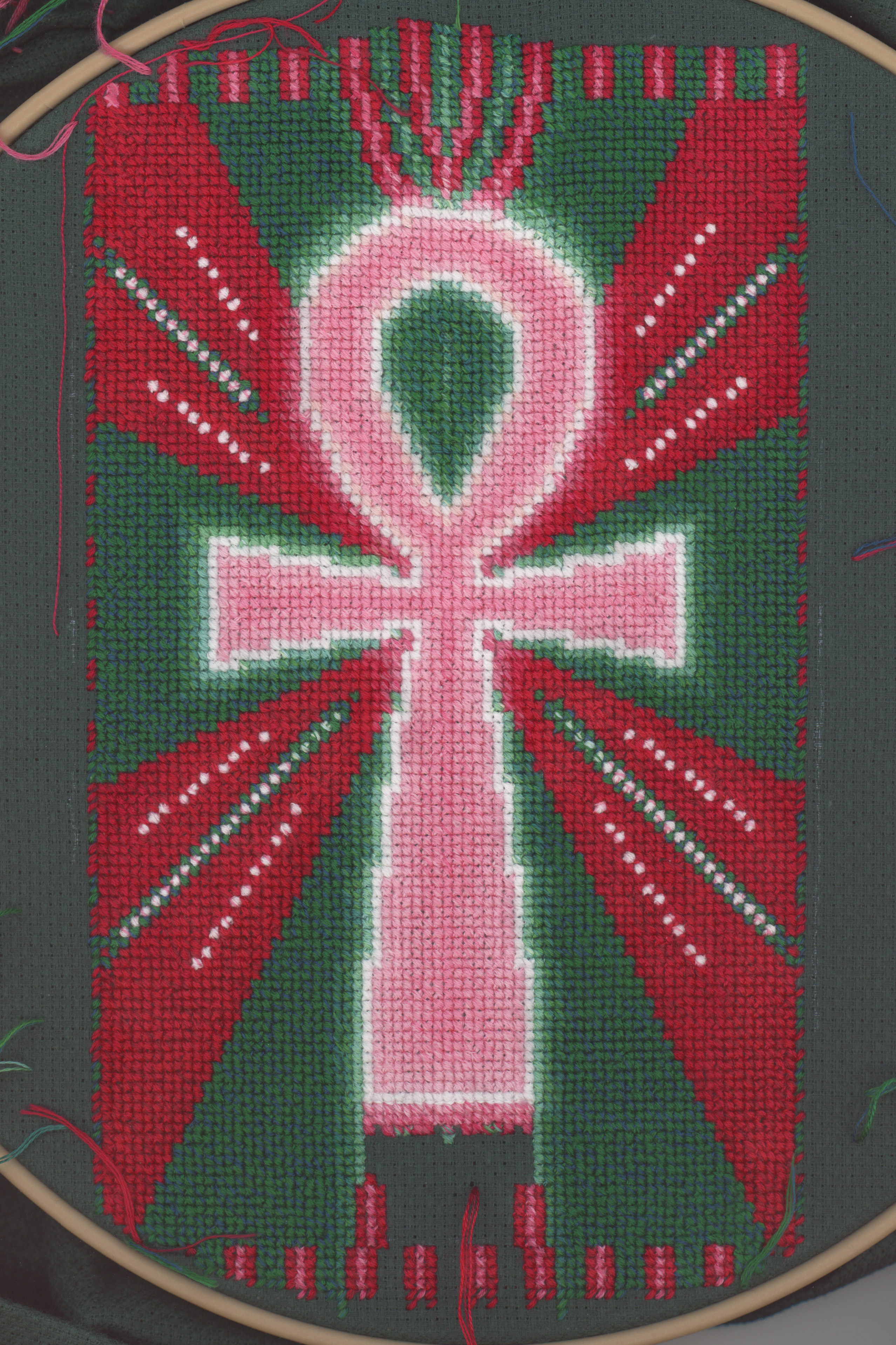 I had some dark green 14 count aida I'd bought earlier but not used, so I thought I'd see what this ankh pattern would look like in the larger grid. It turns out it will be around six inches wide, as compared to around four inches wide (4.25in) for the ankhs done in 18 count aida: