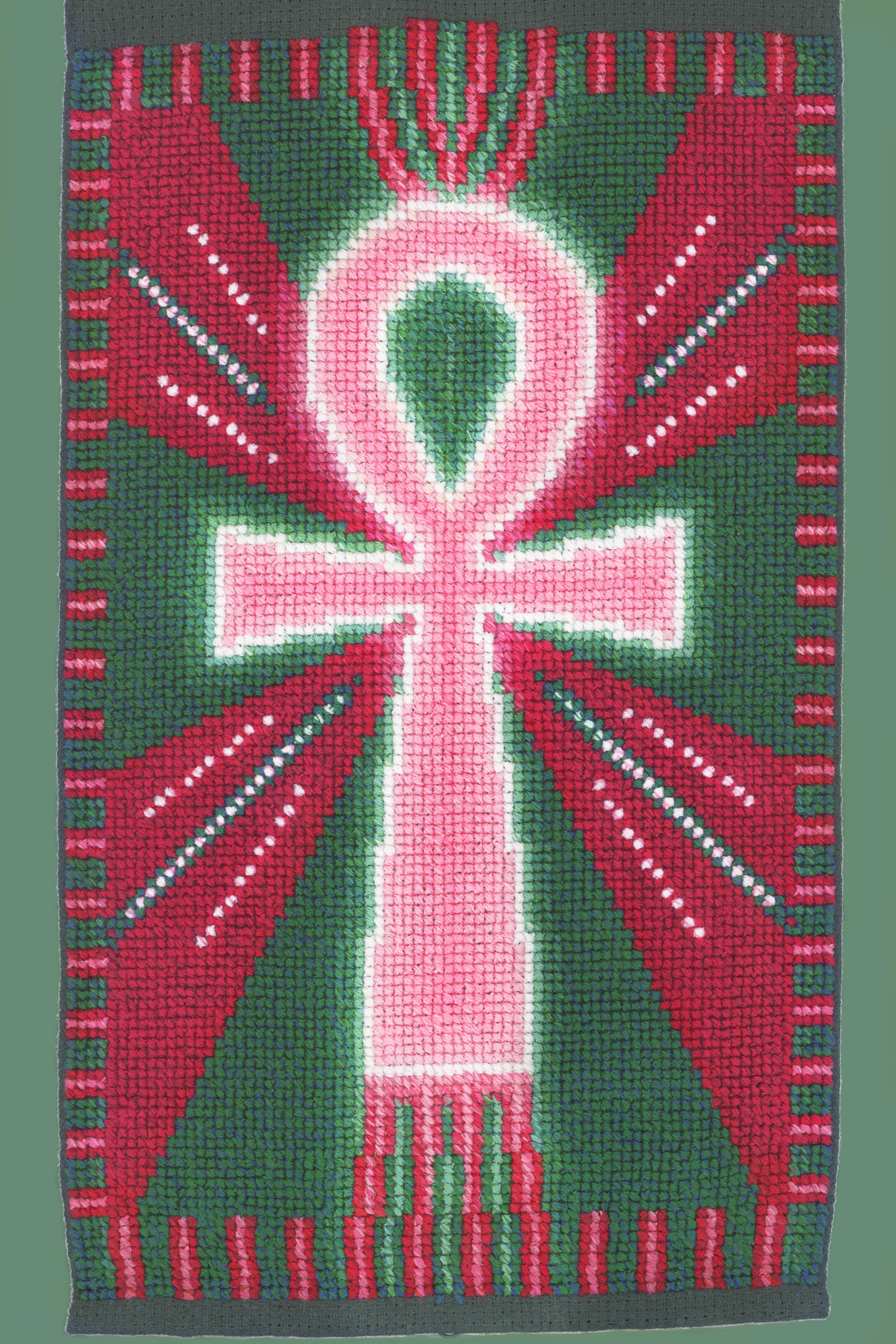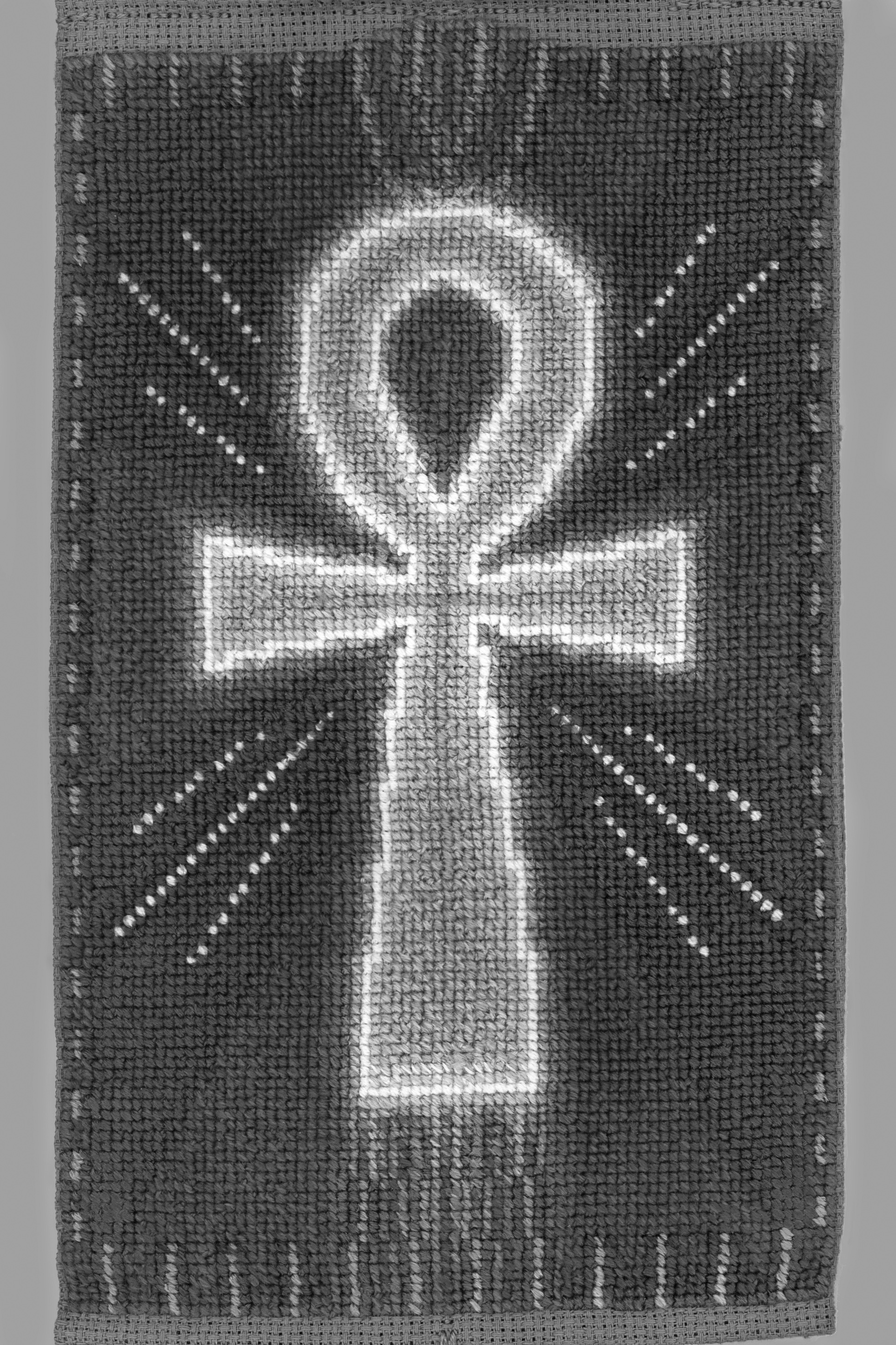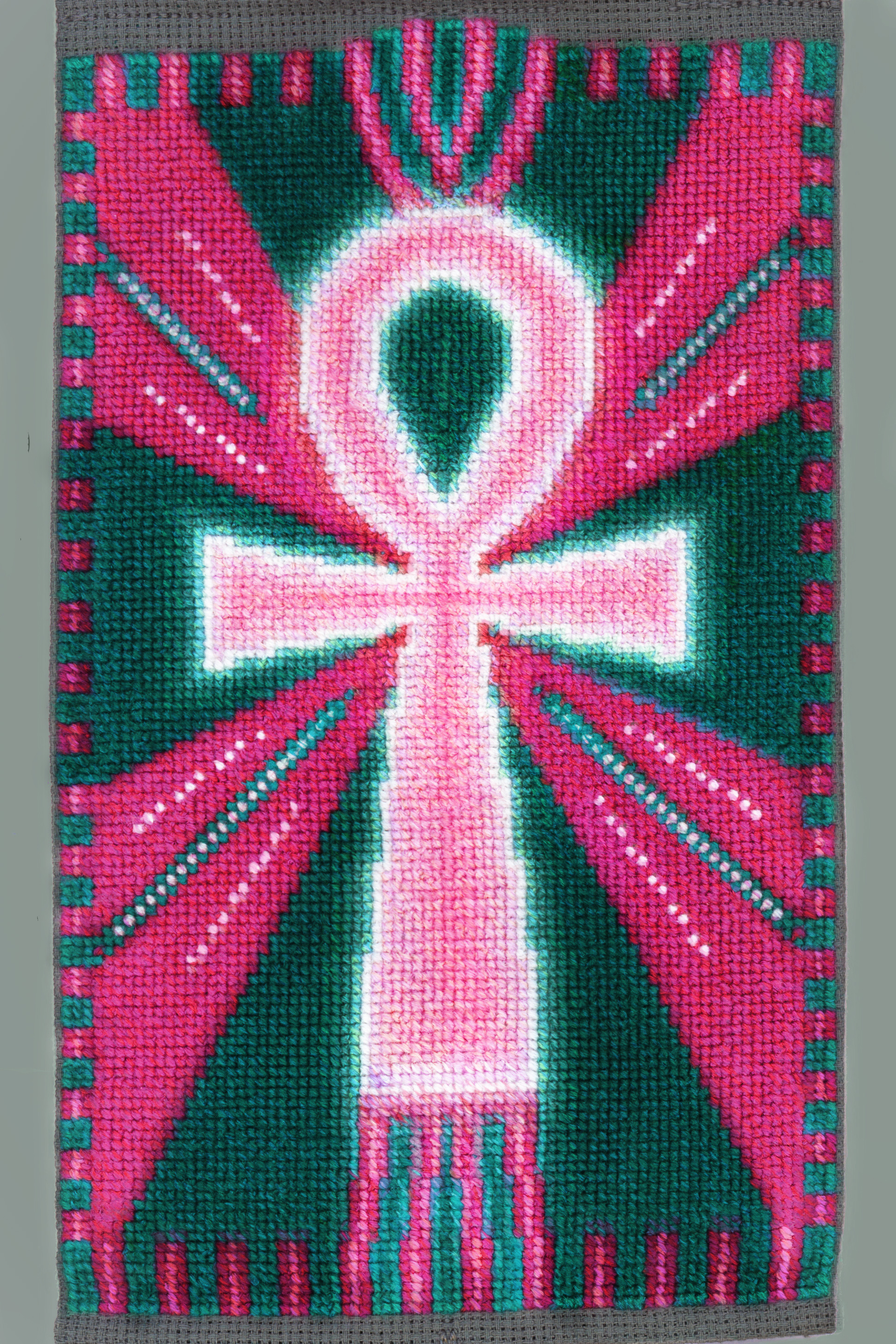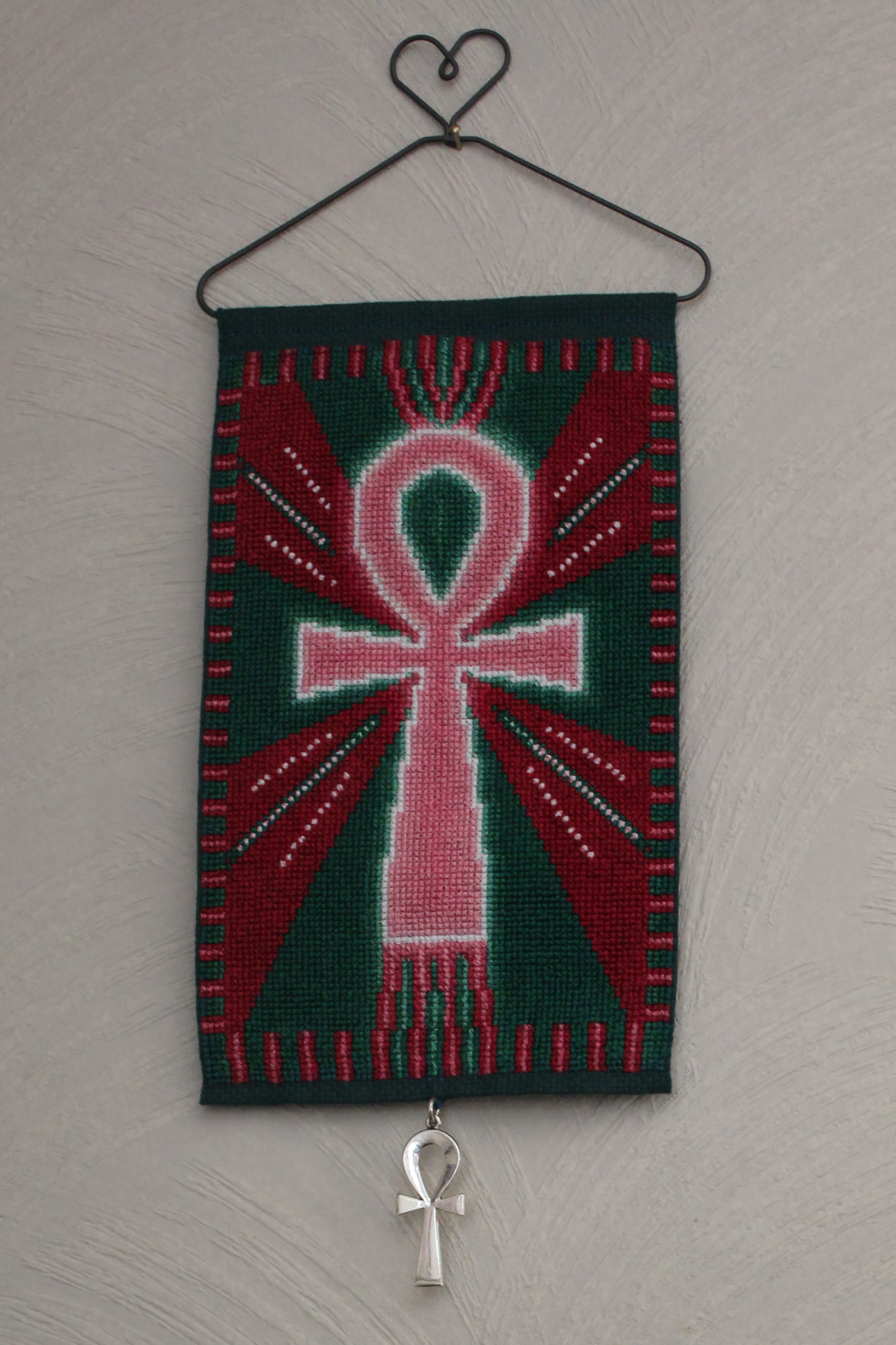 I had some dark green 14 count aida I'd bought earlier but not used, so I thought I'd see what this ankh pattern would look like in the larger grid. It turns out it will be around six inches wide, as compared to around four inches wide (4.25in) for the ankhs done in 18 count aida: