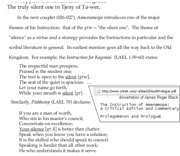 (Note of February 19, 2006)While doing a net search on something else, I came across several Egyptian verses on the virtue of silence.There is one in the "Book of the Dead":