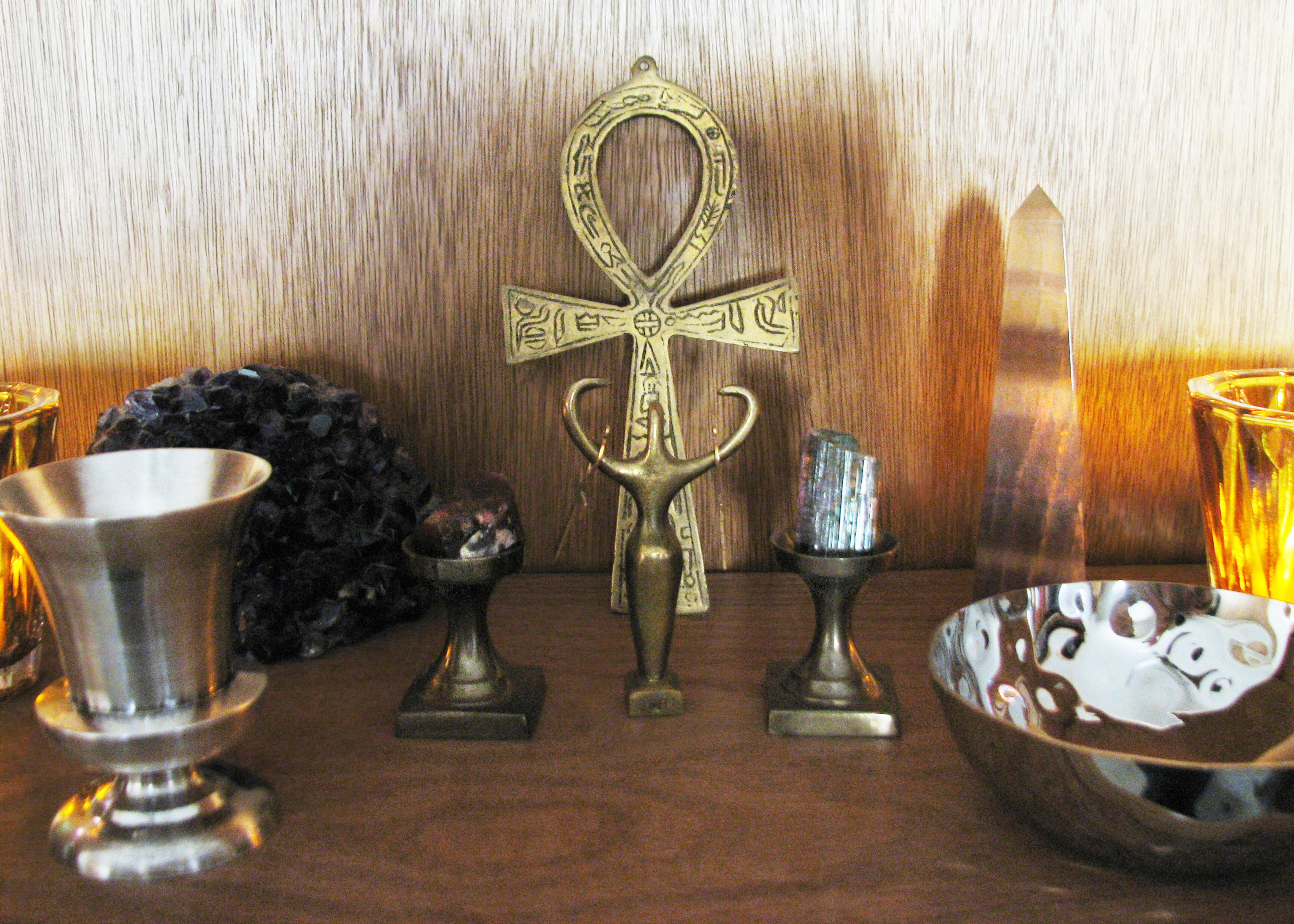 An ankh to represent 'Netjer', my brass figure based on the Predynastic Figure at the Brooklyn Museum that serves as a proxy for me, a repurposed small silver chalice, and a new offering bowl, along with an amethyst cluster and a fluorite obelisk.