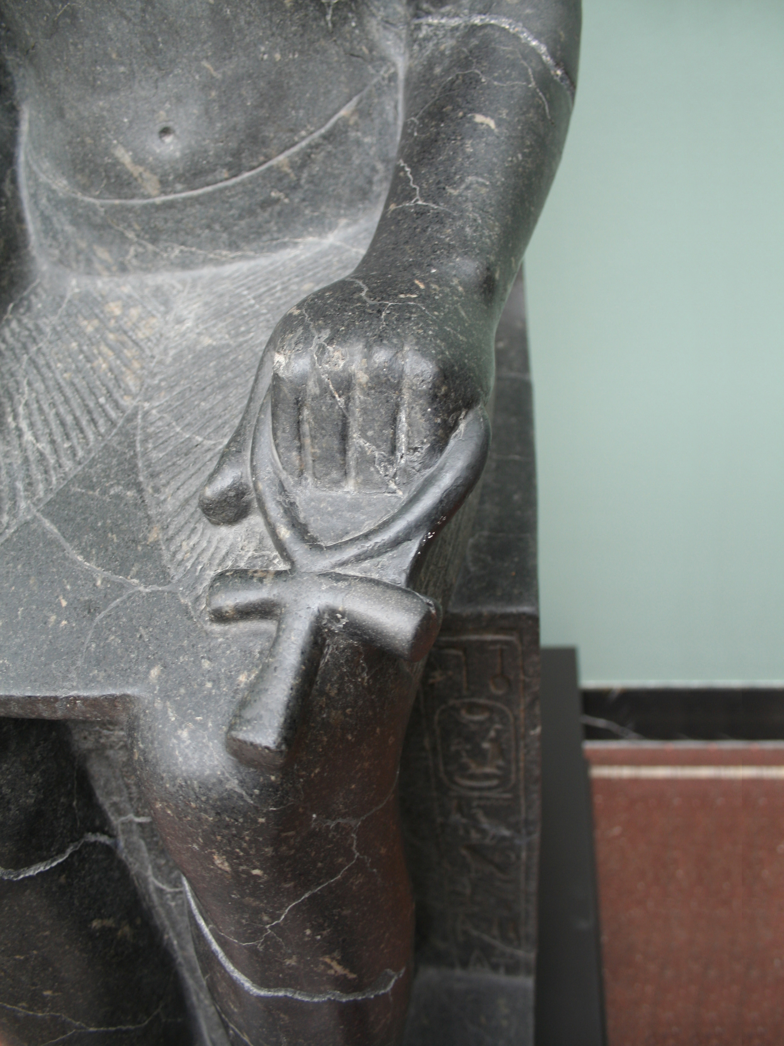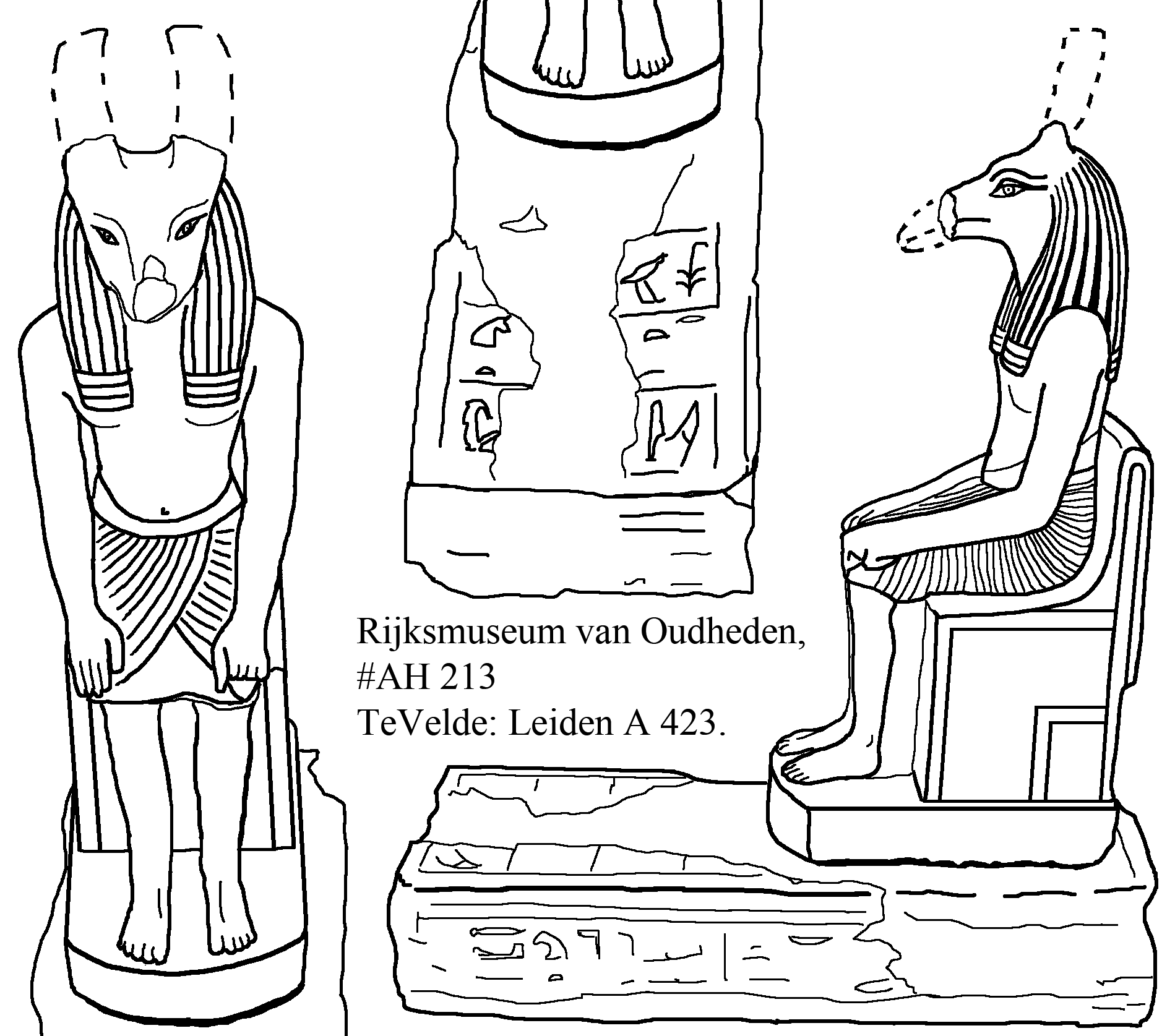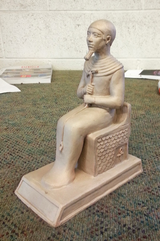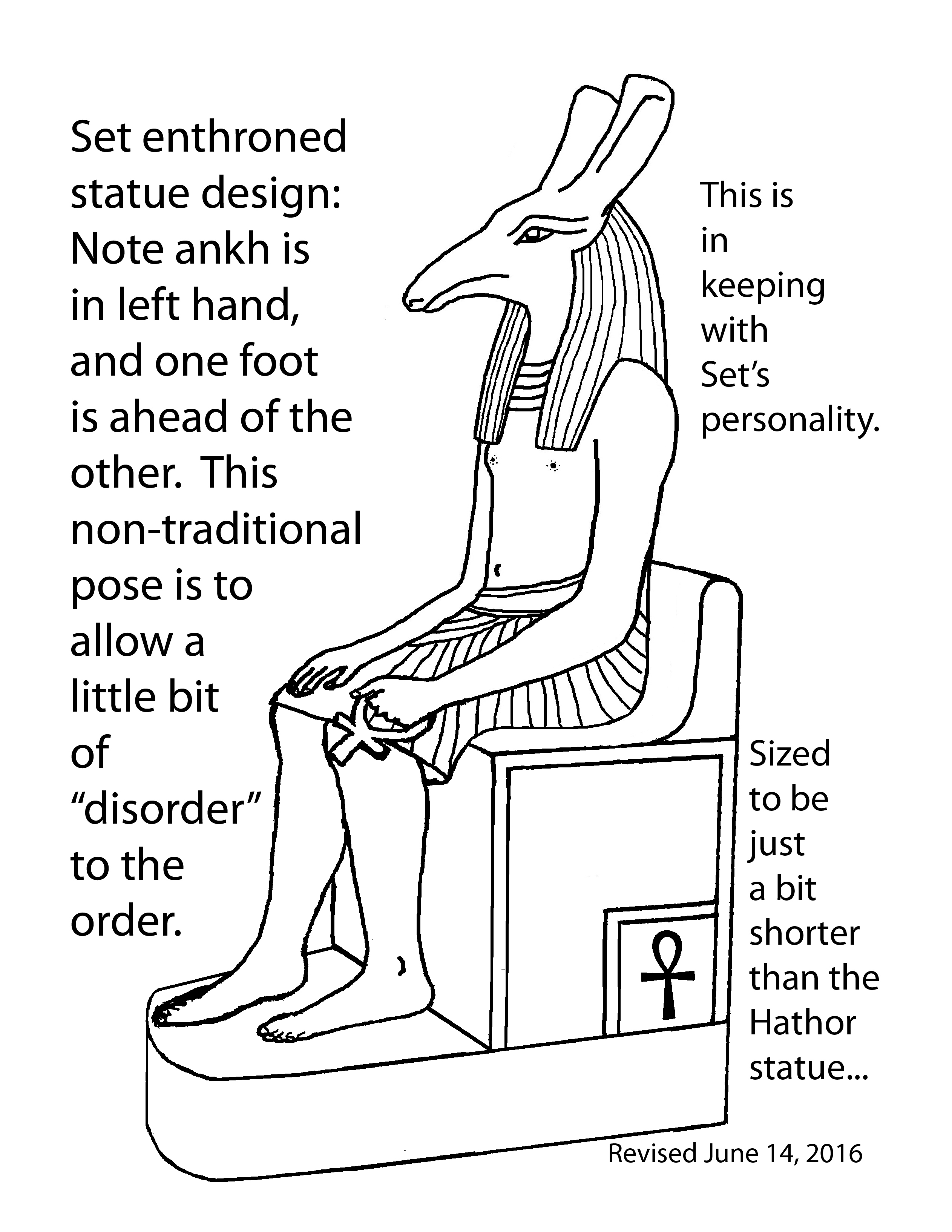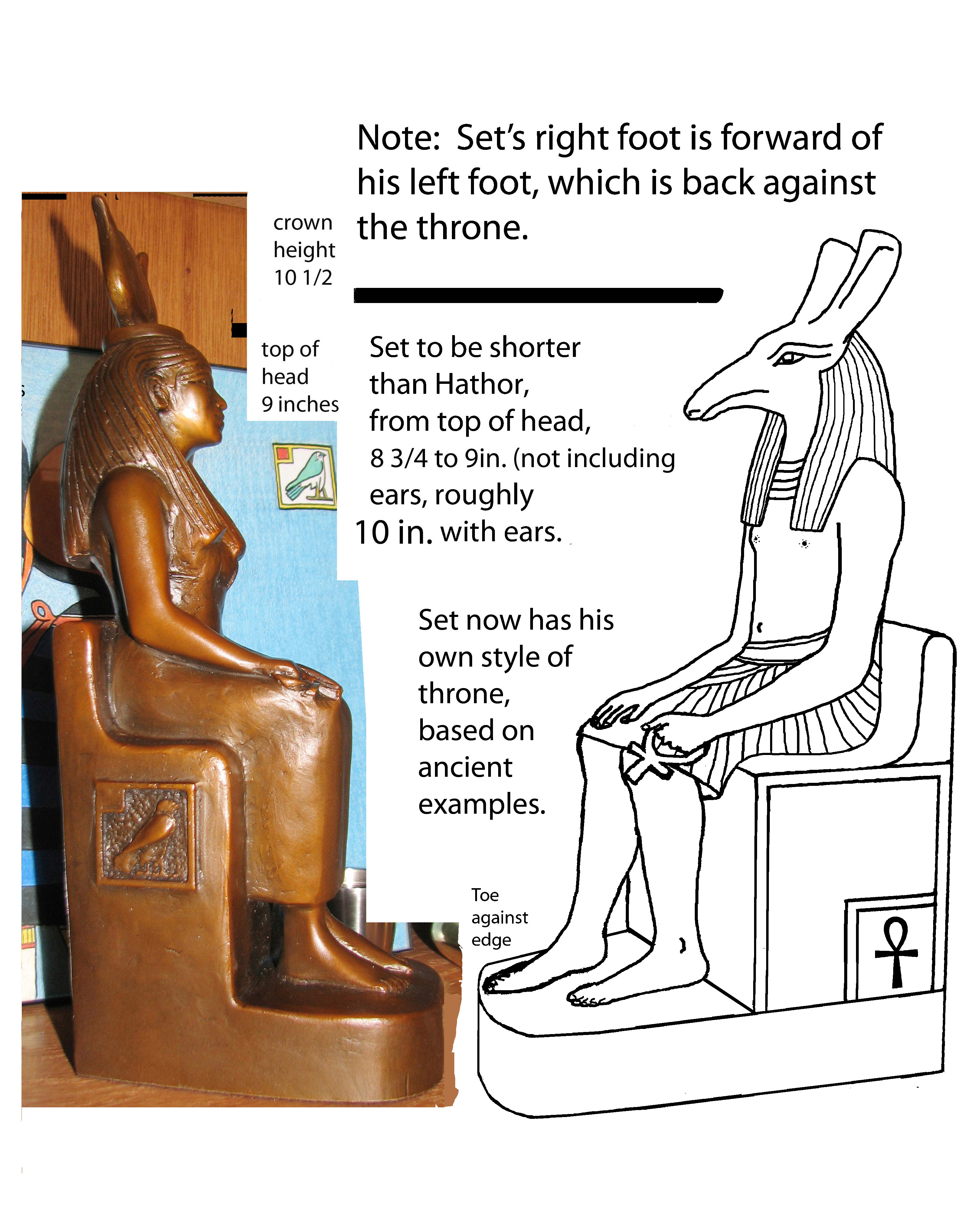 So I went back to the seated Set, and added a recessed area and changed the tail to a curled one. I was thinking that would be "The One". But then it seemed to me Set was saying, "Hathor has a throne, Ptah will have a throne (raw bronze), I'd like a throne, too!" What to do? I thought to introduce a little "chaos", and have Set's feet vary, the right one forward of the left, which is back against the throne. I've never seen seated statues of people or deities like this, they are always feet side by side. So it seems the right amount of "disorder". As of April 29th, the thighs seemed too short, the hands too small and the trunk too short. The icon would convey more strength with these fixed. With those changes, the head seems more in porportion and not too large. Later, I decided Set should have his OWN style of throne. I've changed the throne to be more like the ancient Set statue model, wider from the front view and more sharp corners, with the inset and an ankh (like I did on the Ptah statue).