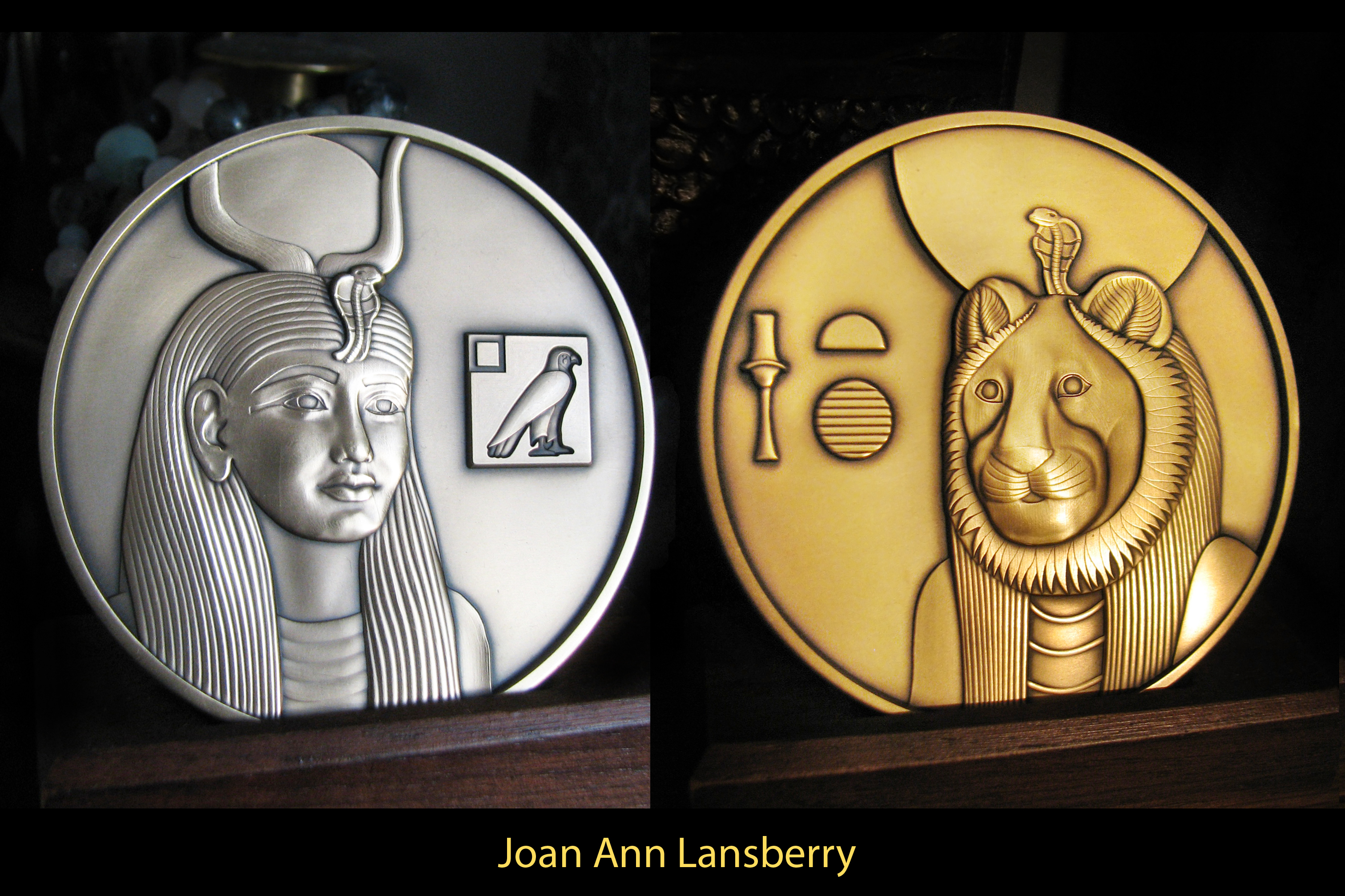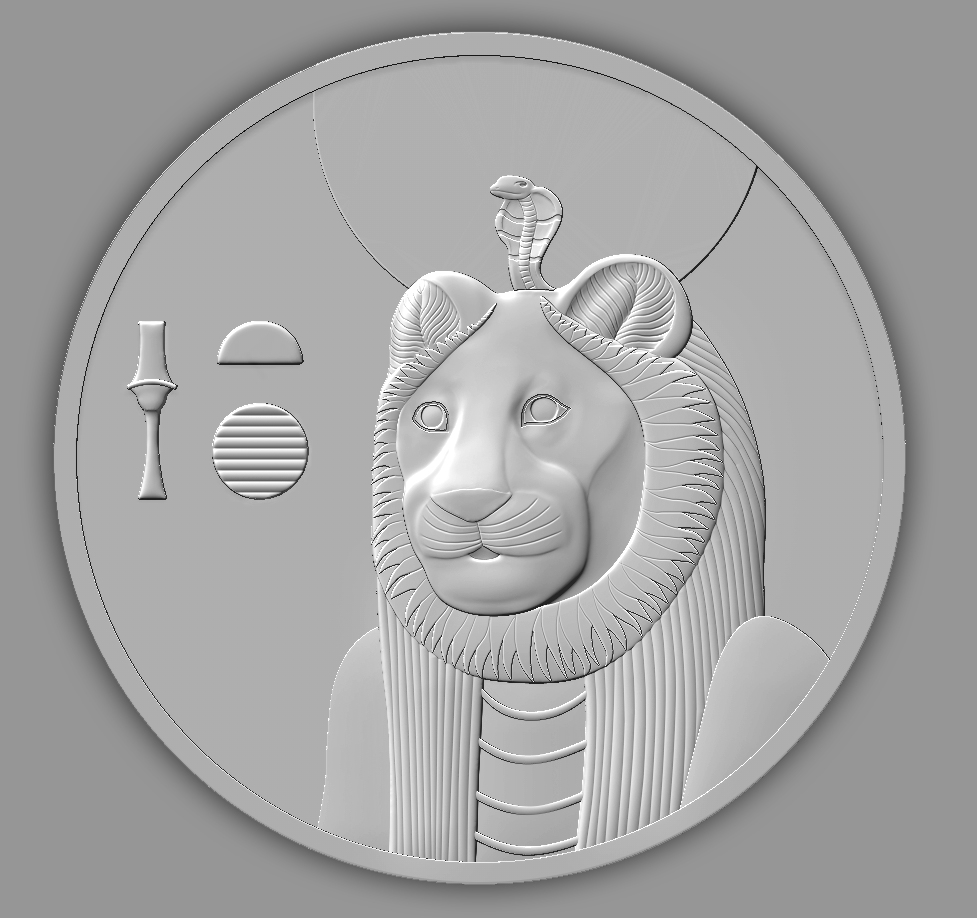 The idea is that the two Deities are "two sides of the same coin", gentle Hethert can become fierce Sekhmet, fierce Sekhmet can become appeased and soften into gentle Hethert. The designs are such that the eyes of each Deity are exactly placed to be in the same spot on either side. I found it fascinating to compare the medal design and its realization. I think the mint used a digital three-dimensional creation program, unlike the more traditional method of creating a very large clay model. (Heidi Wastweet shares the traditional method via this link.)
