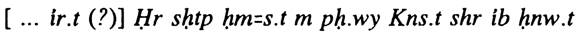 "[ ...the eye (?_ of] Horus, who pacifies her majesty in the far reaches of Keneset. and who gladdens the heart of the mistress."