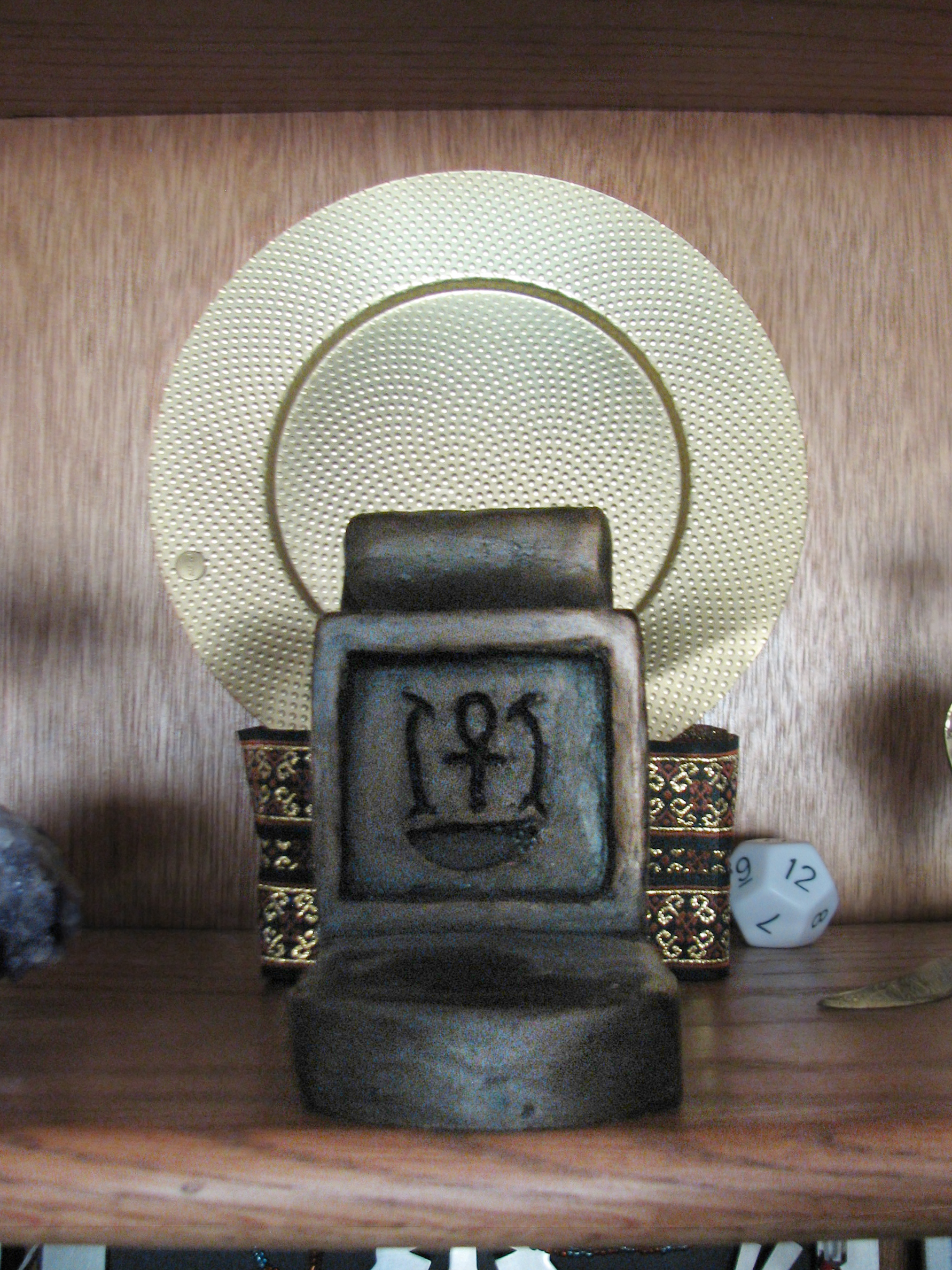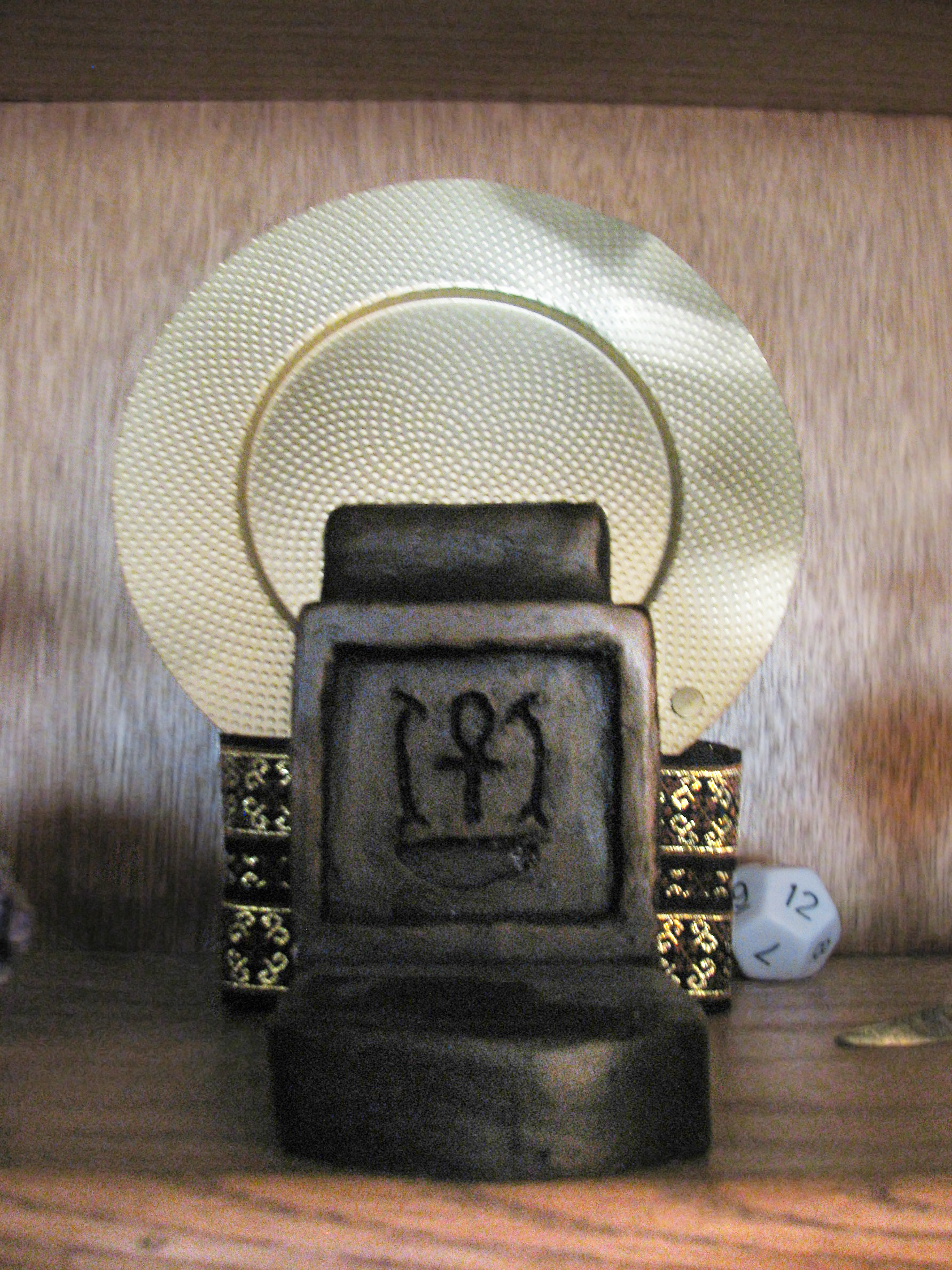 Then I tried displaying them less prominently. Surprise! The "warpage" helps the plate to sit more straight up in the stand I made for it. I had to make a stand that would raise the plate high enough to fully look like Amun Ra's rays glowing from a hidden figure sitting on the throne. I produced a lumpy, but serviceable result from the air drying clay. Fortunately, I had enough ribbon left over from covering Wepwawet's base to cover the lumpy stand.