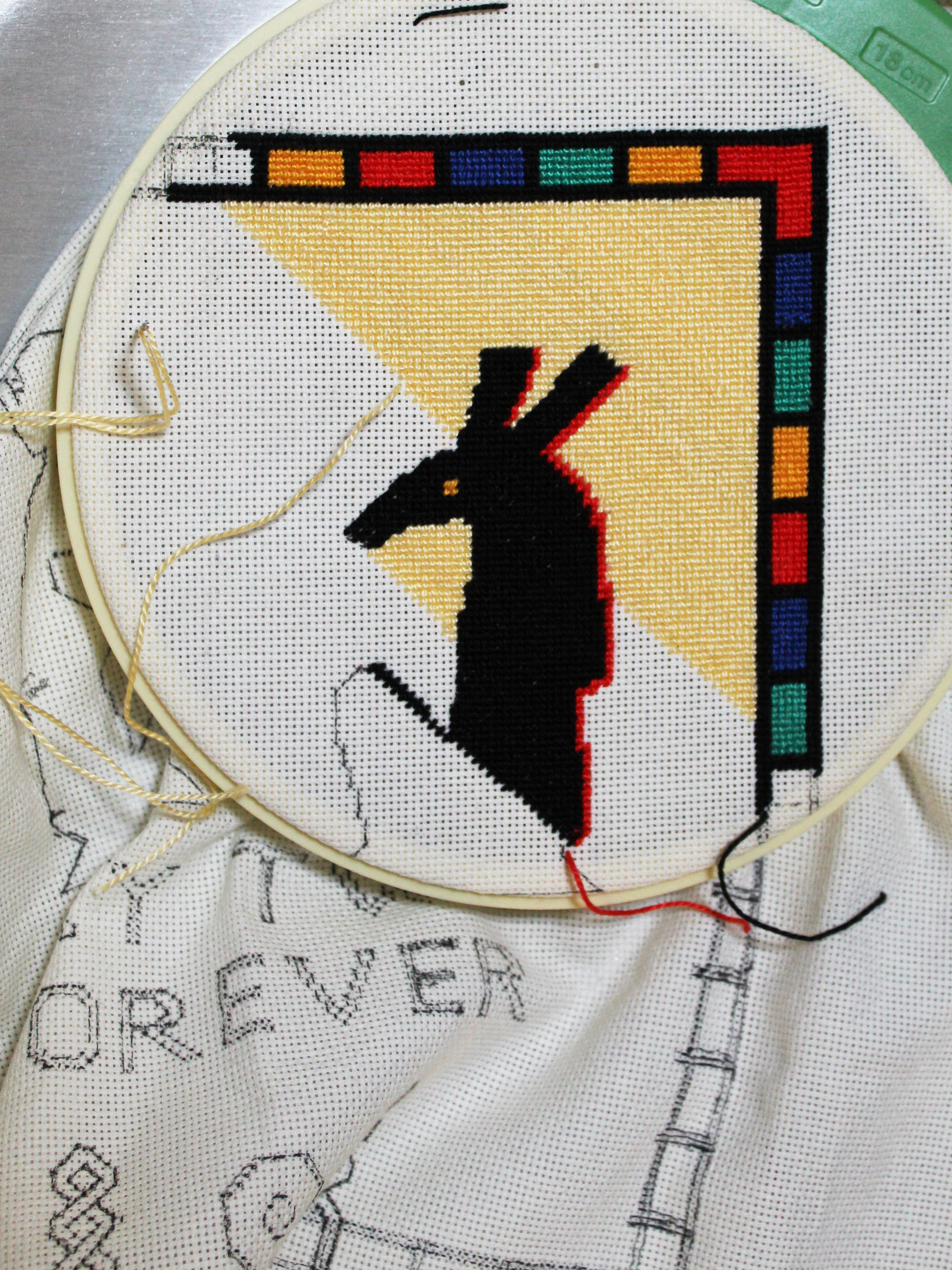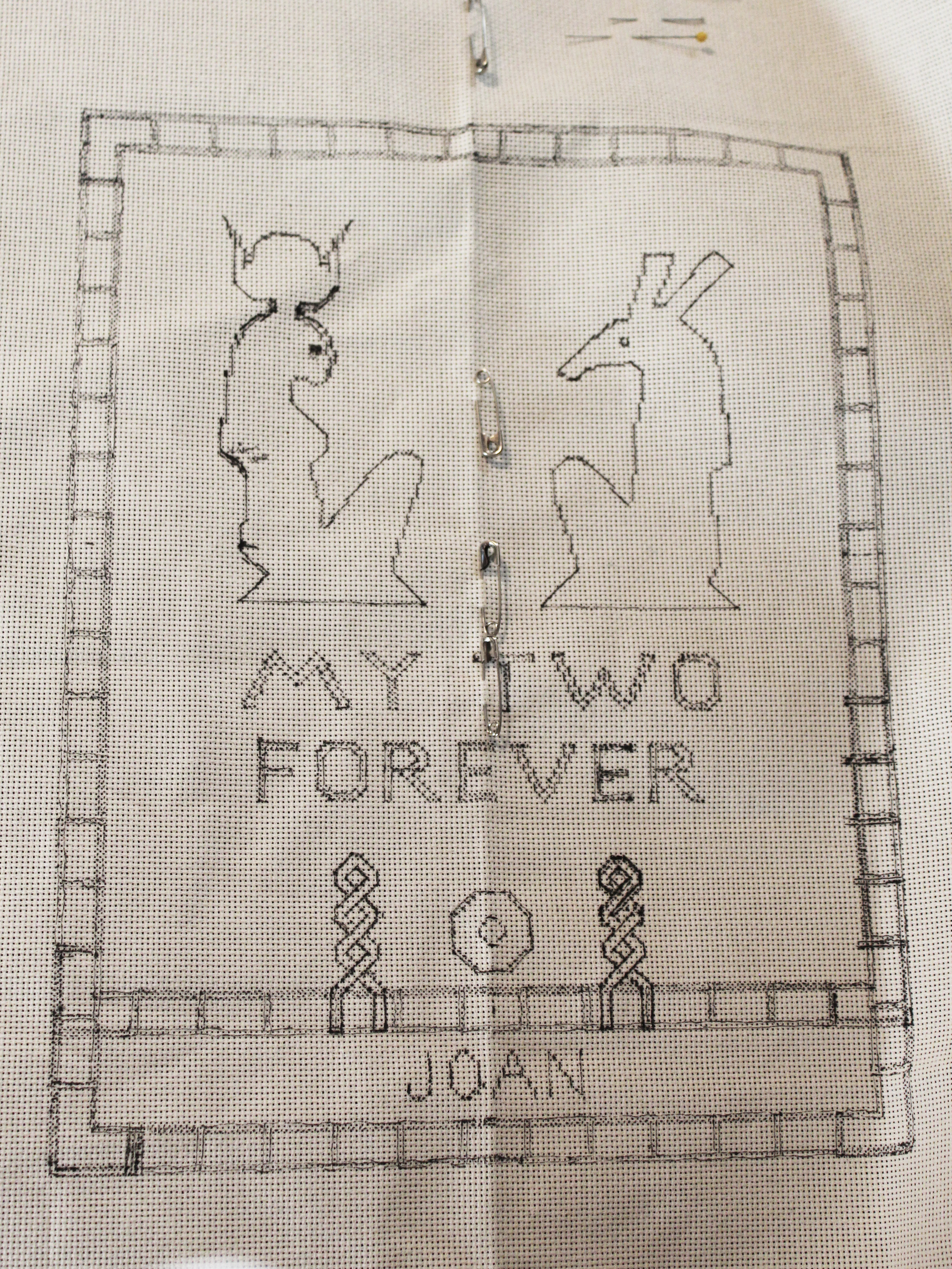 The idea appeared in my mind's eye, Hathor and Set silhouetted with the words "MY TWO FOREVER" beneath them and bordered similarly to Wepwawet's needlepoint, but with brighter colors.