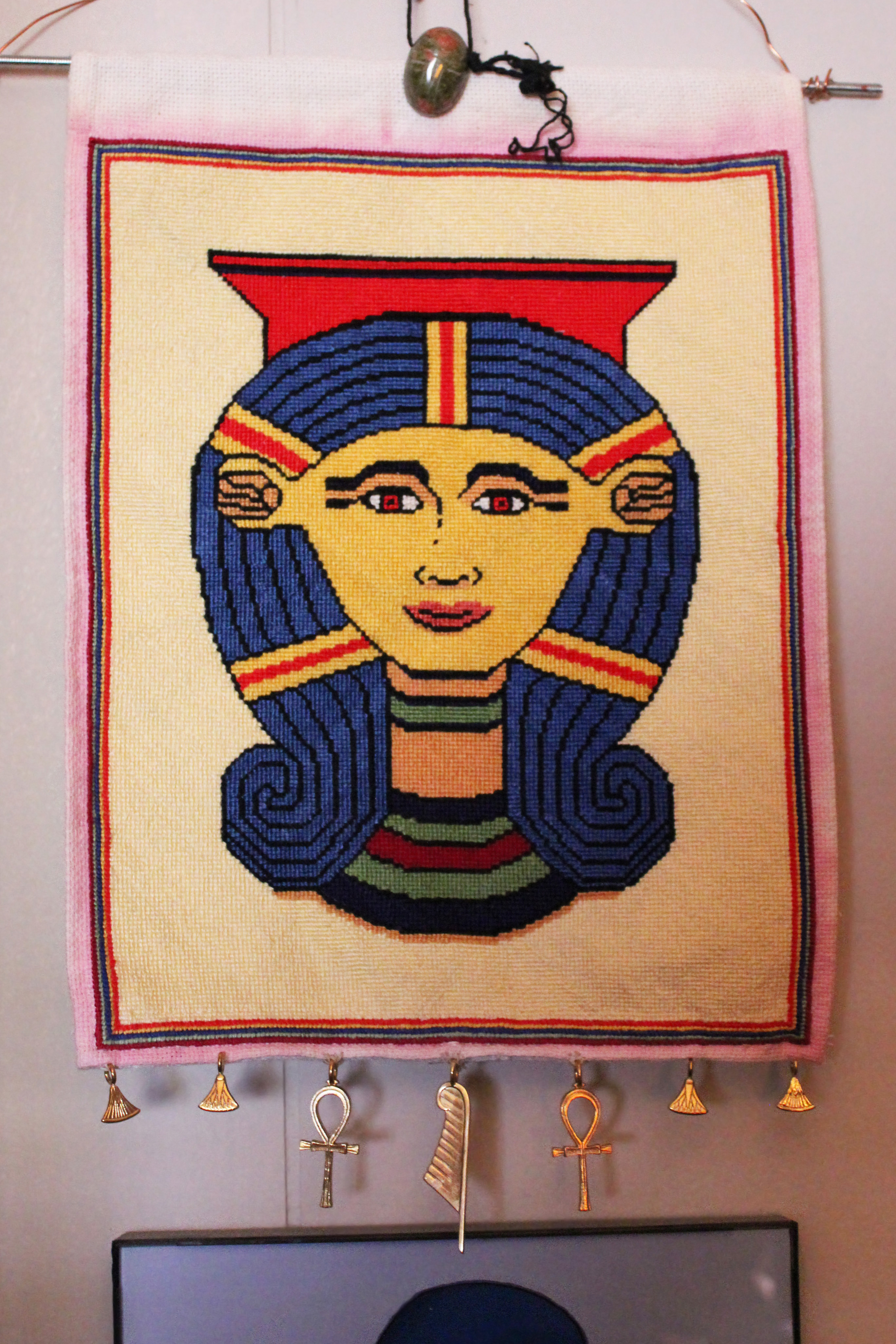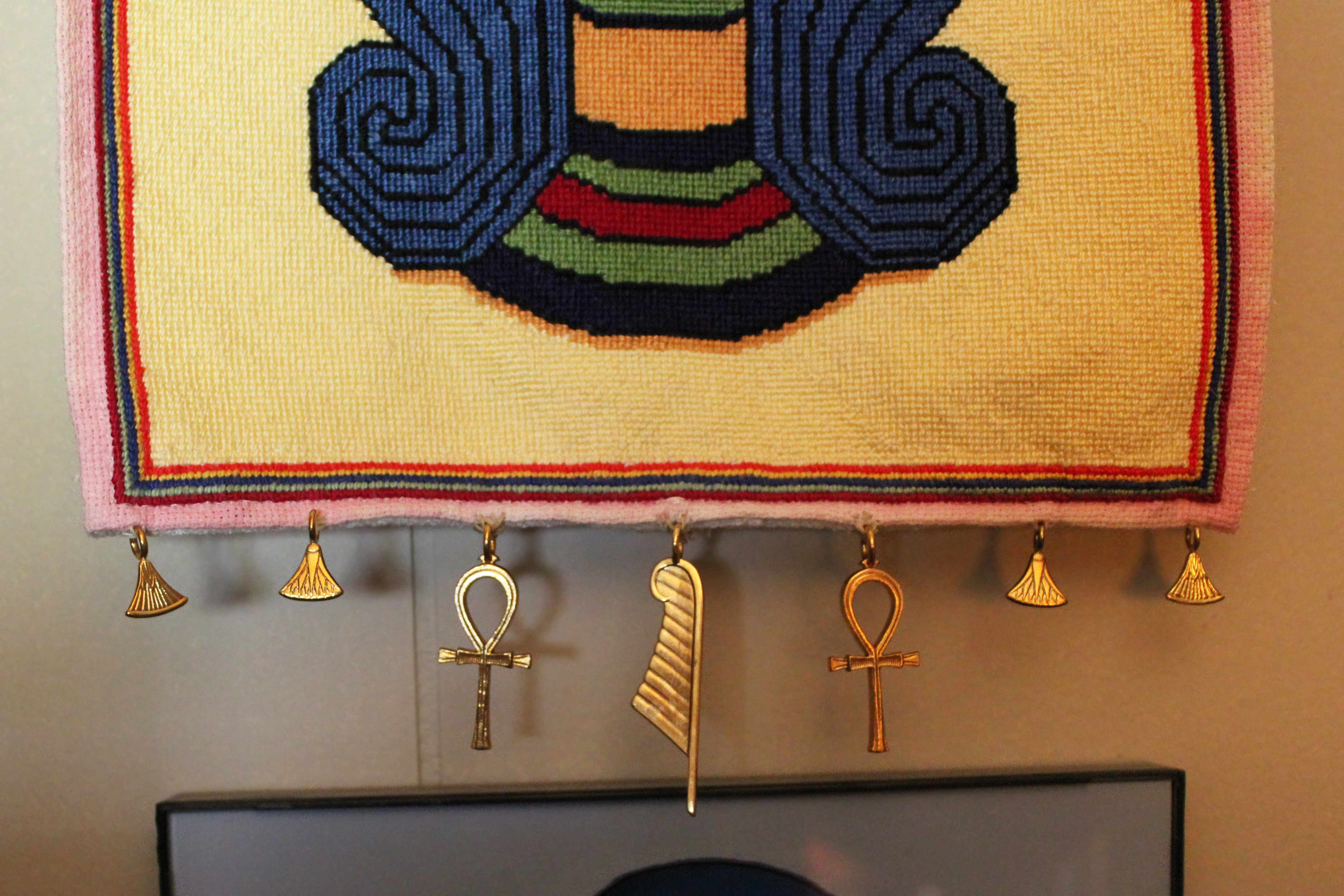 got adorned with amulets, my Hethert needlepoint seemed lacking. So I got together a set of amulets for this one, in gold colored brass, as Hethert is a solar deity: