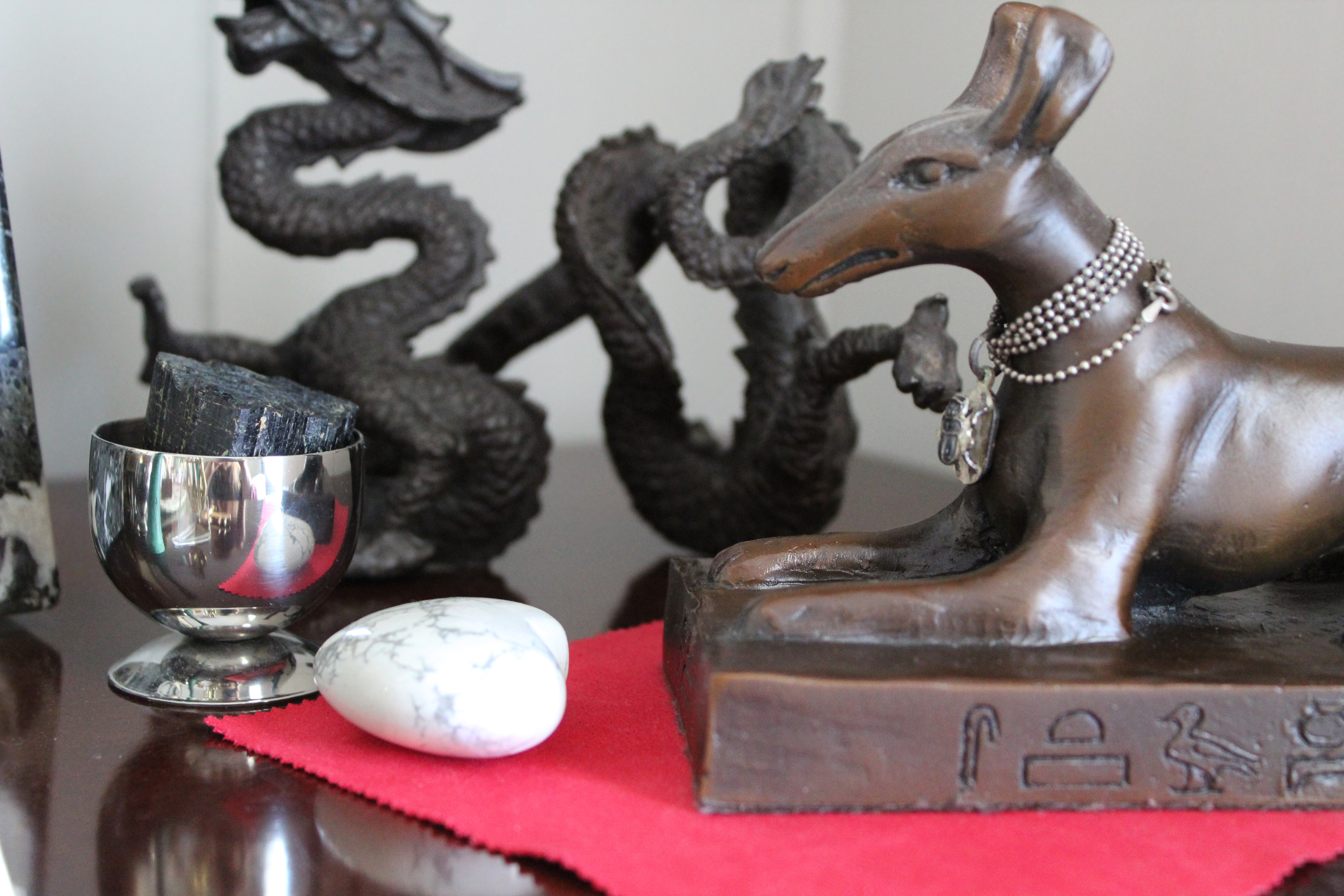Hathor's area of this informal shrine has an addition (actually a "trade-out"). Her little cup now is filled with two tourmaline crystals. The one on top and visible is of the rubellite variety.