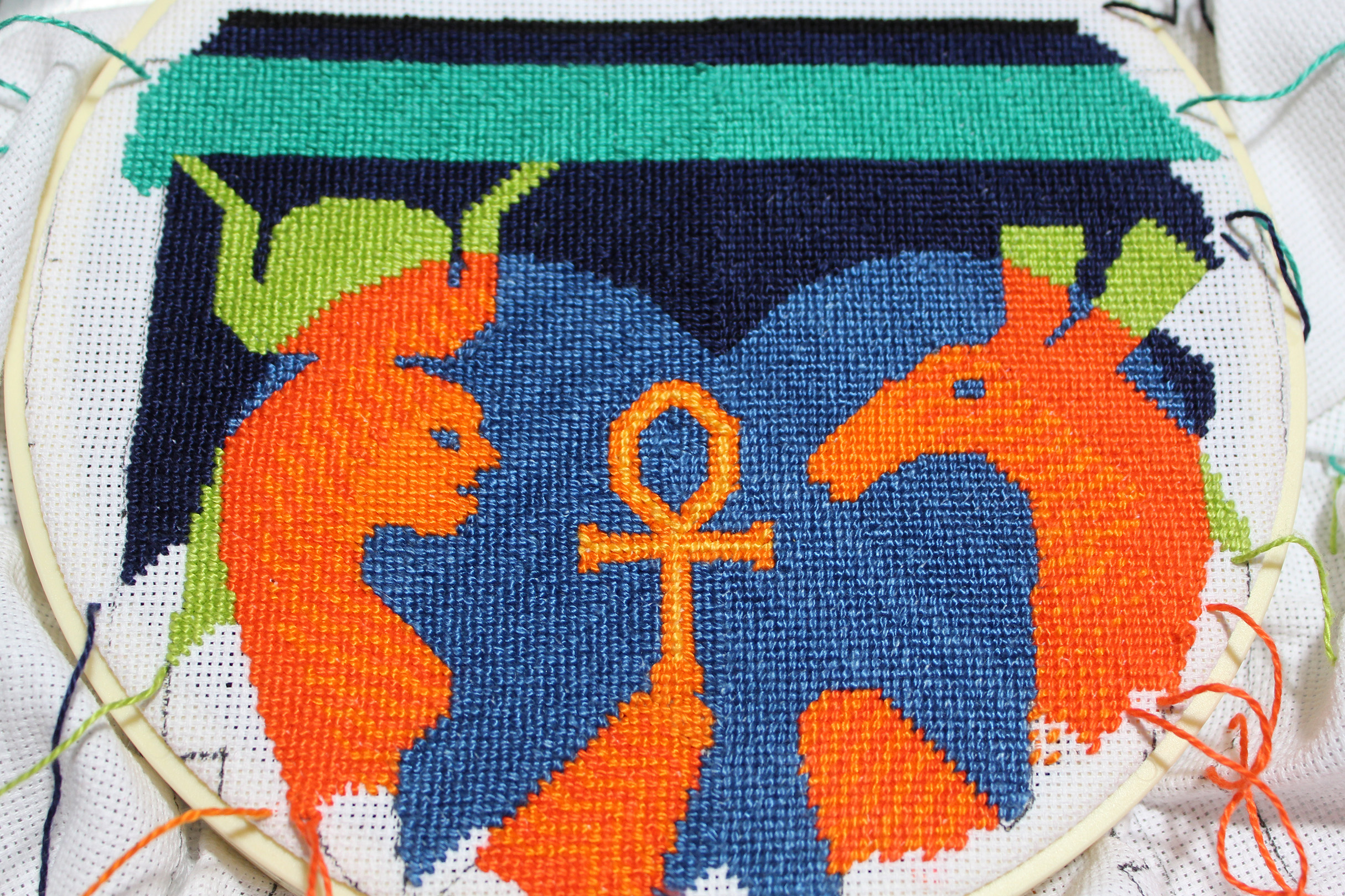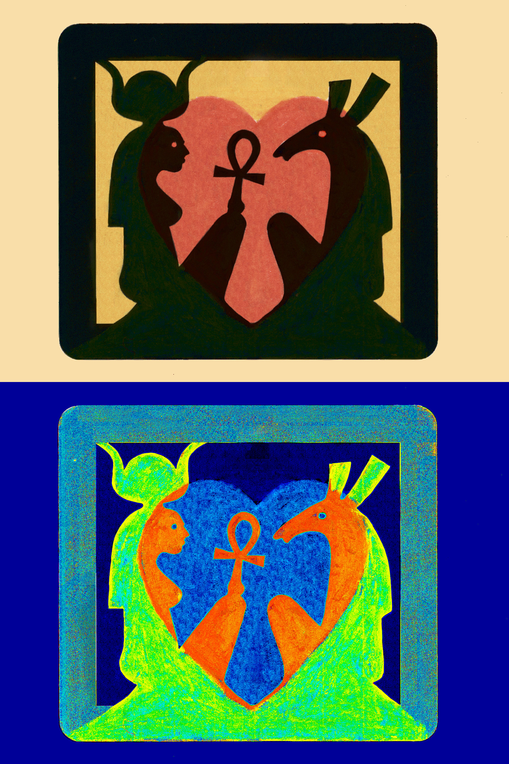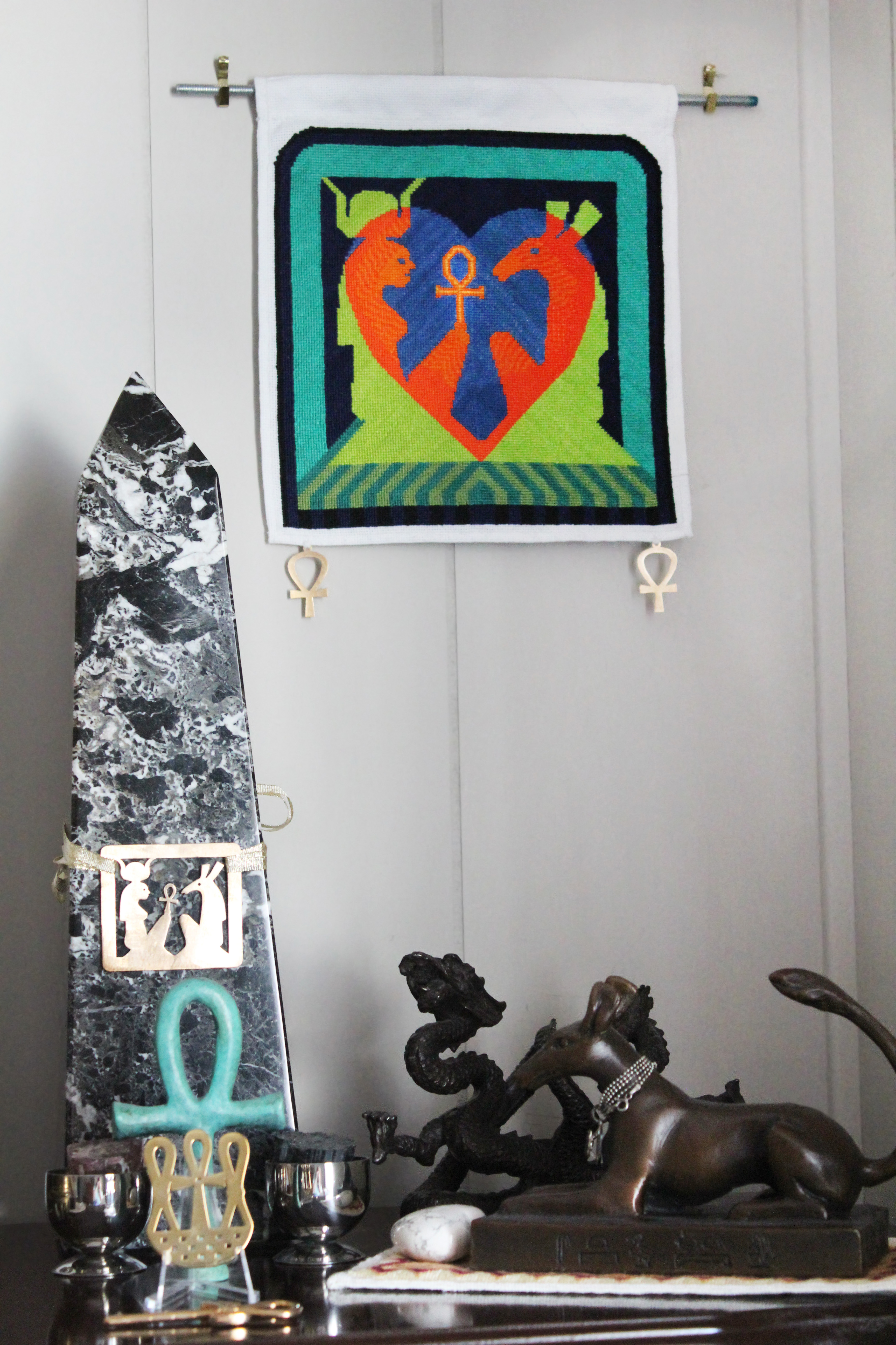 It all started with a desire to make a small votive of Set and Hathor. I took a crop of a photo of the "My Two" needlepoint and turned it black and white: