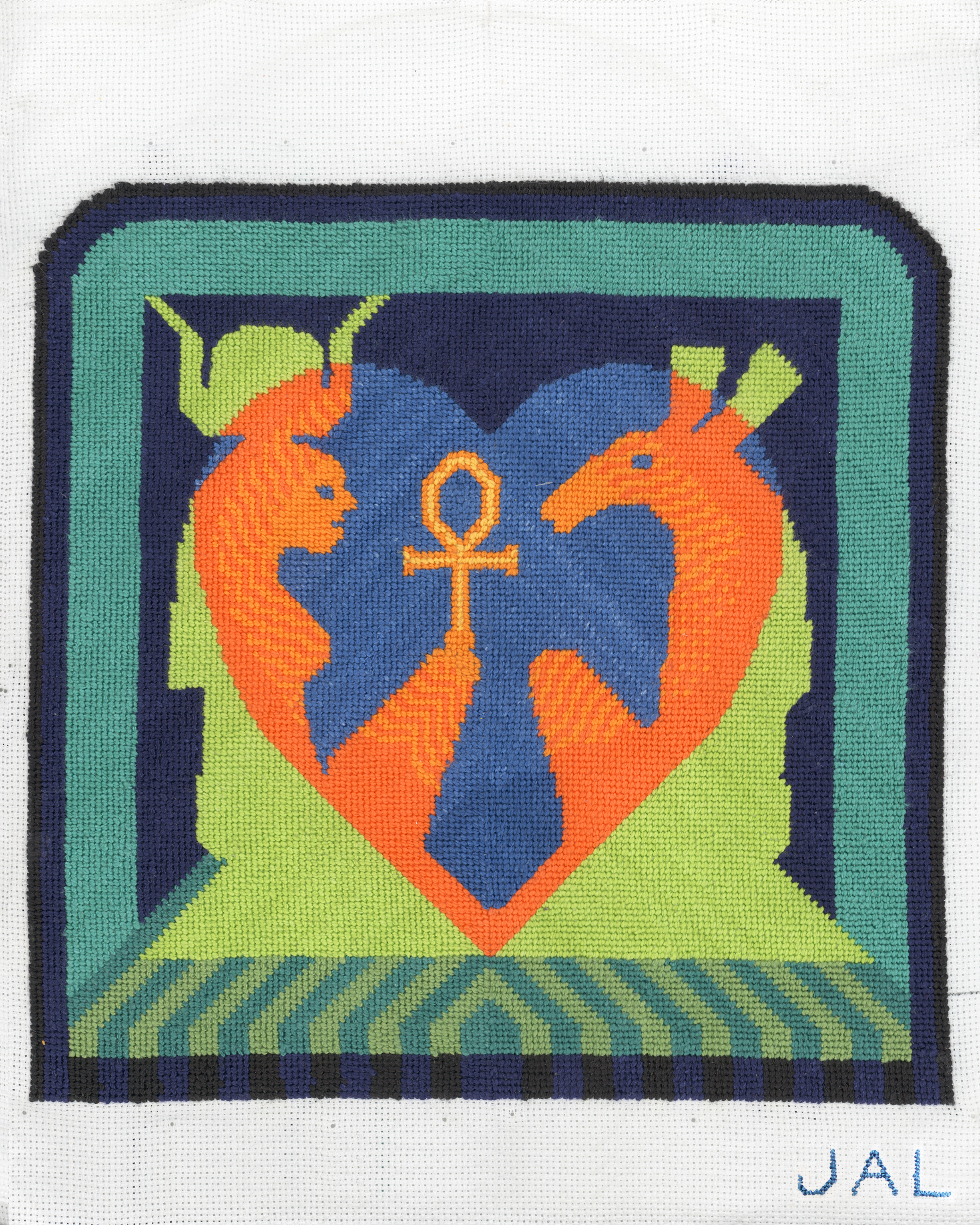 Looking at that, I got curious as to what it would look like in needlepoint. I sent for yarns to match the bright orange/red and chartreuse, already having the other colors in stock.