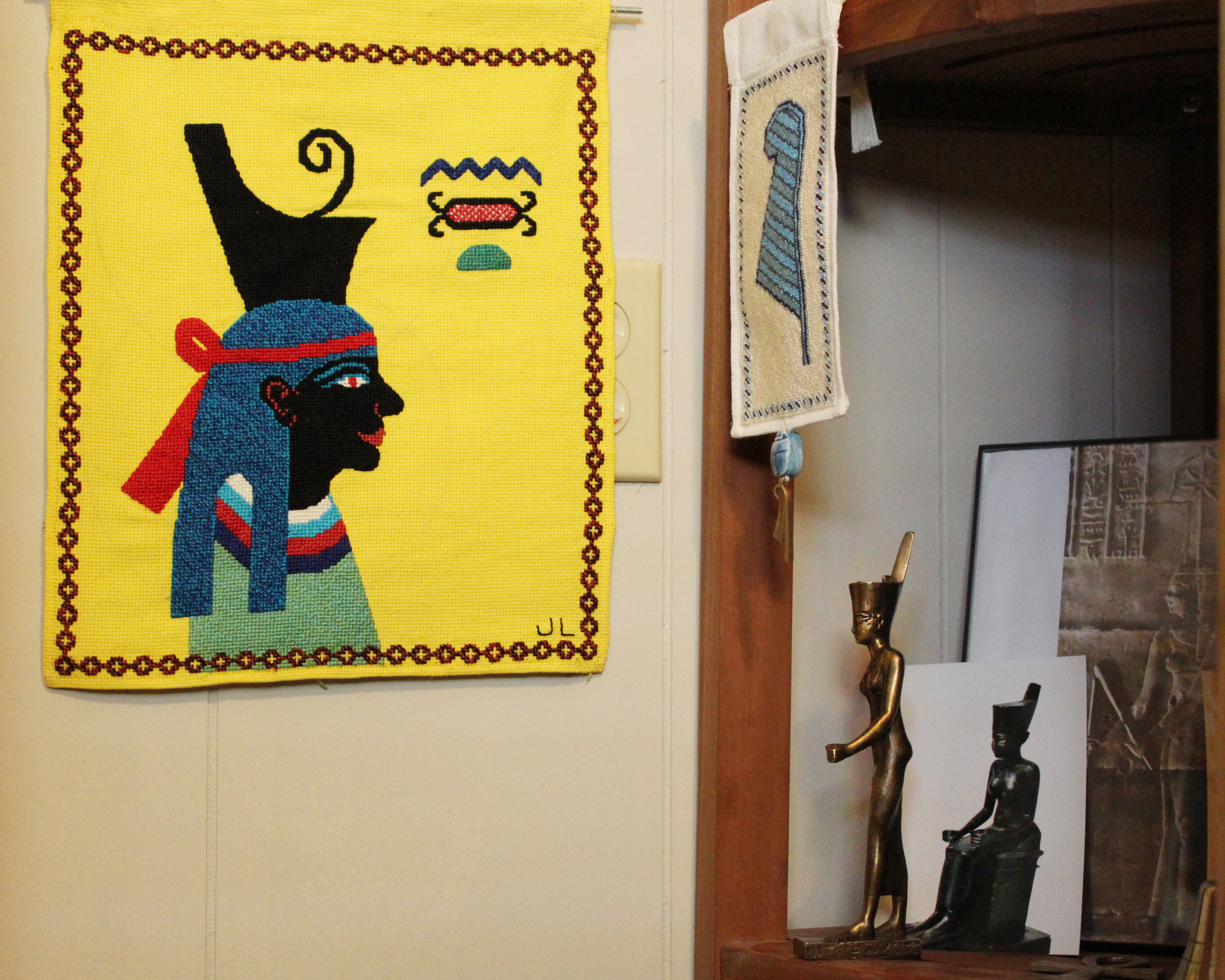 I like to think that being patron of weaving, Nit would be patron of all textile arts. The following cross stitch features the hieroglyphs that usually spell her name. The center glyph is either a warrior's shield or a weaver's loom.