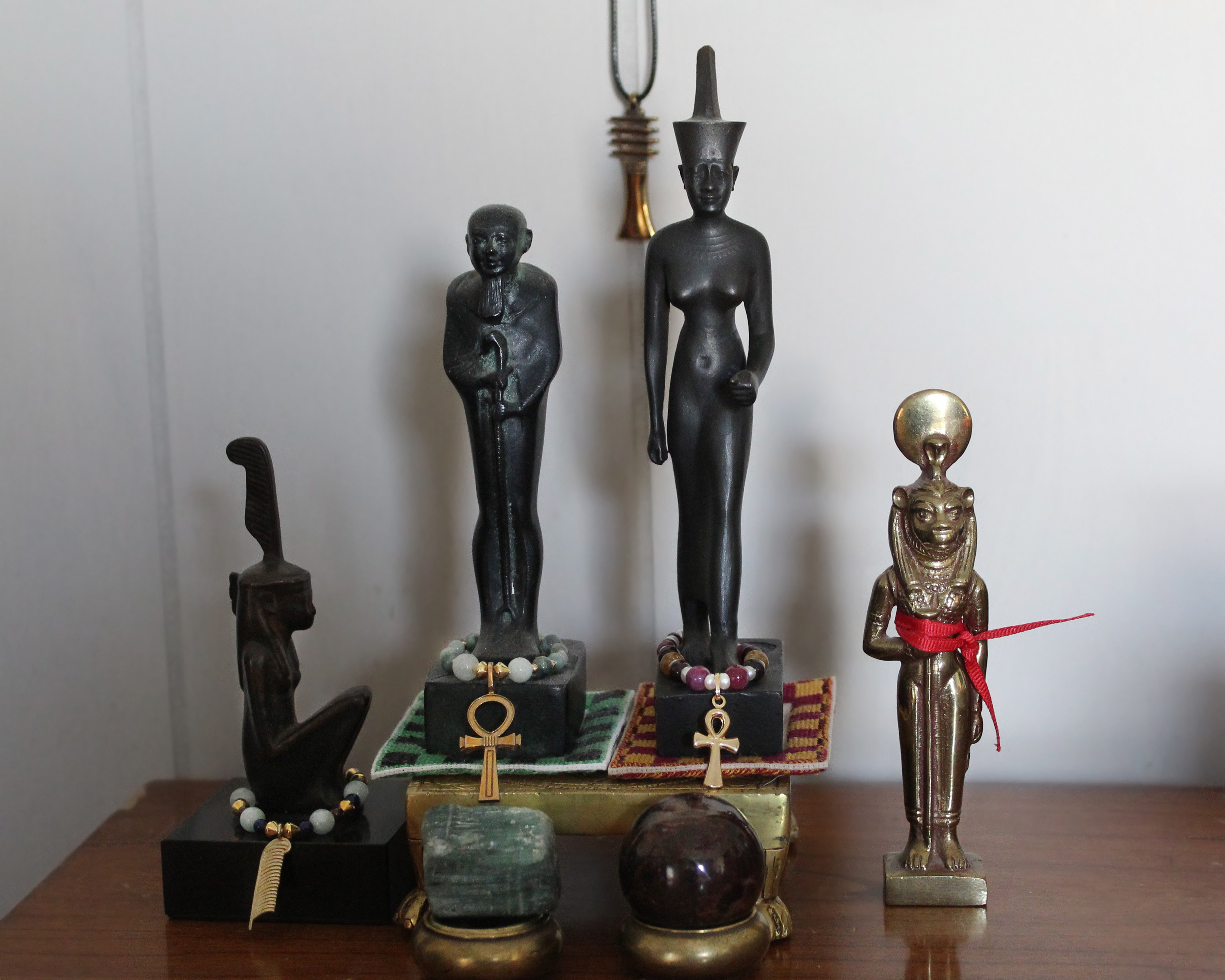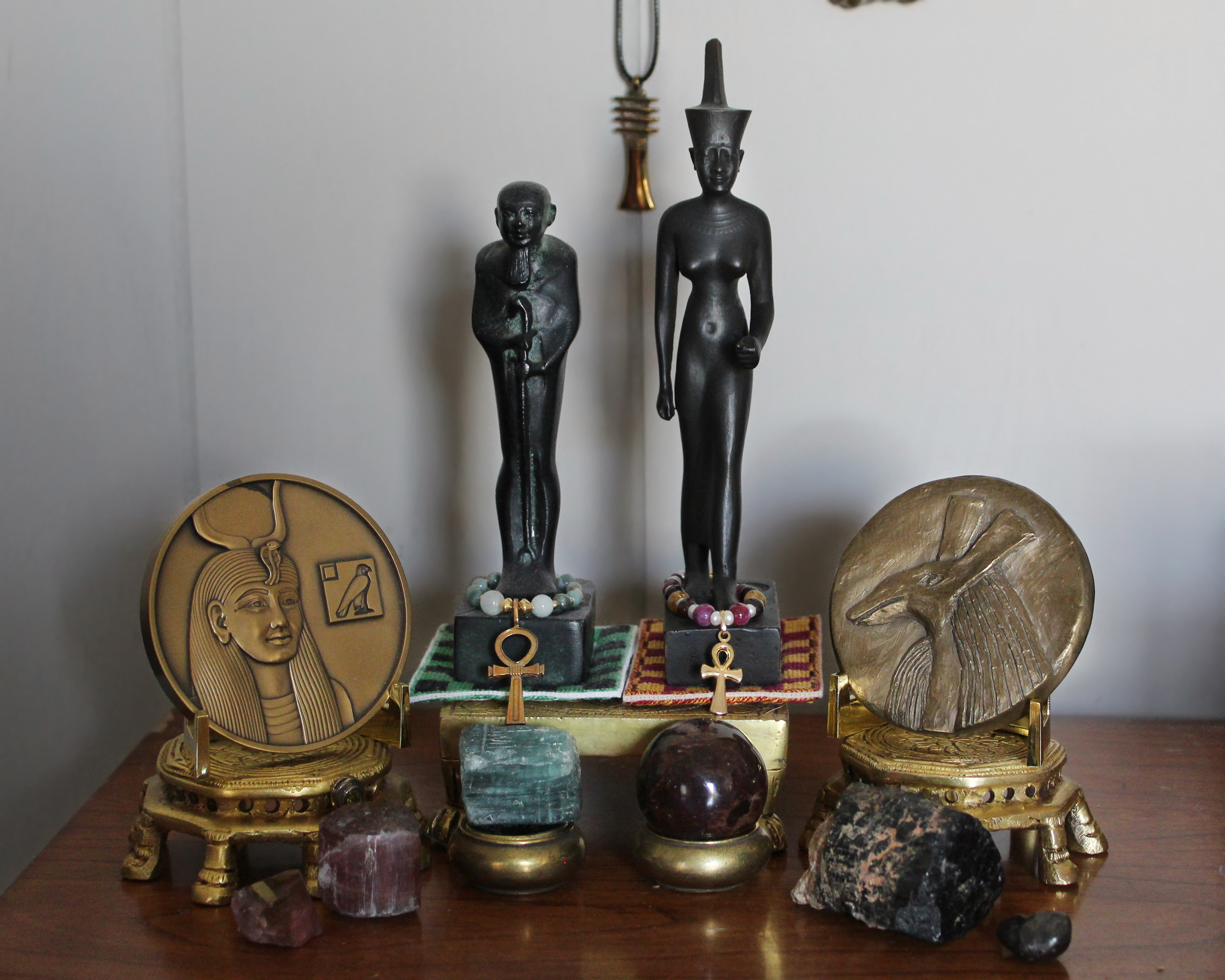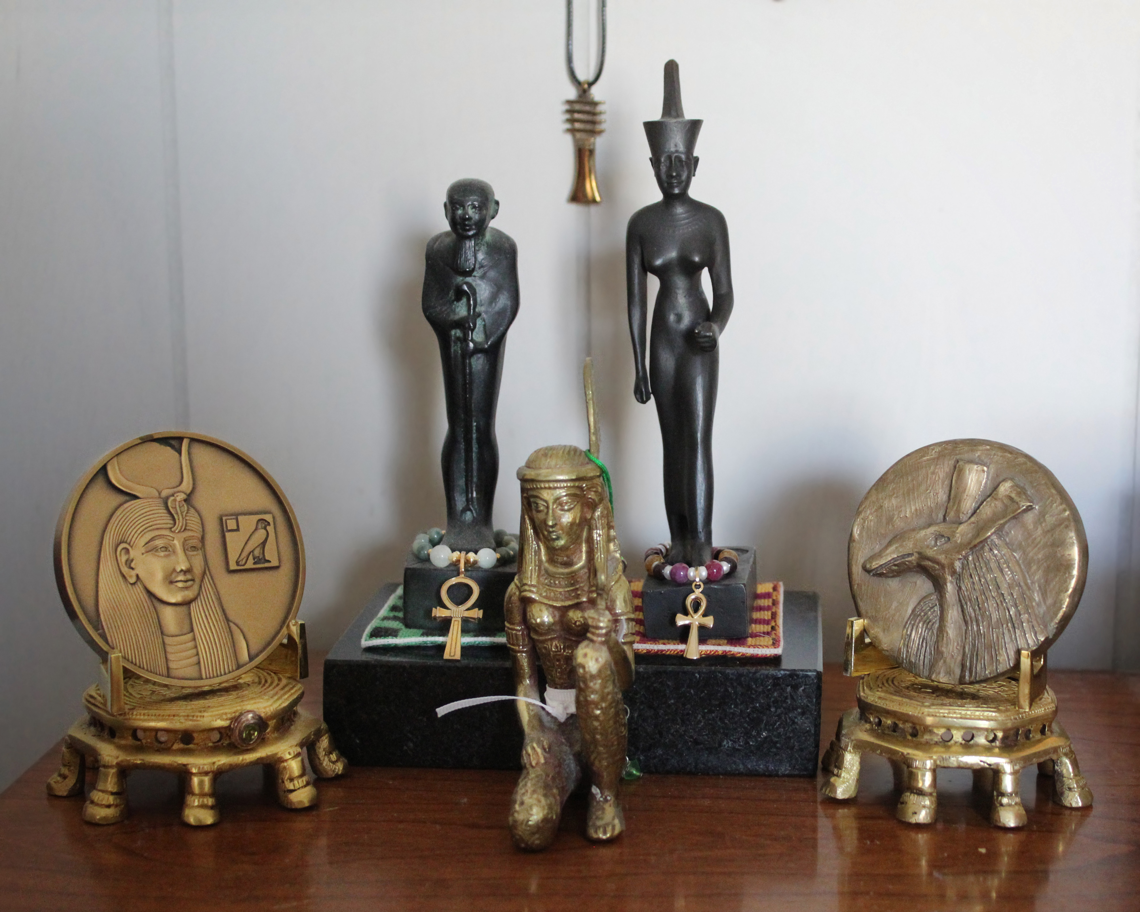 ![]() Once again experimenting with limited scenarios, I feature Ptah's and Nit's statues. This time, medallions of Hathor and Set accompany them, ((Hathor's minted in 2017 and Set's sculpted by me in 2018) The statue of Ma'at I've had for twenty years is at the center. This was the first shrinario experiment. I next tried other variations: