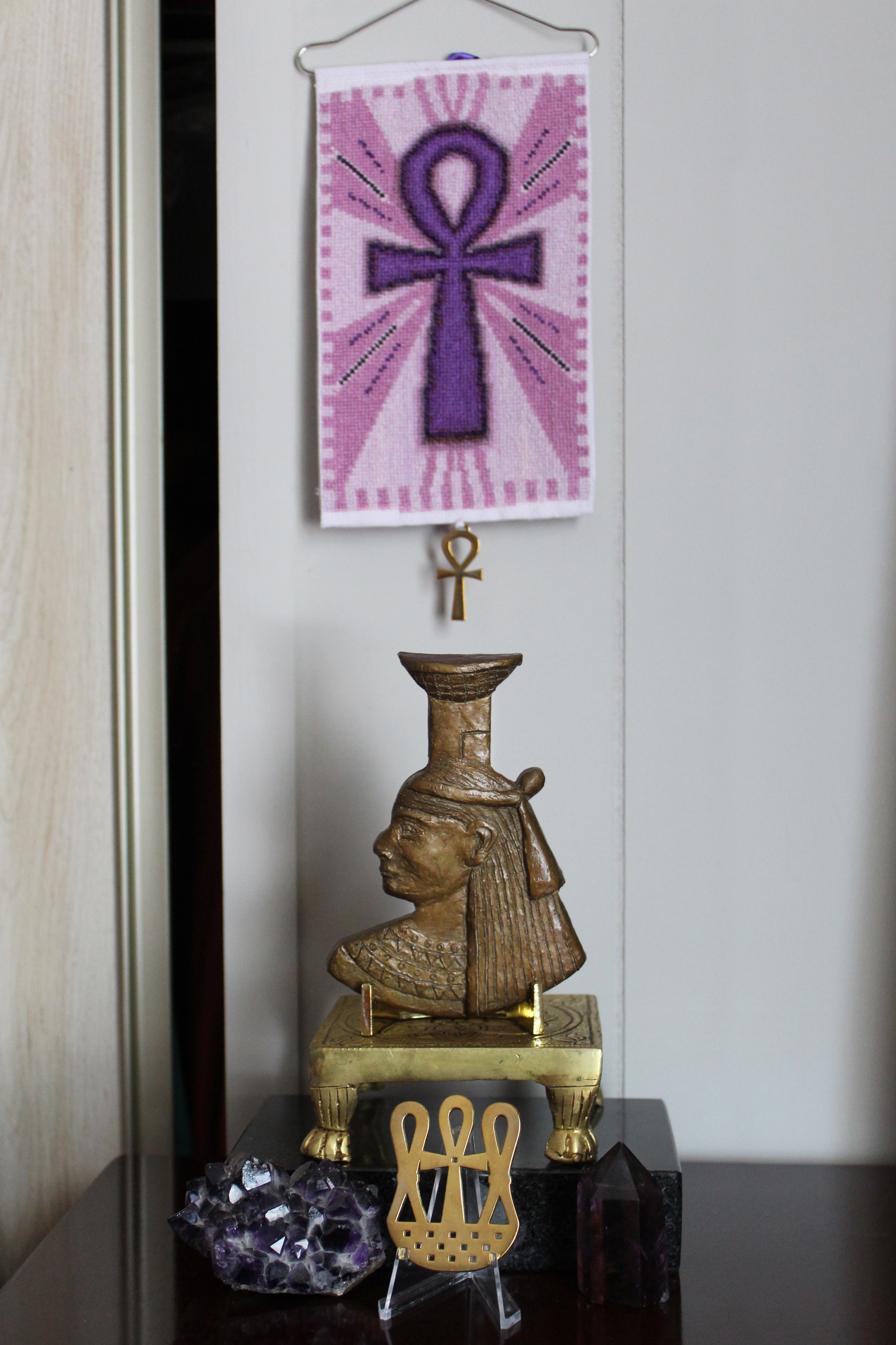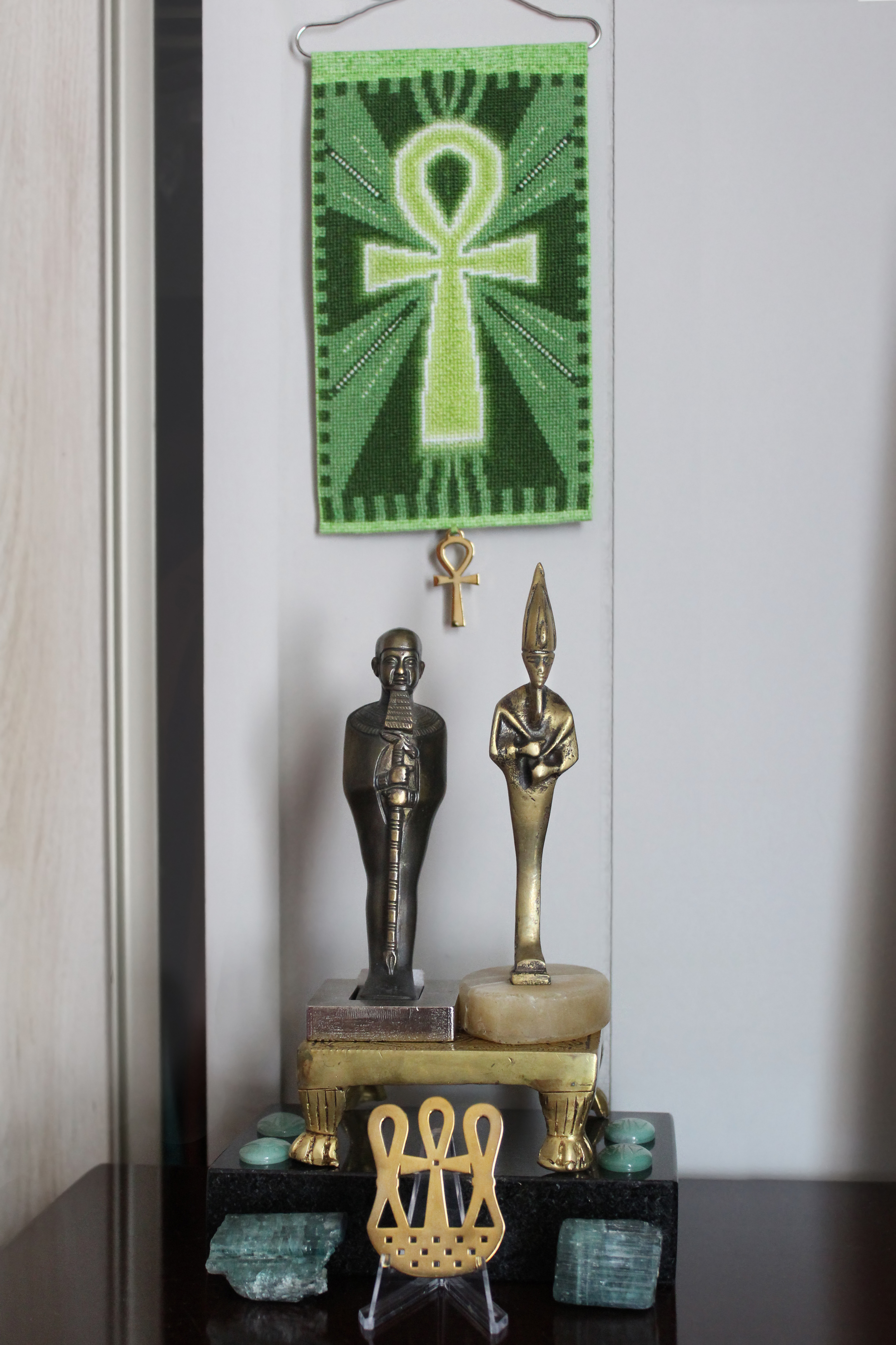 The purple and green ankhs... Nebthet with the purple ankh; Ptah and Wesir (Osiris) statues, I like this combo....