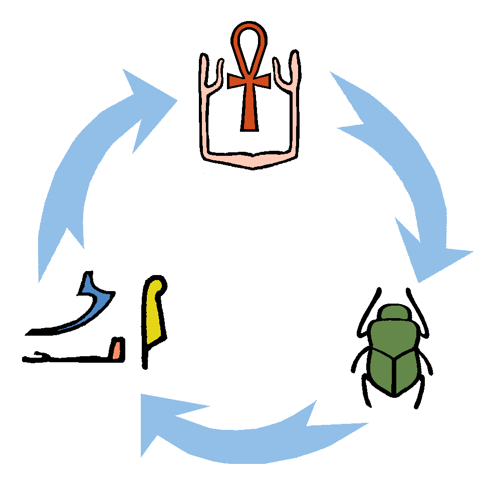 "The biology of the insect thus seems to underlie the name of the god as Khepri suggests the Egyptian verb kheper: 'develop' or 'come into being'. As the 'developing one' Khepri [is] the god of the first sunrise at the dawn of creation, and was thus linked with Atum as Atum-Khepri." (Wilkinson, Complete Dictionary of Gods and Goddesses, page 230)