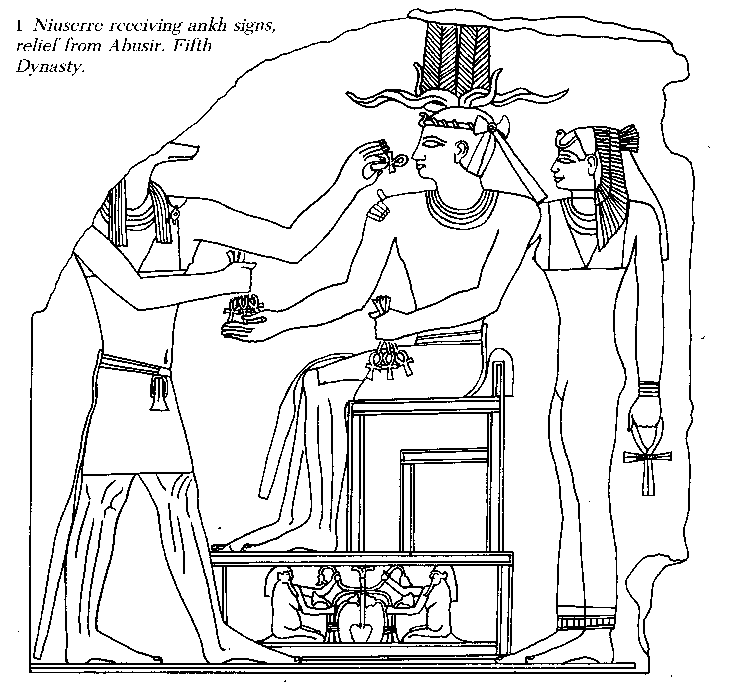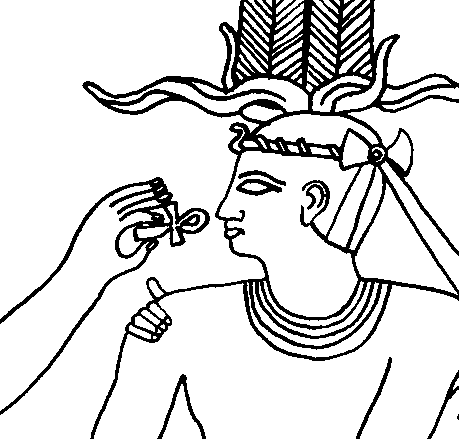 ![]() A king receiving life (excerpted from Wilkinson's illustration of Niuserre's relief at the Berlin museum (Reading Egyptian Art, page 176)